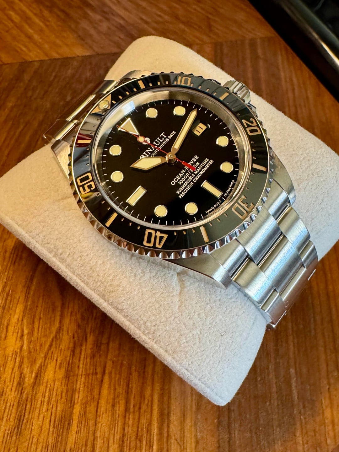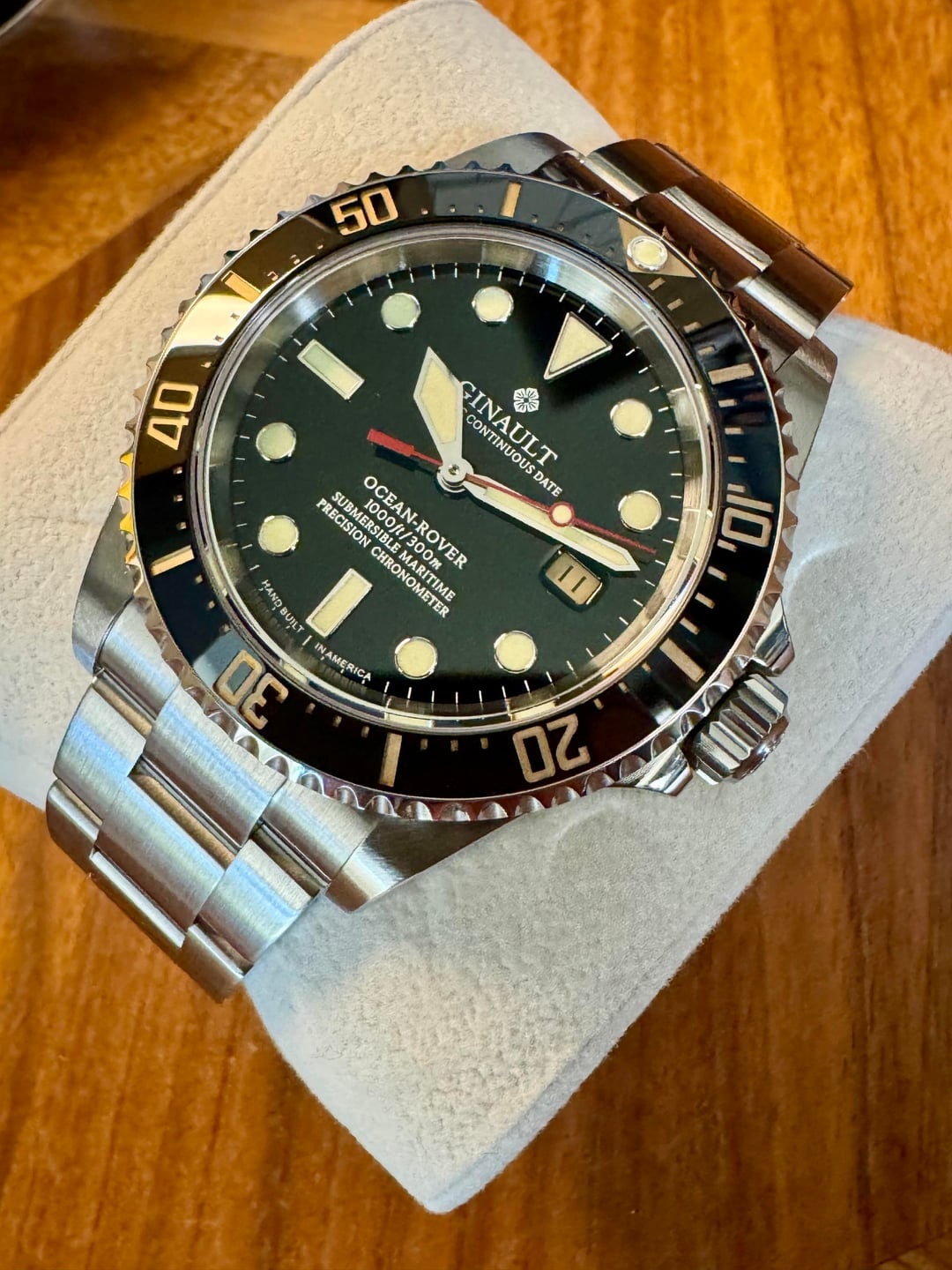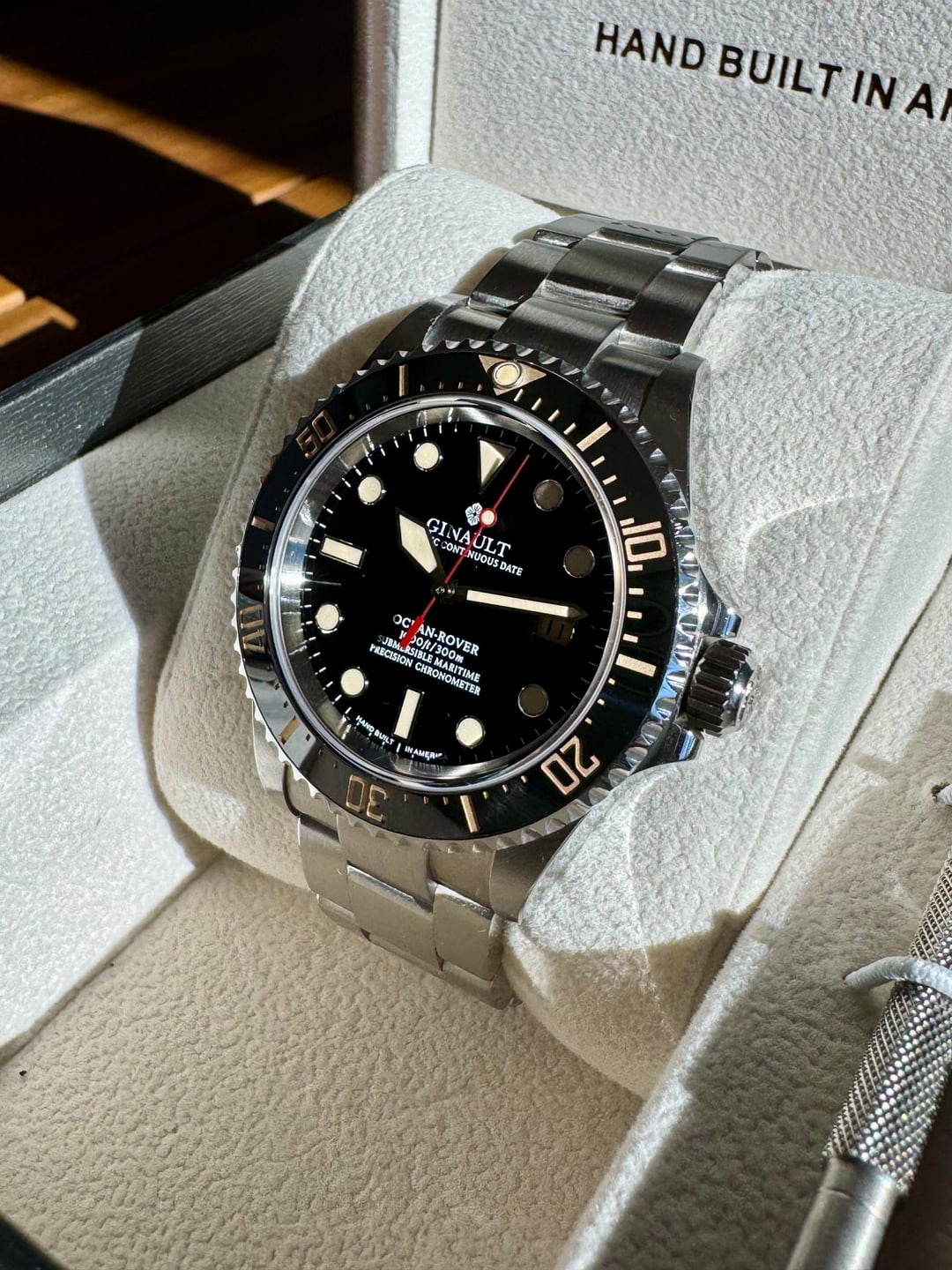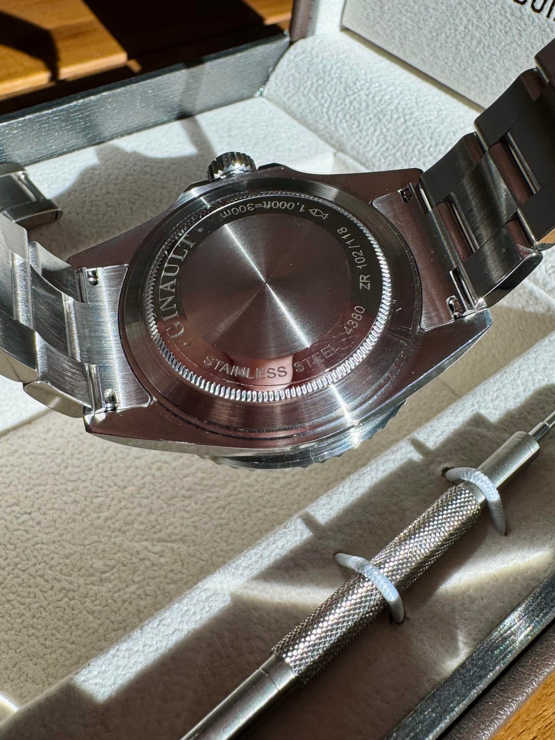 Selling a Ginault Ocean Rover 2.5. This variant comes with gold sand lume indices with matching bezel and date wheel. Sized an unworn. Condition is like new with some HD plastics installed. The mk 2.5 ORs come with updated bezel action, thinner case at 11.5mm, and further updated bracelet from the 2.0 models. This watch has the Sellita SW200-1 Elabore grade running near perfect at +1 sec per day. High gloss enamel dial with forged indices and hand assembled. 20mm lug width, 47.7mm wingspan, and 11.5mm thin. Excellent proportions for many wrist sizes. Manually winding the crown also winds the rotor which after researching is not uncommon with this particular Sellita movement. Please reach out with any questions. Asking $1100 shipped CONUS