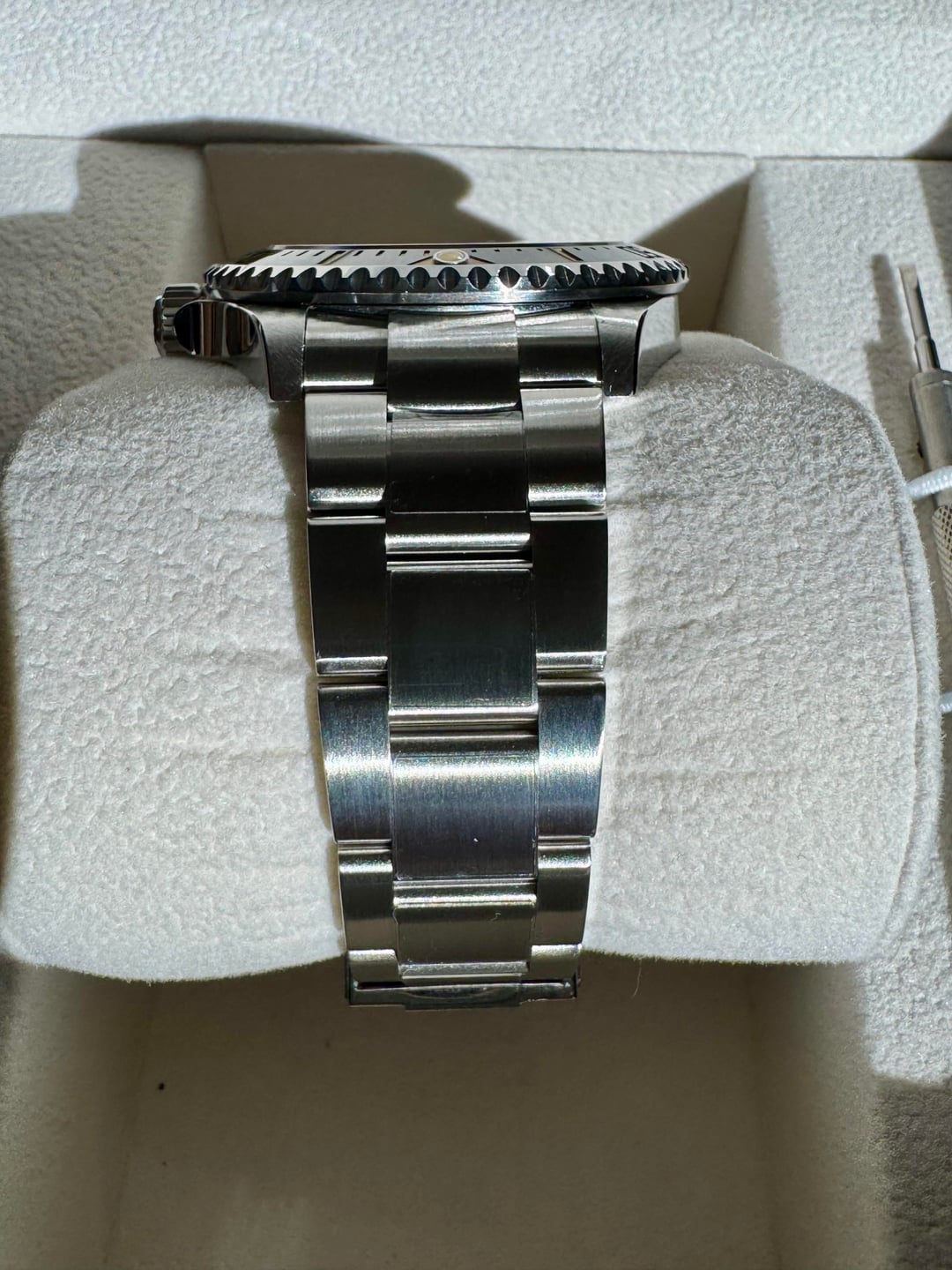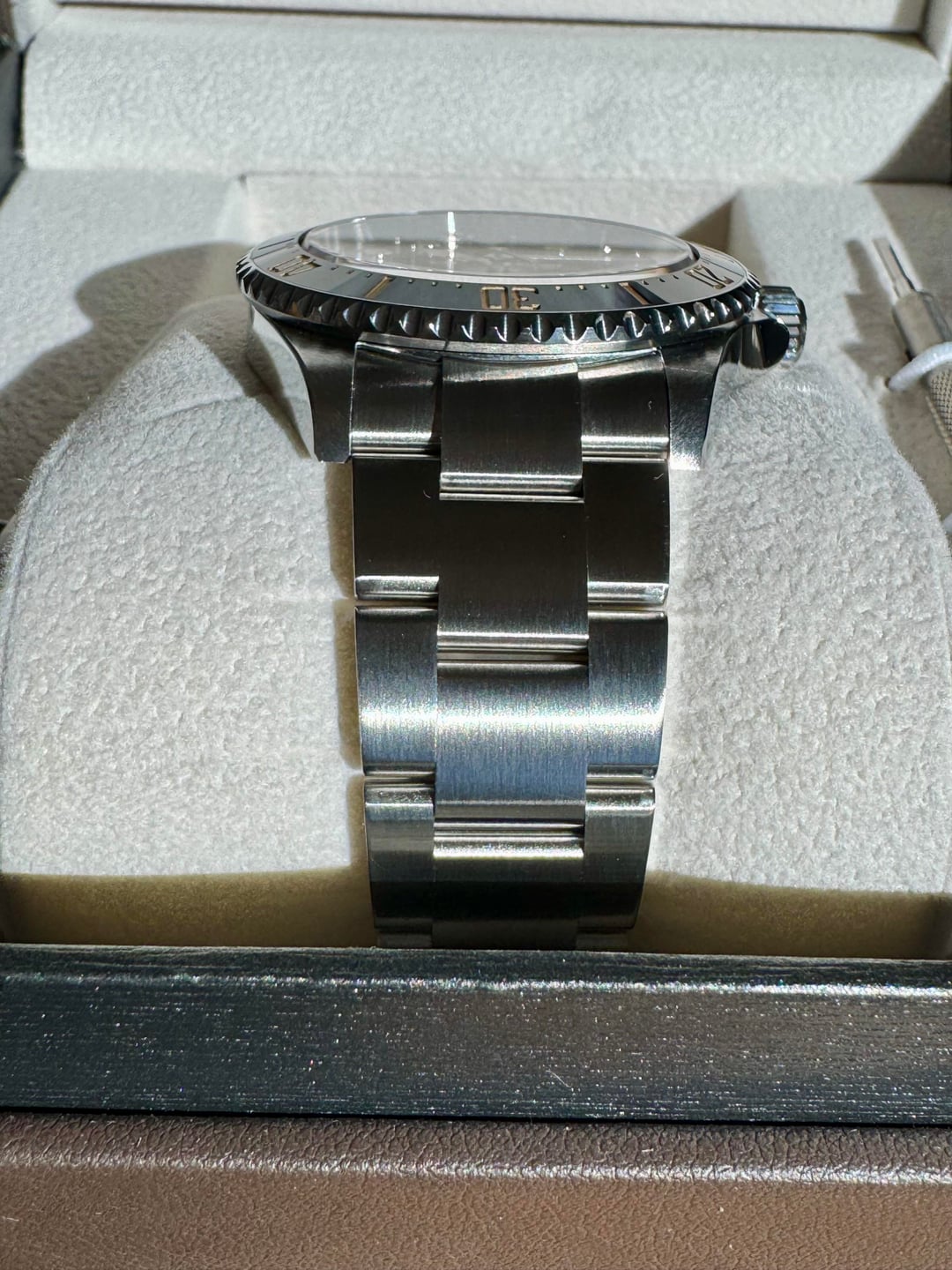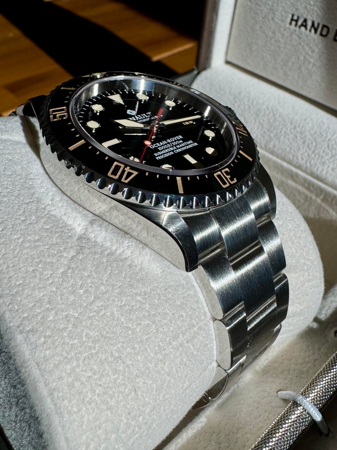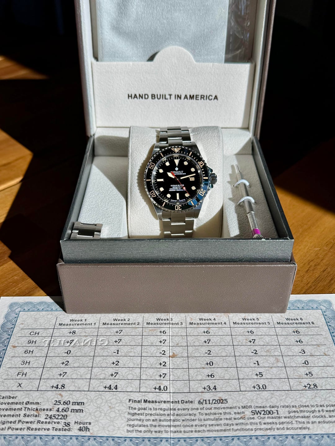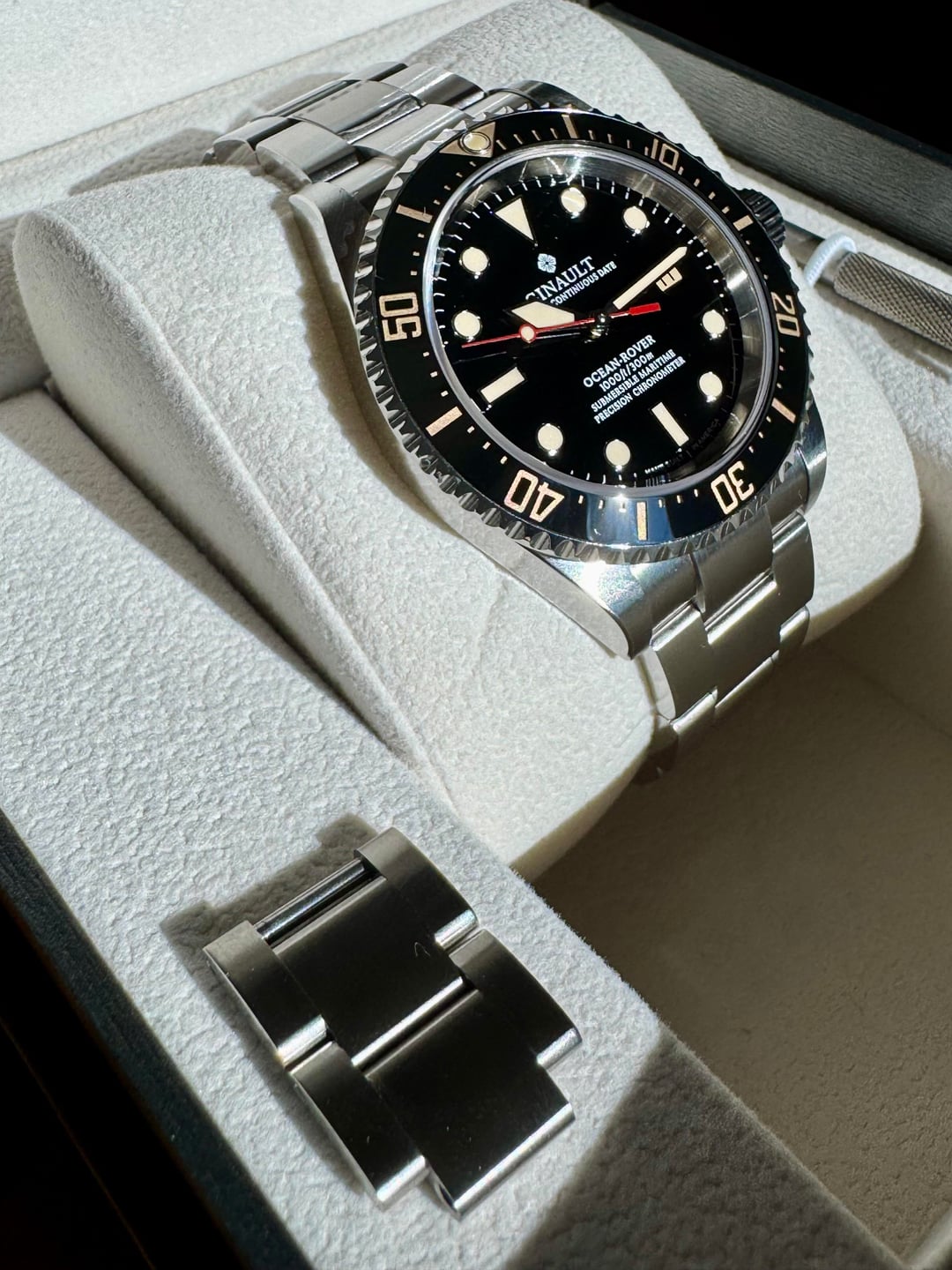 Selling a Ginault Ocean Rover 2.5. This variant comes with gold sand lume indices with matching bezel and date wheel. Sized an unworn. Condition is like new with some HD plastics installed. The mk 2.5 ORs come with updated bezel action, thinner case at 11.5mm, and further updated bracelet from the 2.0 models. This watch has the Sellita SW200-1 Elabore grade running near perfect at +1 sec per day. High gloss enamel dial with forged indices and hand assembled. 20mm lug width, 47.7mm wingspan, and 11.5mm thin. Excellent proportions for many wrist sizes. Manually winding the crown also winds the rotor which after researching is not uncommon with this particular Sellita movement. Please reach out with any questions. Asking $1100 shipped CONUS