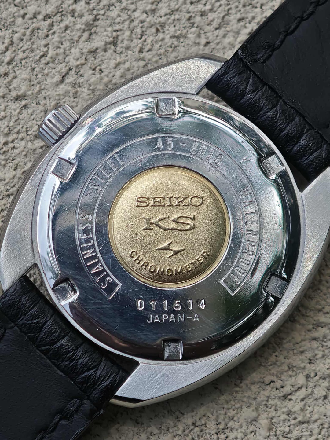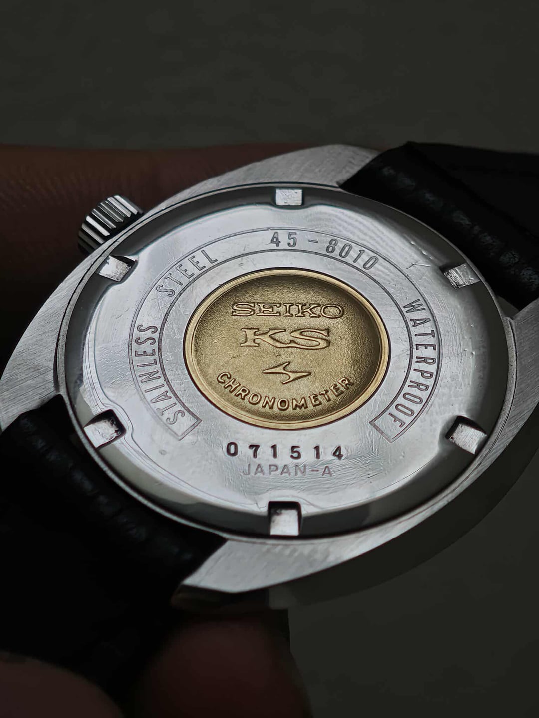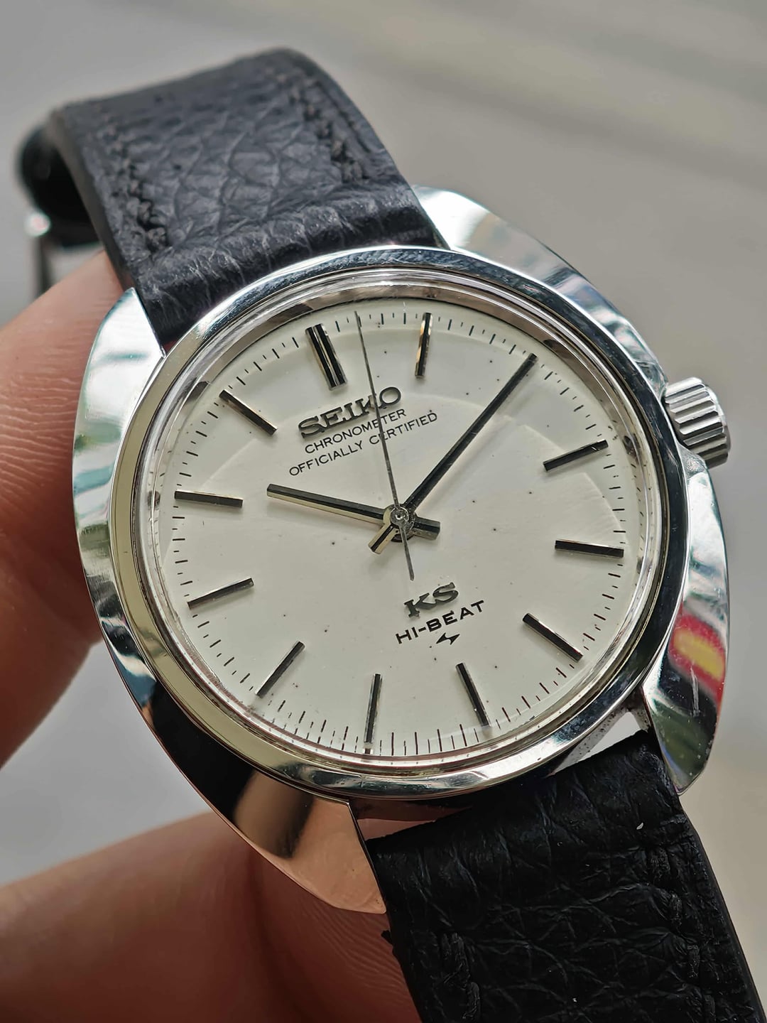 Up for sale is a King Seiko 45-8010 Chronometer from July 1970, one of the pinnacles of Japanese watchmaking. Quick Specs Condition: Beautiful vintage condition, sharp case lines, intact gold medallion caseback. Service: Freshly serviced, running strong. Movement: Manual-wind Caliber 4520A Hi-Beat (36,000 bph), chronometer-rated. Dial: Clean silver, no date window (pure dresswatch aesthetic). Details: KS signed crown, applied KS logo, \~36mm case size. Price: $600 shipped (tracked worldwide shipping included). Why this watch matters In the late 1960s, Grand Seiko (Suwa) and King Seiko (Daini) were in a heated rivalry to build the most accurate mechanical watches in Japan. The 45KS Chronometer series was the answer: a manual-wind, hi-beat chronometer-grade movement regulated to compete with the best Swiss houses. The Cal. 4520A is considered one of Seiko’s finest hand-wound calibers — beating at 36,000 bph for precision — and the “Chronometer” inscription is historically significant, as Seiko stopped using it after disputes with Swiss COSC. The 45-8010 reference stands out as one of the purest executions: no date window, sharp Grammar of Design case, and a gold medallion caseback. Collectors often call King Seiko the sleeper line, but this model shows it deserves to be mentioned in the same breath as vintage Grand Seiko. A true gem from July 1970 — clean, serviced, and ready for the next collector.
