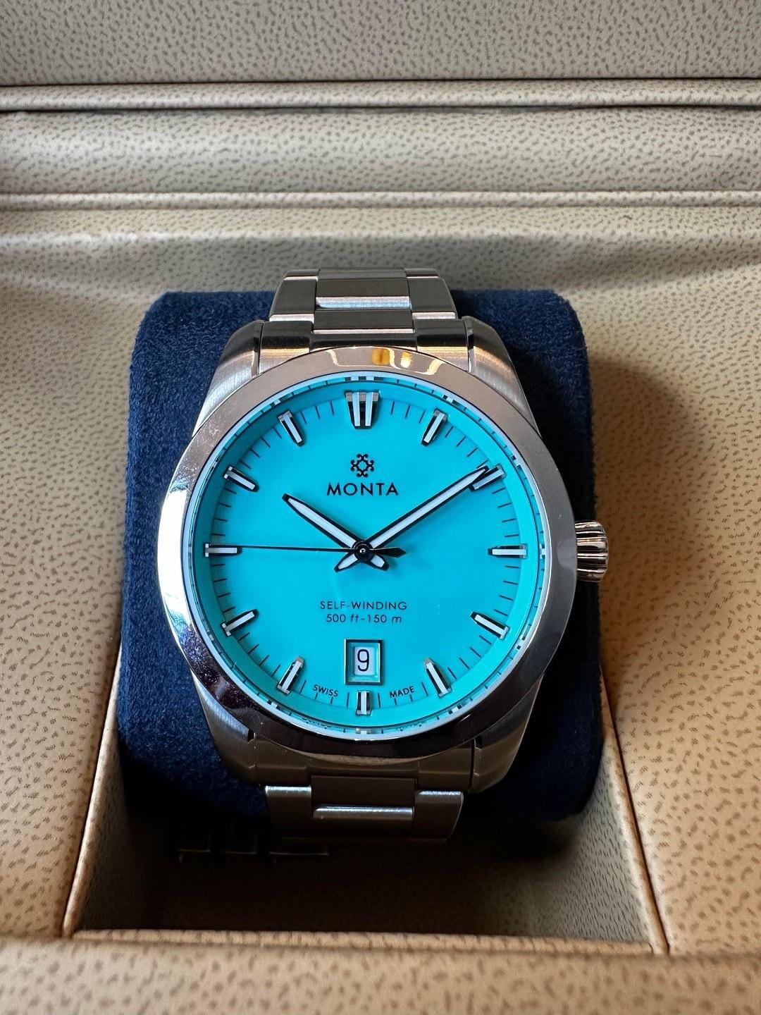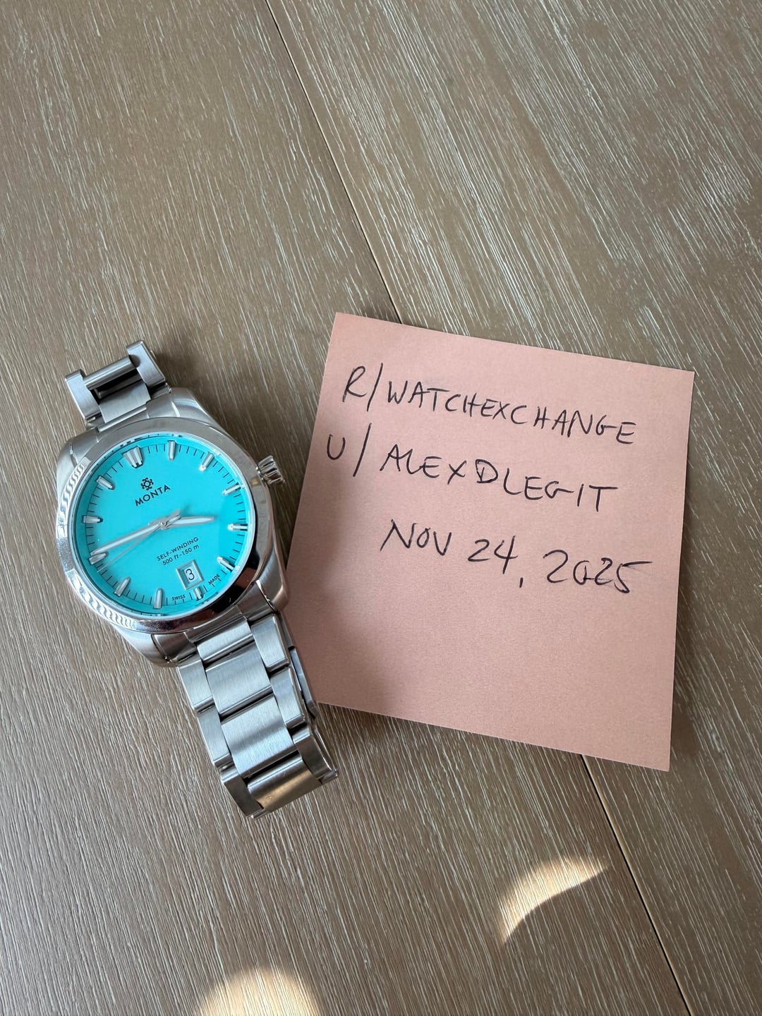 Hello r/watchexchange, for sale here is my Monta Noble Turquoise. This watch was a limited edition of 100 and is now sold out. OEM listing (of the blue dial version): https://montawatch.com/products/monta-noble-blue-dial Included: Watch, full links, original box, and all original materials. Condition: Excellent - no marks on glass, no notable marks on the case. This watch was worn less than 10 times. Photos & timestamp above Price: $1️⃣2️⃣0️⃣0️⃣ OBO including shipping Payment: Venmo F&F, PayPal F&F, or Zelle No trades at this time