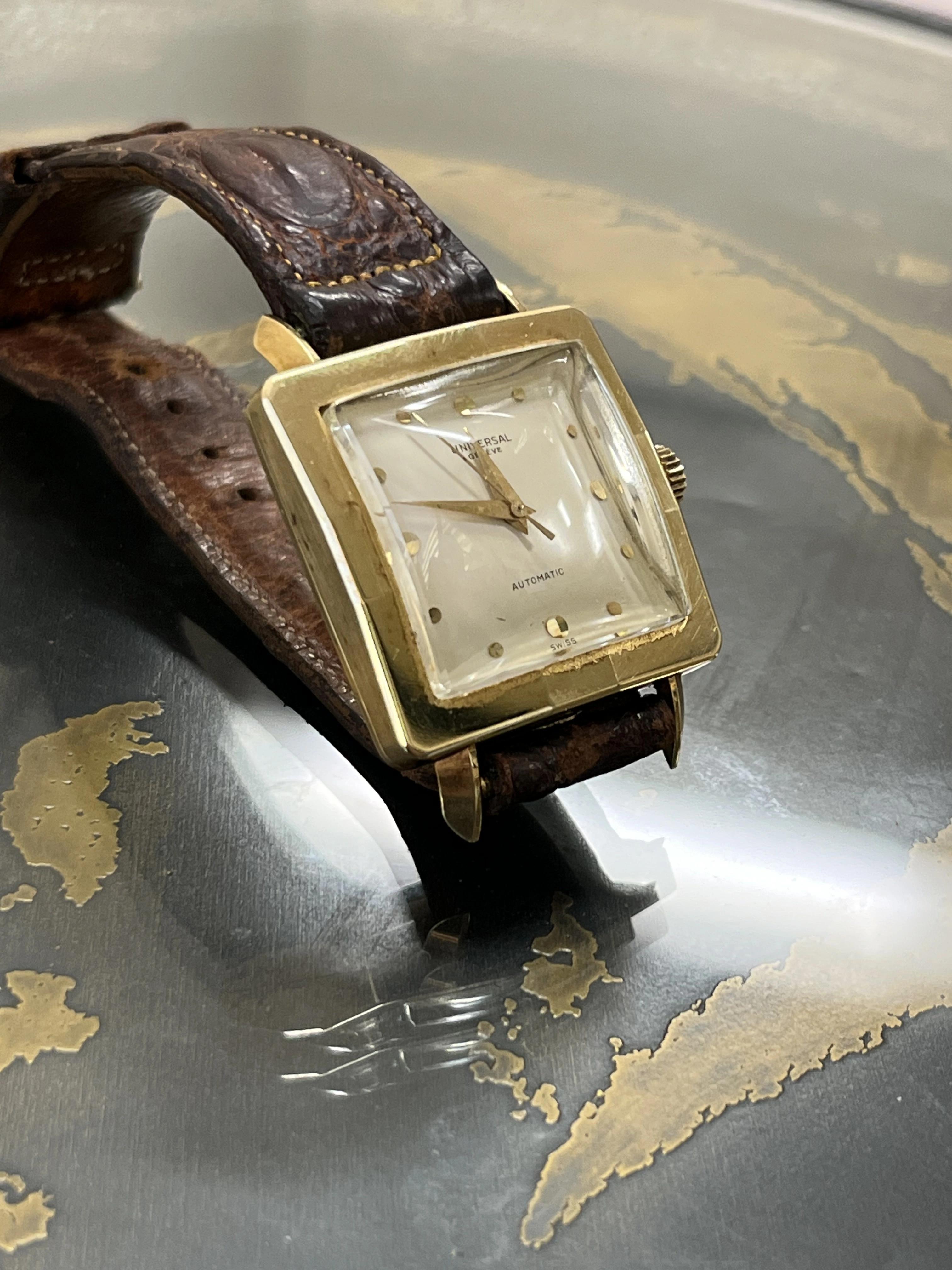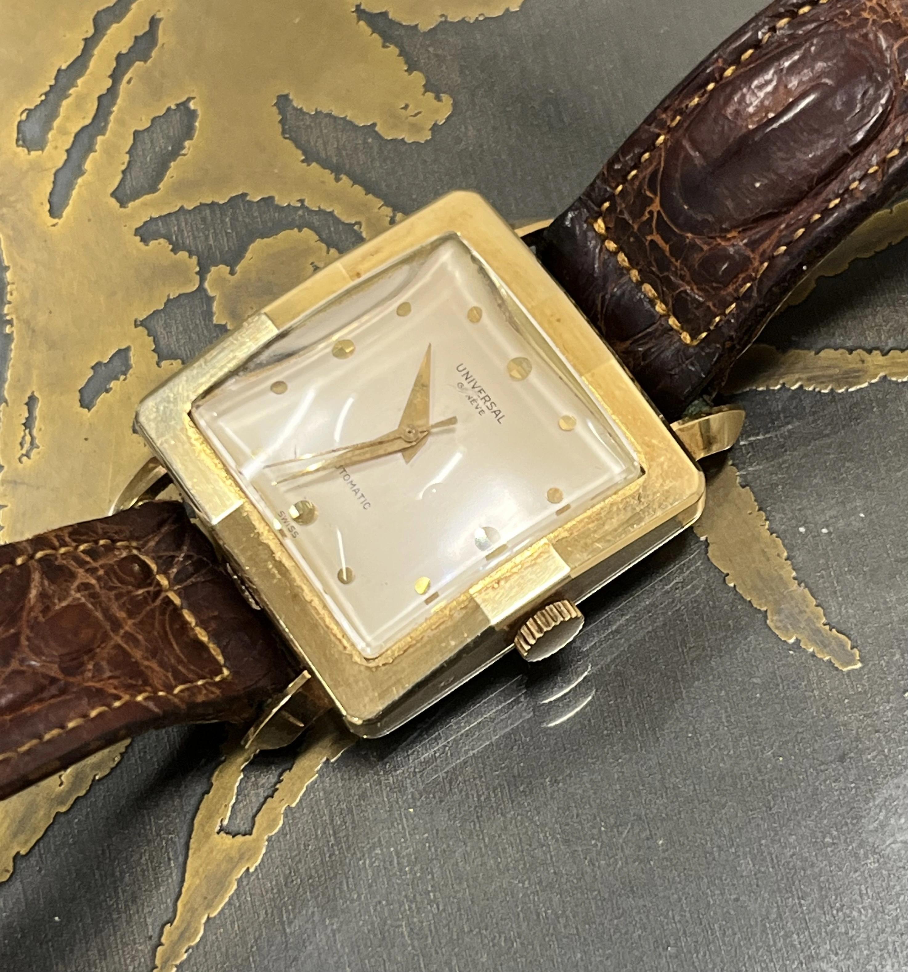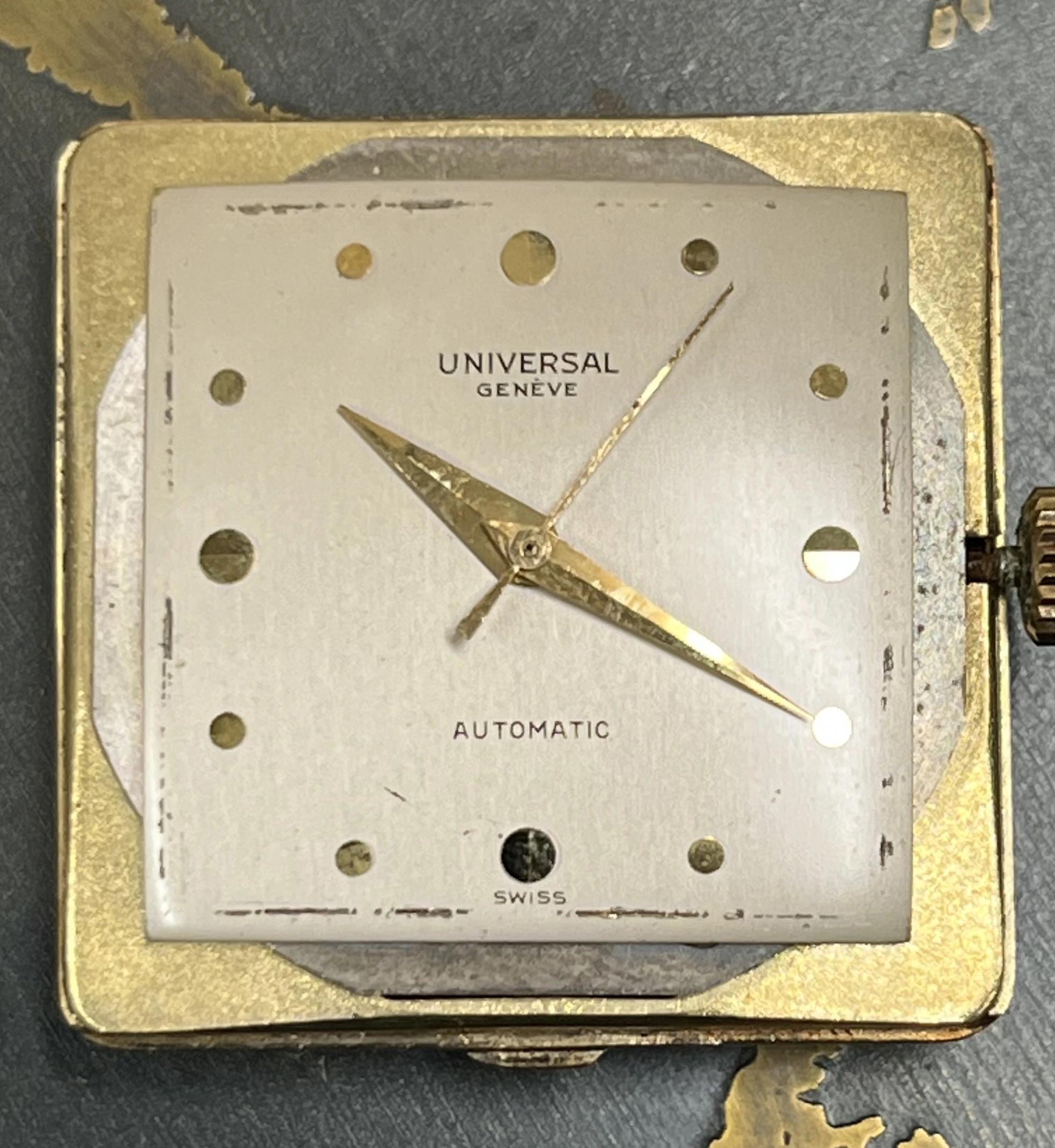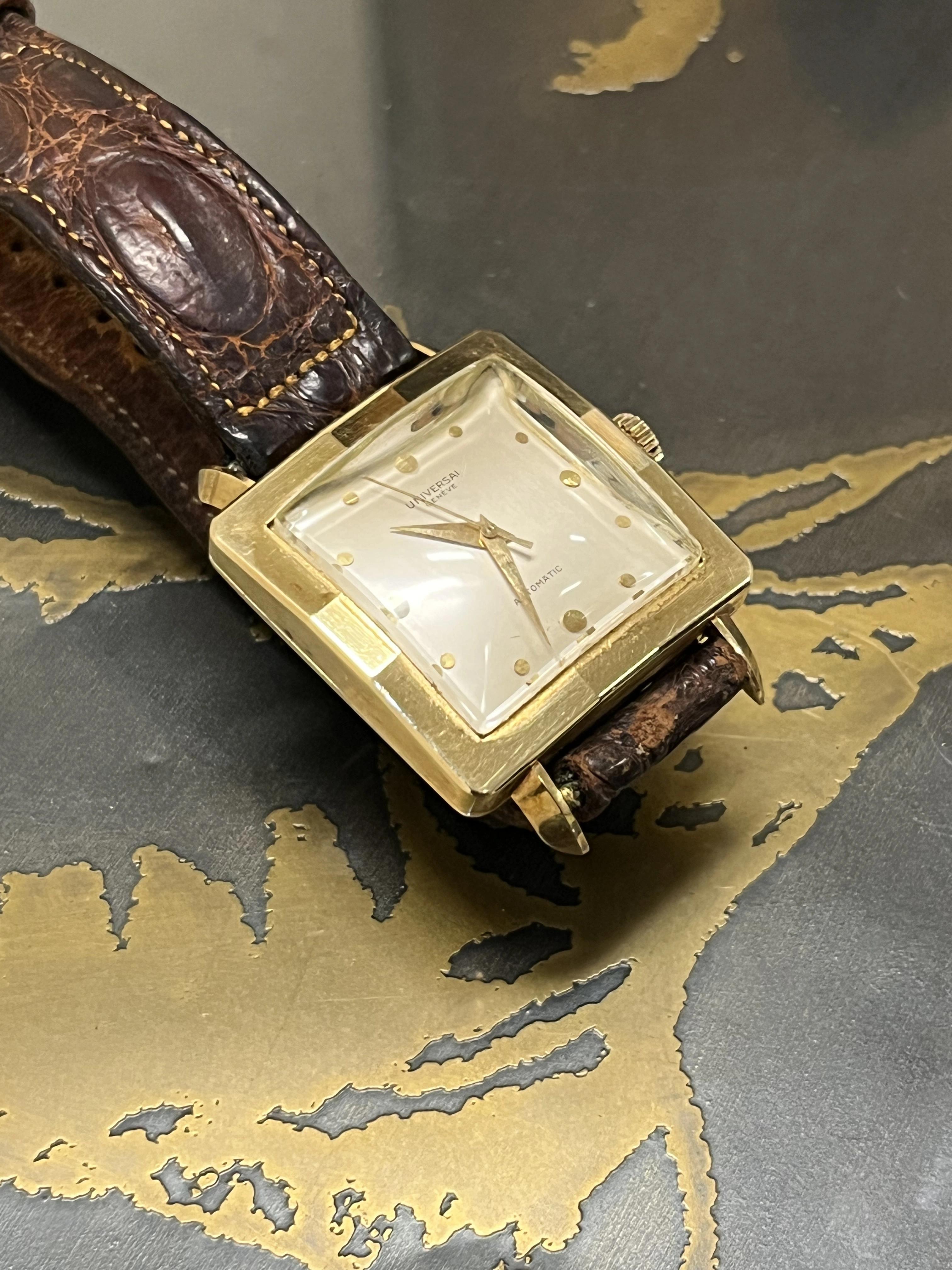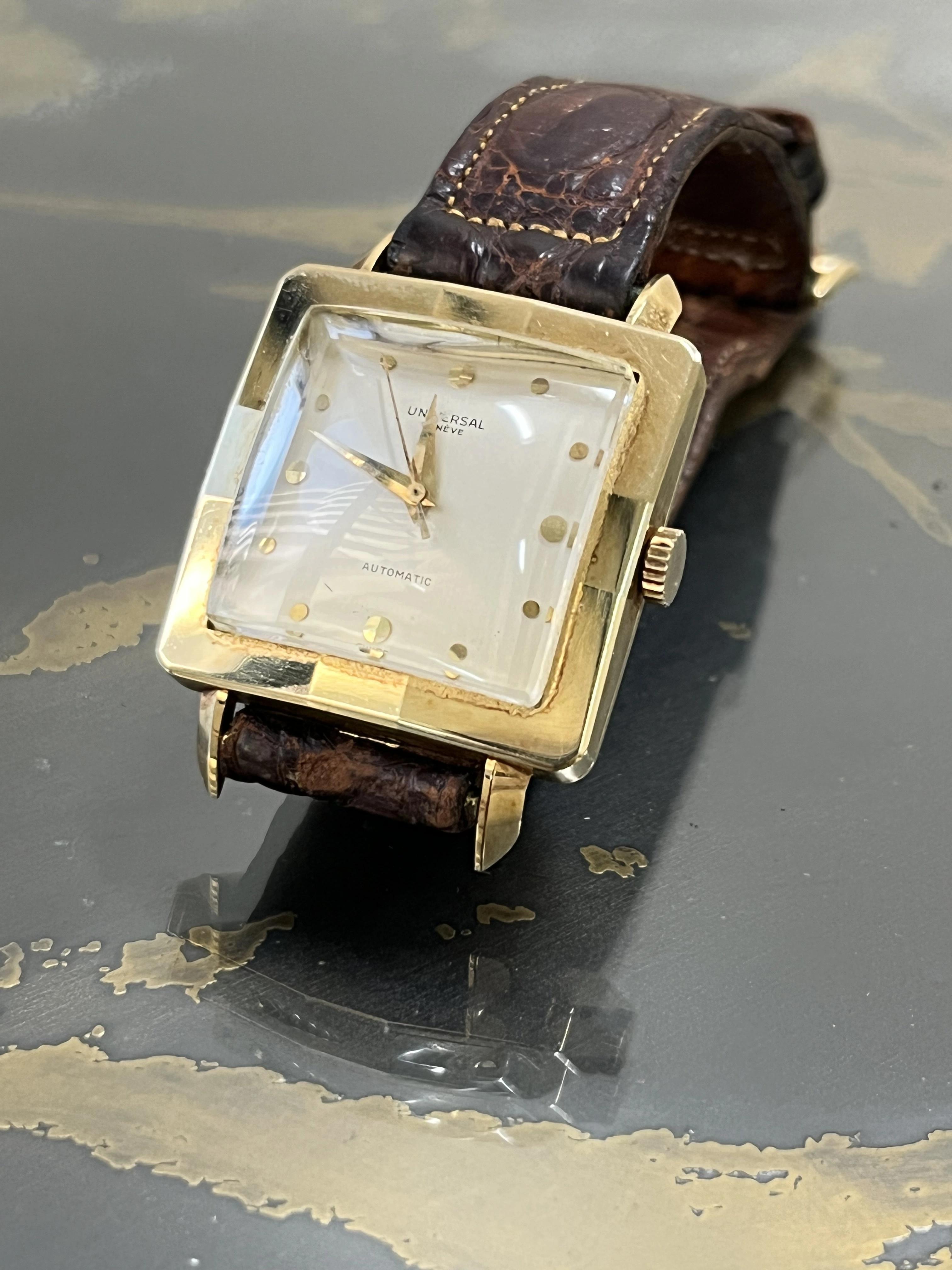 Hello up for sale is a rare and beautiful, vintage (circa 1950s from my research) Universal Geneve 30mm x 30mm 14k YG with caliber 138ss automatic bumper movement.