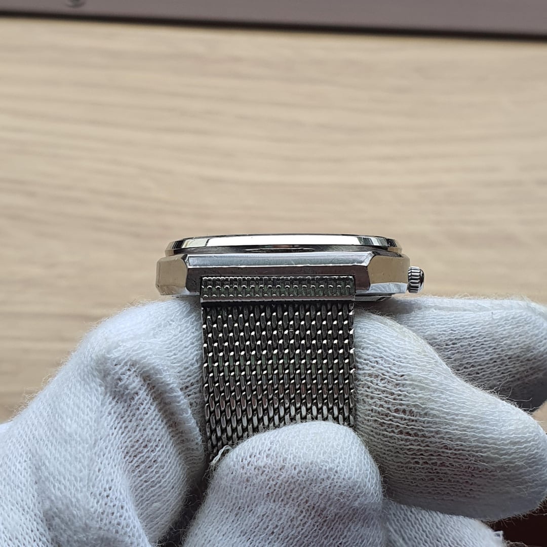 For sale is this vintage Seiko Lord Quartz, made in Japan, in April of 1978. Lord Quartz the premium mid-range series just under the Grand Quartz and King Quartz series during the golden age of quartz when quartz watches were more expensive than their mechanical counterparts. The 1978 Seiko catalog states that the Lord Quartz series was aimed at young businessmen. They featured the beautiful calibre 7853 movement which has a stated accuracy of +/- 10 seconds a month - a very decent performance (e.g. Casio f-91w has a stated accuracy of +/- 30 seconds a month). The briefing for Lord Quartz watches was to be slim and elegant. This model, reference number QHY030, has an intricate textured cream dial that is in a grill-style pattern. The sharp stick baton indices have a high-polish finish with a black centre. The pencil hands are ink black to contrast with the dial. The Seiko logo and single crystal quartz symbol are applied. The Suwa swirl symbol at the bottom of the dial and on the case back indicates that the watch was designed and manufactured by the Suwa factory during their fierce rivalry with the Daini factory. The case has a hidden lug design that gives the watch a very clean look. The top surface is finely brushed while the chamfer and sides are high-polish. The watch is very slim at just 8.4mm and has a screw-down case back to improve its water resistant capabilities, although I cannot guarantee any water resistance given it is vintage. The day wheel can be in English or Japanese Kanji with Saturday being in blue, Sunday in red and the rest of the days in black print. It comes on a JDM "Bambi" branded Milanese mesh bracelet with adjustable length. The watch is in good condition considering it was made almost 50 years ago. The original finishing is still intact, minor general wear and some scratches to the crystal. No problem with the time and functions. Looking for $150 net (buyer pays Paypal fees) + shipping Dimensions are: 33.6mm x 39mm x 8.4mm Lug Width 18mm Bought in Japan. \*Returns accepted but return postage costs are the buyer's responsibility in all circumstances and any import charges that we have to pay when receiving the item will be subtracted from the refund amount.