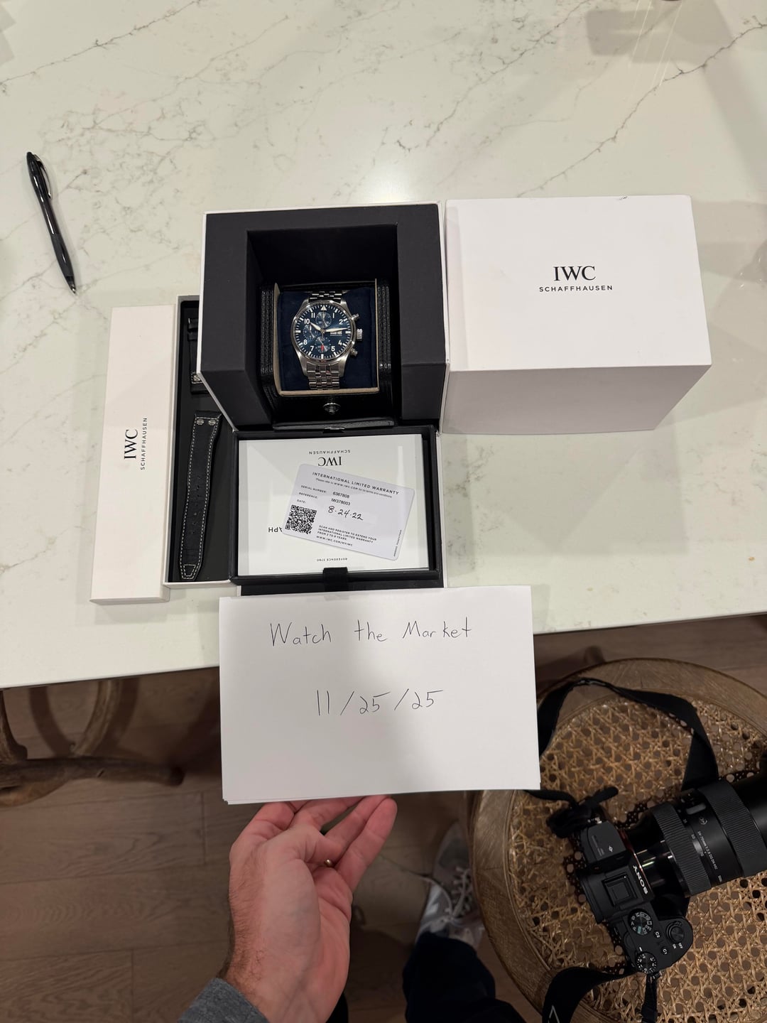 IW378003 43mm chronograph! -Came on strap originally but also includes bracelet. Very nice and valuable addition -great shape -full set 2022 -Asking $5,500 + label. This is cheaper than all comps, which don’t include bracelet.