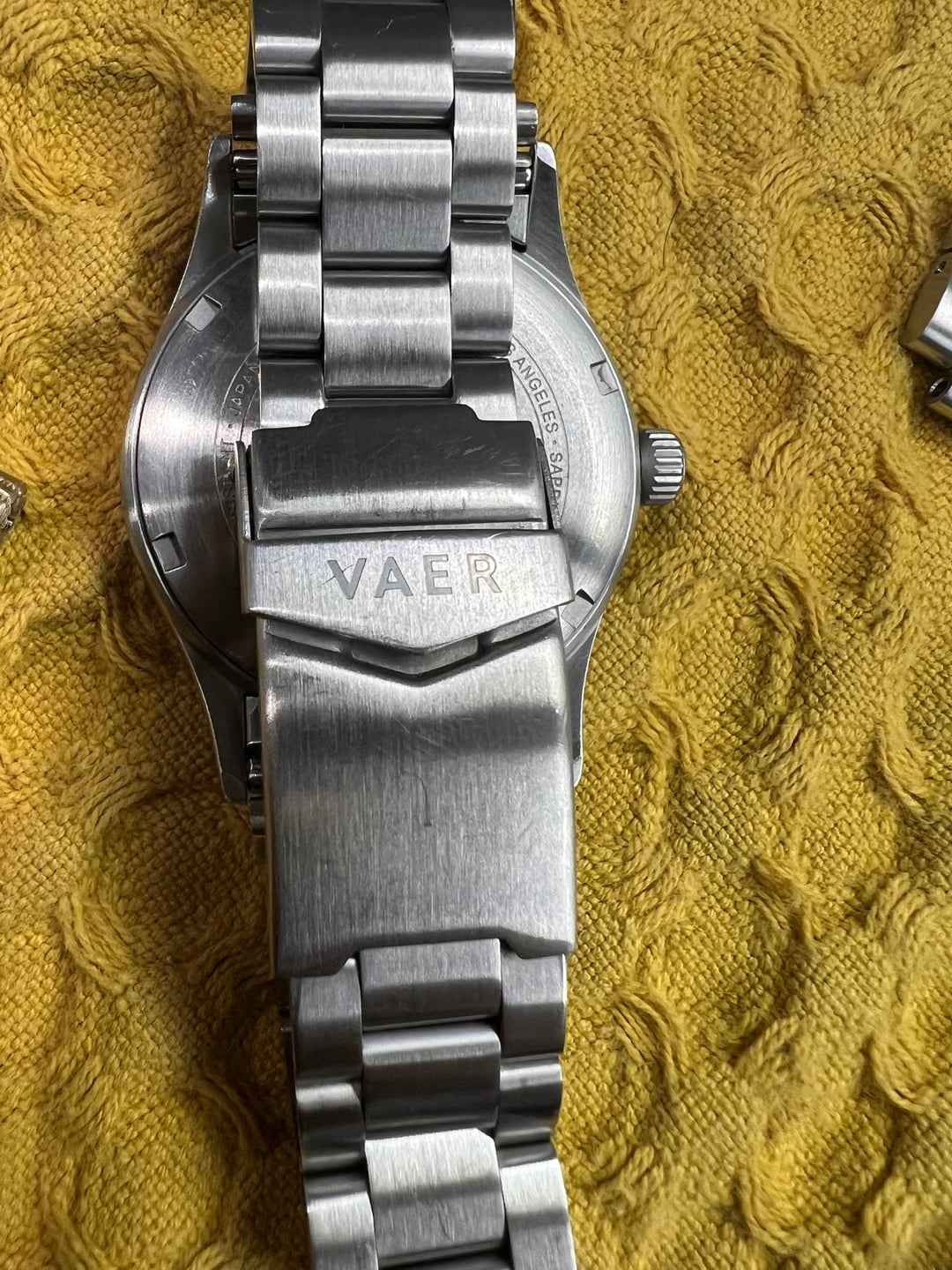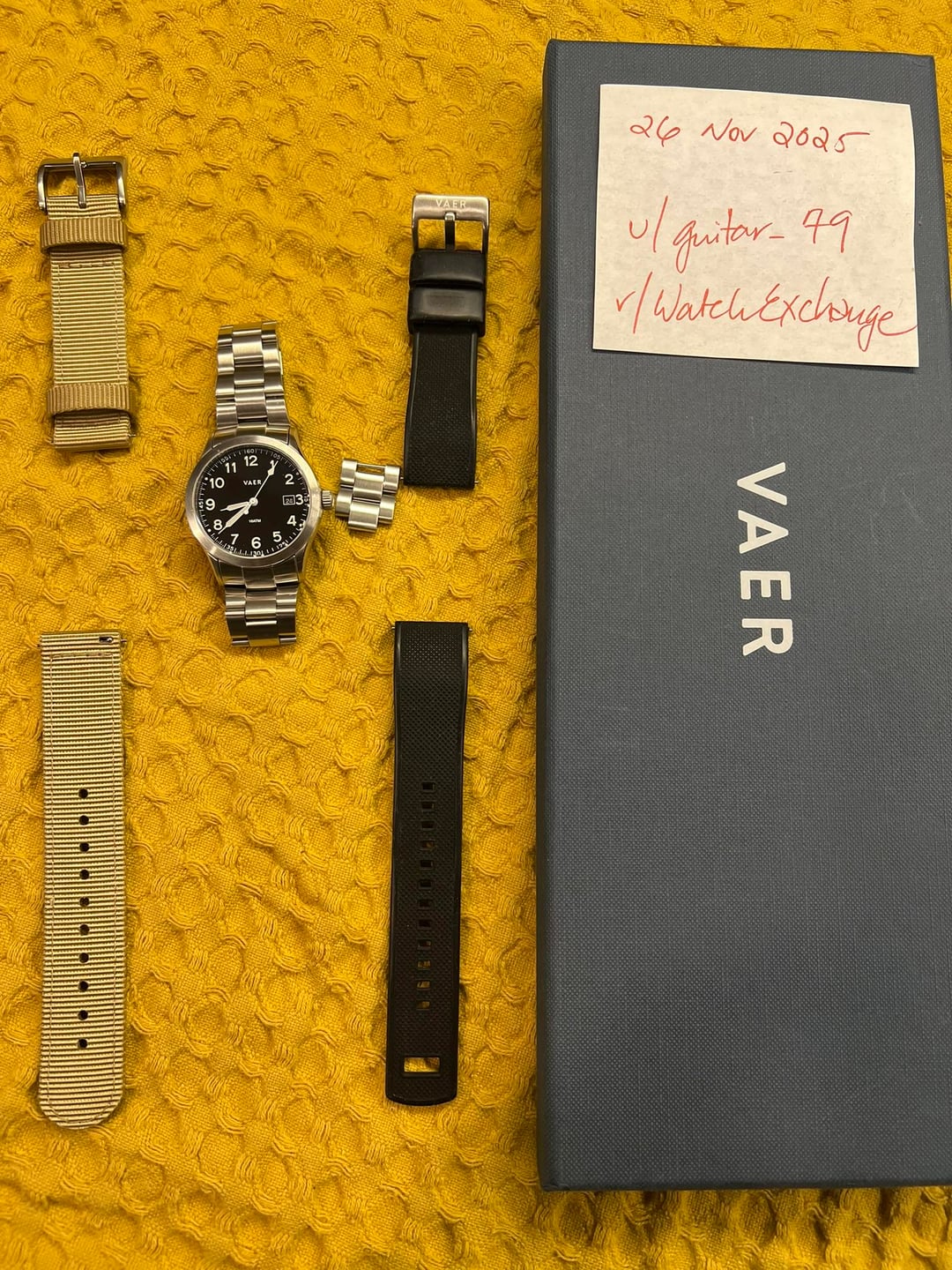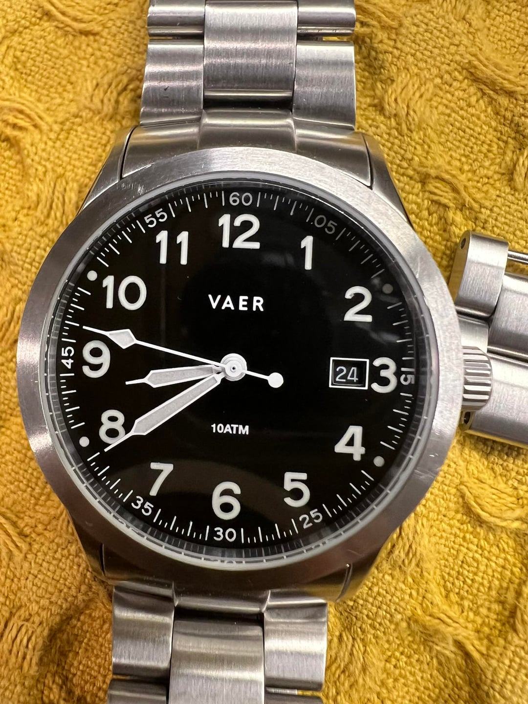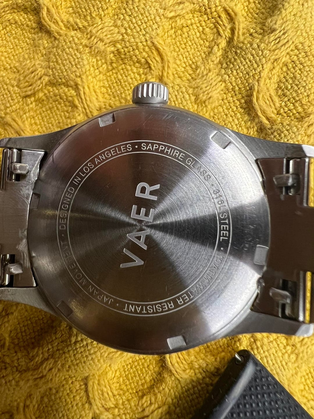 Slimming down my collection again, selling my quartz 36mm black dial Vaer S3 full set watch. Case and bracelet have a few stratches and wear marks. Please see all pictures. The watch works as it should. Includes box, catalogue, and quick-release Vaer stainless steel bracelet, black silicone strap and un-worn nylon kahki strap. Price: **$165** shipped Conus *\*\*\*Will ship after Thanksgiving weekend\*\*\** Payment: Zelle (preferred), PayPal F&F, or PayPal G&S (Buyer pays fees) Not interested in trades at this time.