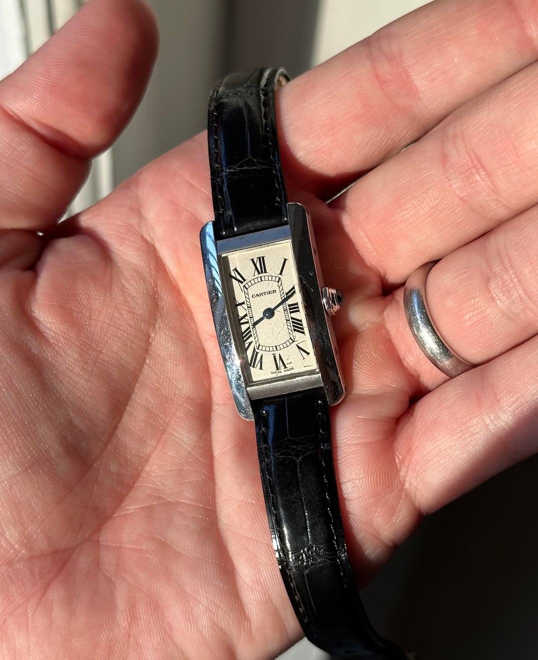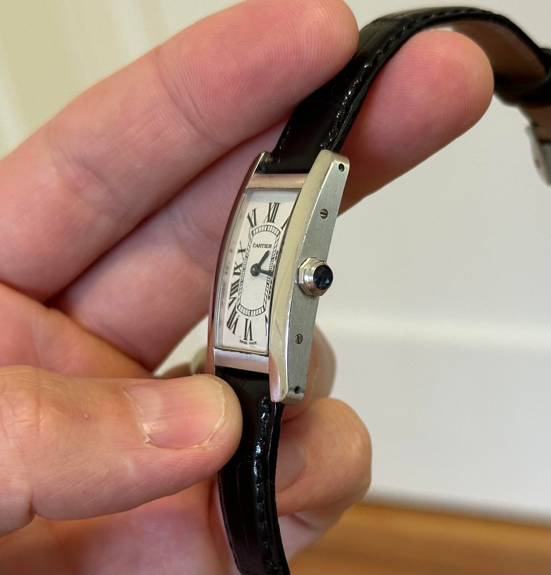 Up for sale is a Cartier Tank Americaine, small size in 18k white gold. The reference on this tank is W2601956. This is the small, quartz version of the watch. This watch has been well loved. It has scratches on the case and on the sapphire crystal. The dial is a light cream color. I think the watch has some very nice charm to it. The watch comes with an 18k white gold Cartier buckle. **Price:** $3,250 **Timestamp:** in photos **Videos:** I can send a video of the watch through my instagram, @WarmDials **Payment and Shipping:** to be agreed upon by the buyer and myself, taking the buyer's purchase history into consideration. I'm located in the United States and frequent user in this community. I have bought and sold often, and I'm happy to answer any questions you may have / provide more photos or a video. You can find me on instagram at @WarmDials. Don't hesitate to reach out if you have any questions or want to chat