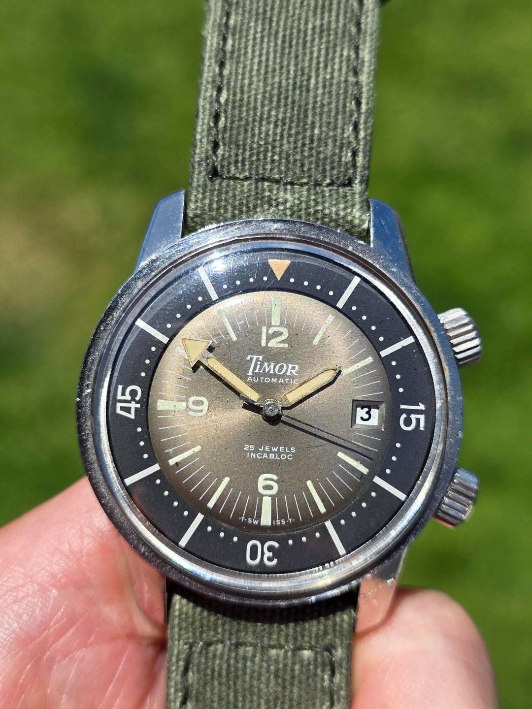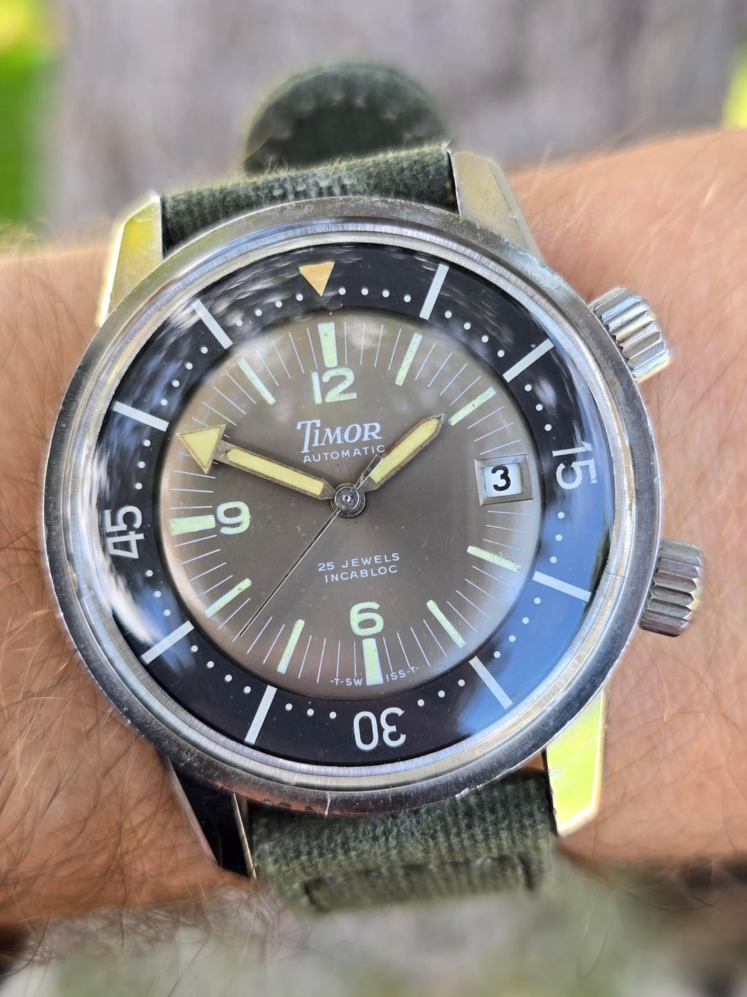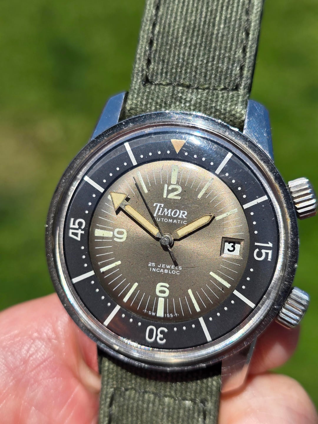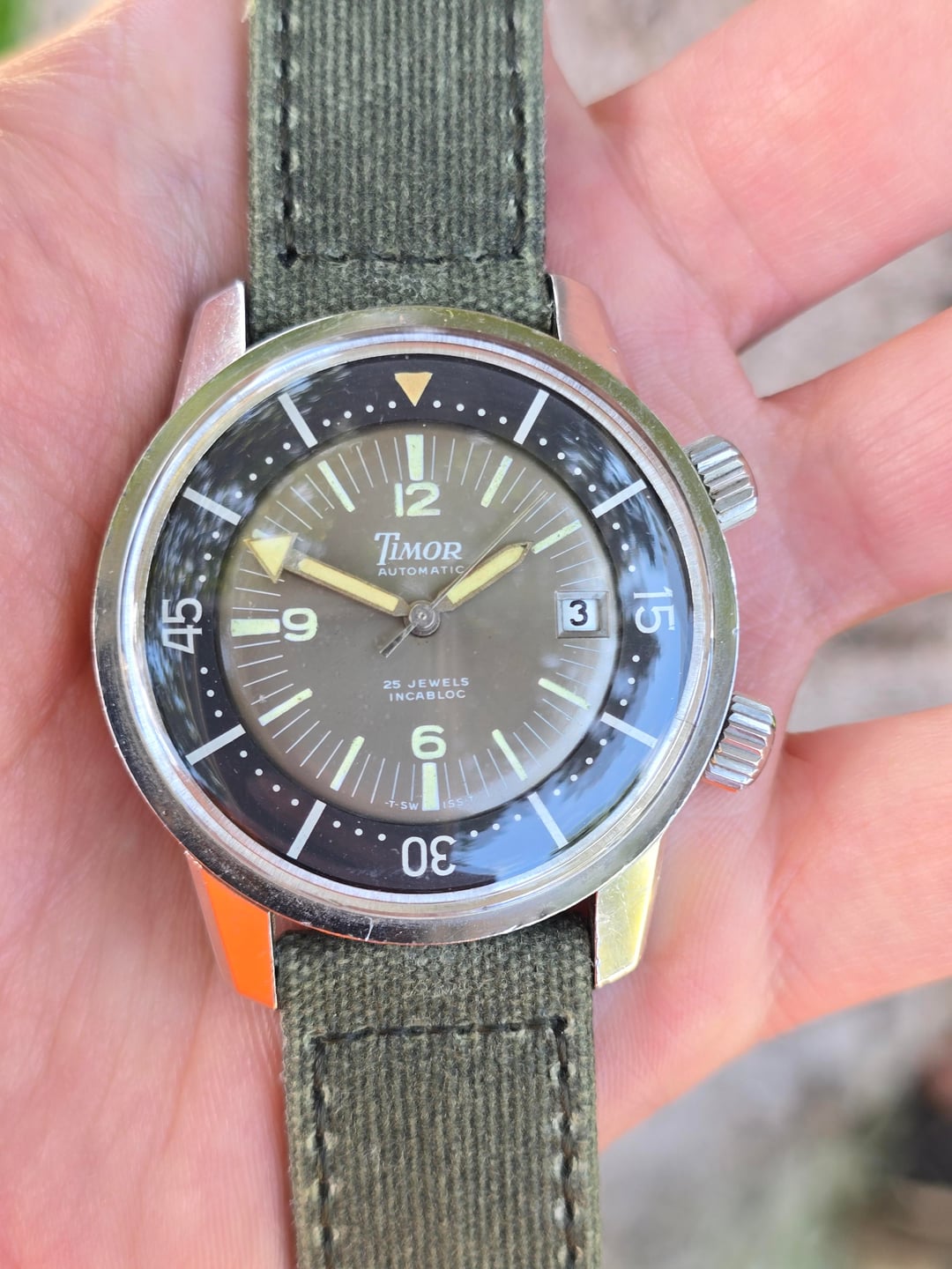 Timor super compressor 40mm automatic from 1968 This is an awesome vintage diver that is very rare. Timor is one of the Dirty Dozen companies, and this watch has its original crowns and has a very nice aged "tropical" dial. Watch comes as pictured, it is in Vintage condition and shows markers and wear, It is functioning and running as it should, Date works and its keeping good time, service history is unknown. The watch is on a very nice wax canvas style strap. There is not a single one of these 40 mm Super compressor Timor watches on the internet. I'm asking 1450 shipped Conus and except zelle and PayPal FF for outstanding members of the community. Thanks for looking, and enjoy your time!