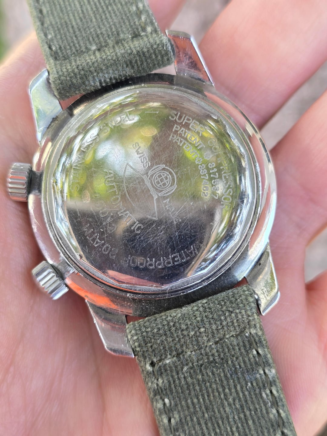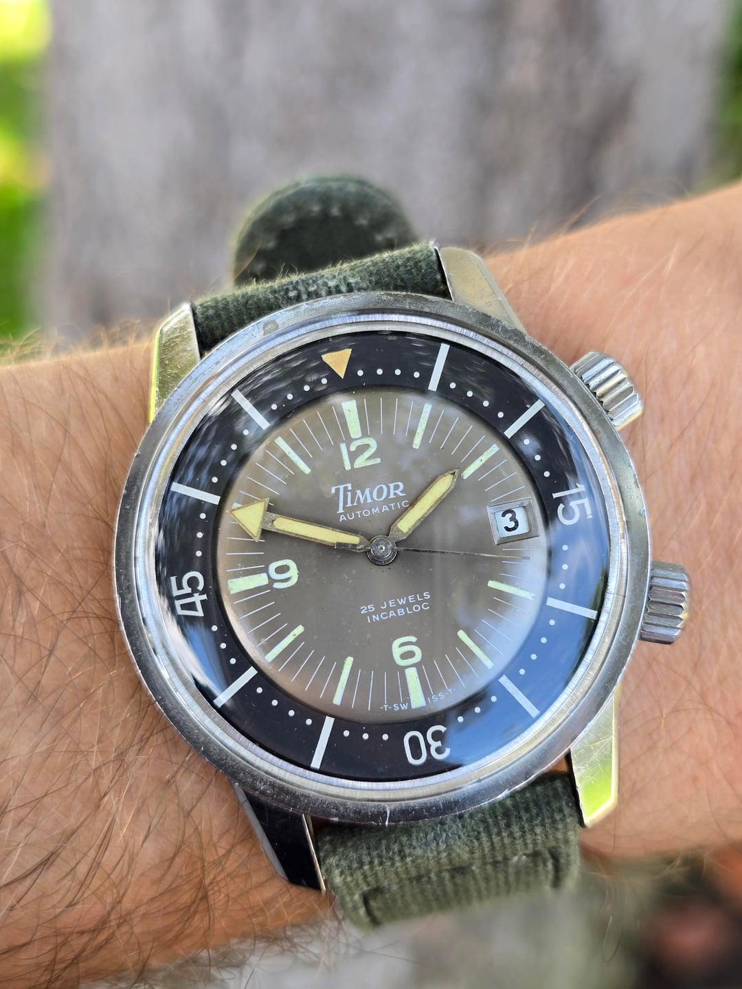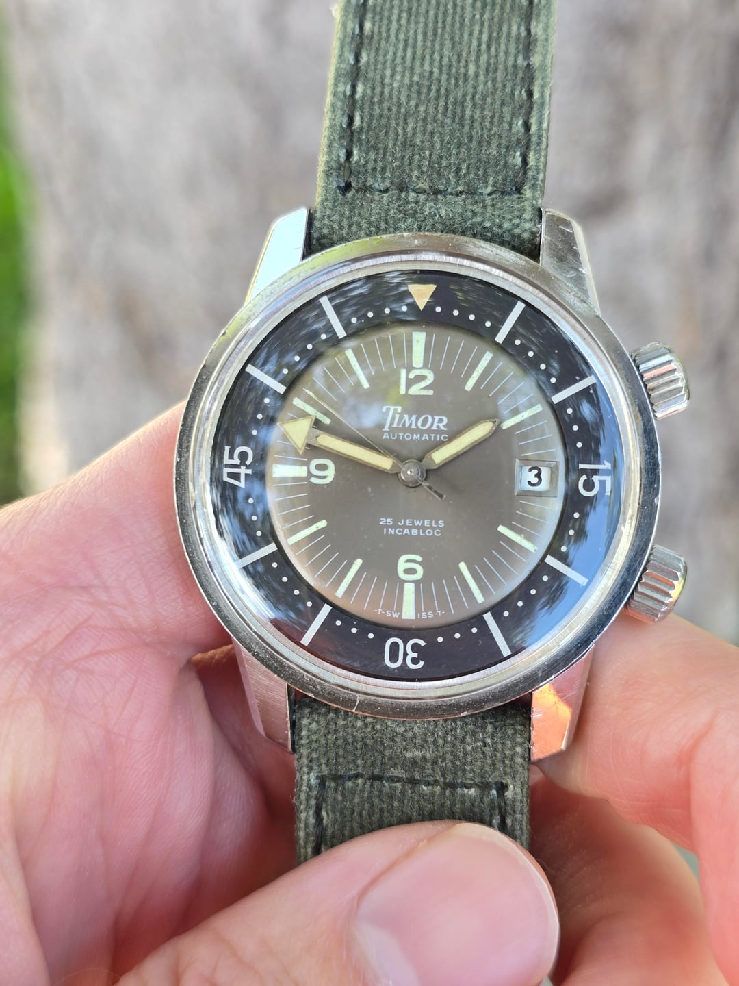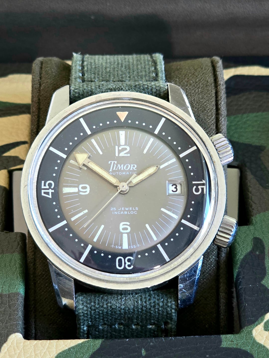 Timor super compressor 40mm automatic from 1968 This is an awesome vintage diver that is very rare. Timor is one of the Dirty Dozen companies, and this watch has its original crowns and has a very nice aged "tropical" dial. Watch comes as pictured, it is in Vintage condition and shows markers and wear, It is functioning and running as it should, Date works and its keeping good time, service history is unknown. The watch is on a very nice wax canvas style strap. There is not a single one of these 40 mm Super compressor Timor watches on the internet. I'm asking 1450 shipped Conus and except zelle and PayPal FF for outstanding members of the community. Thanks for looking, and enjoy your time!