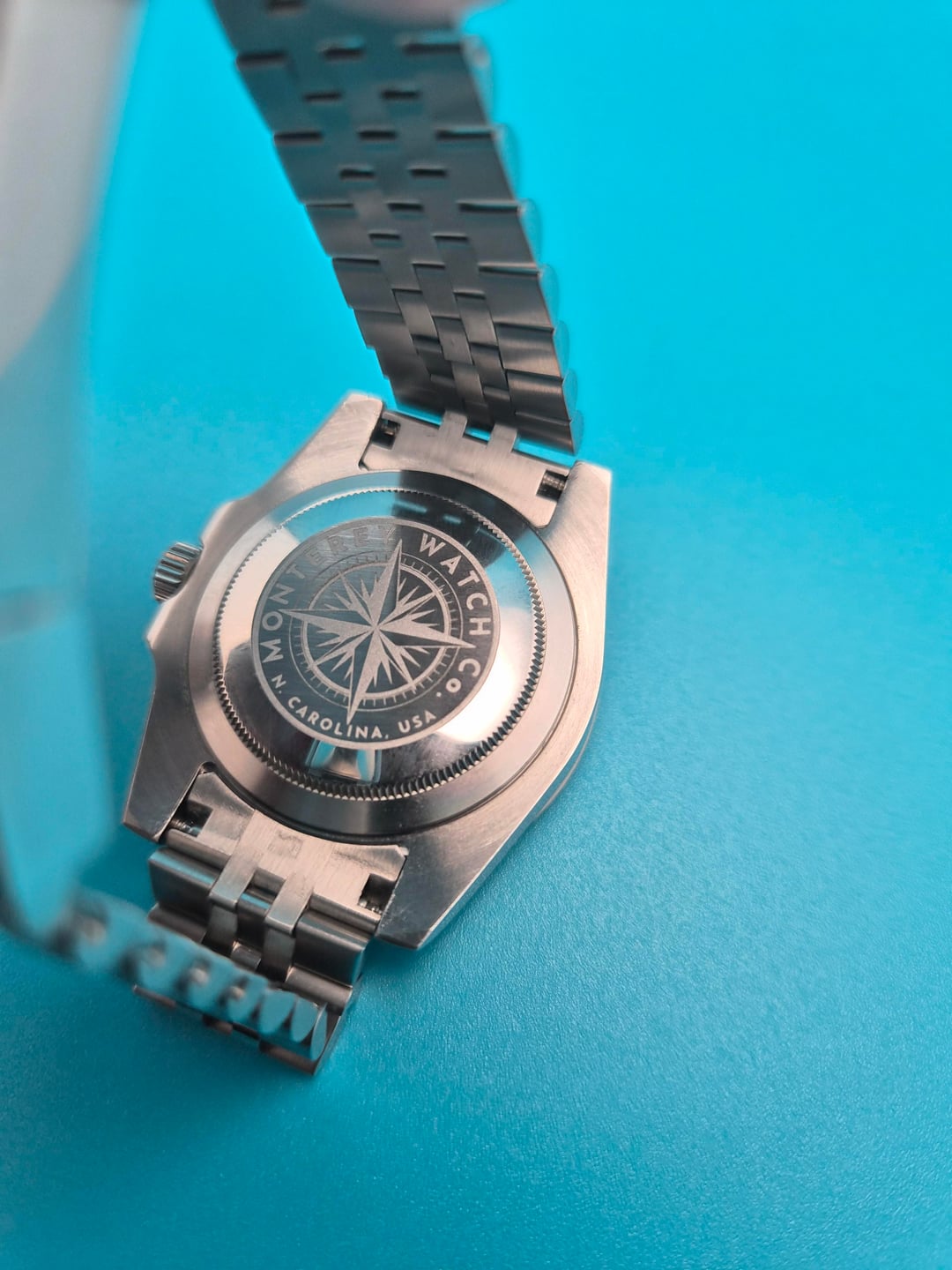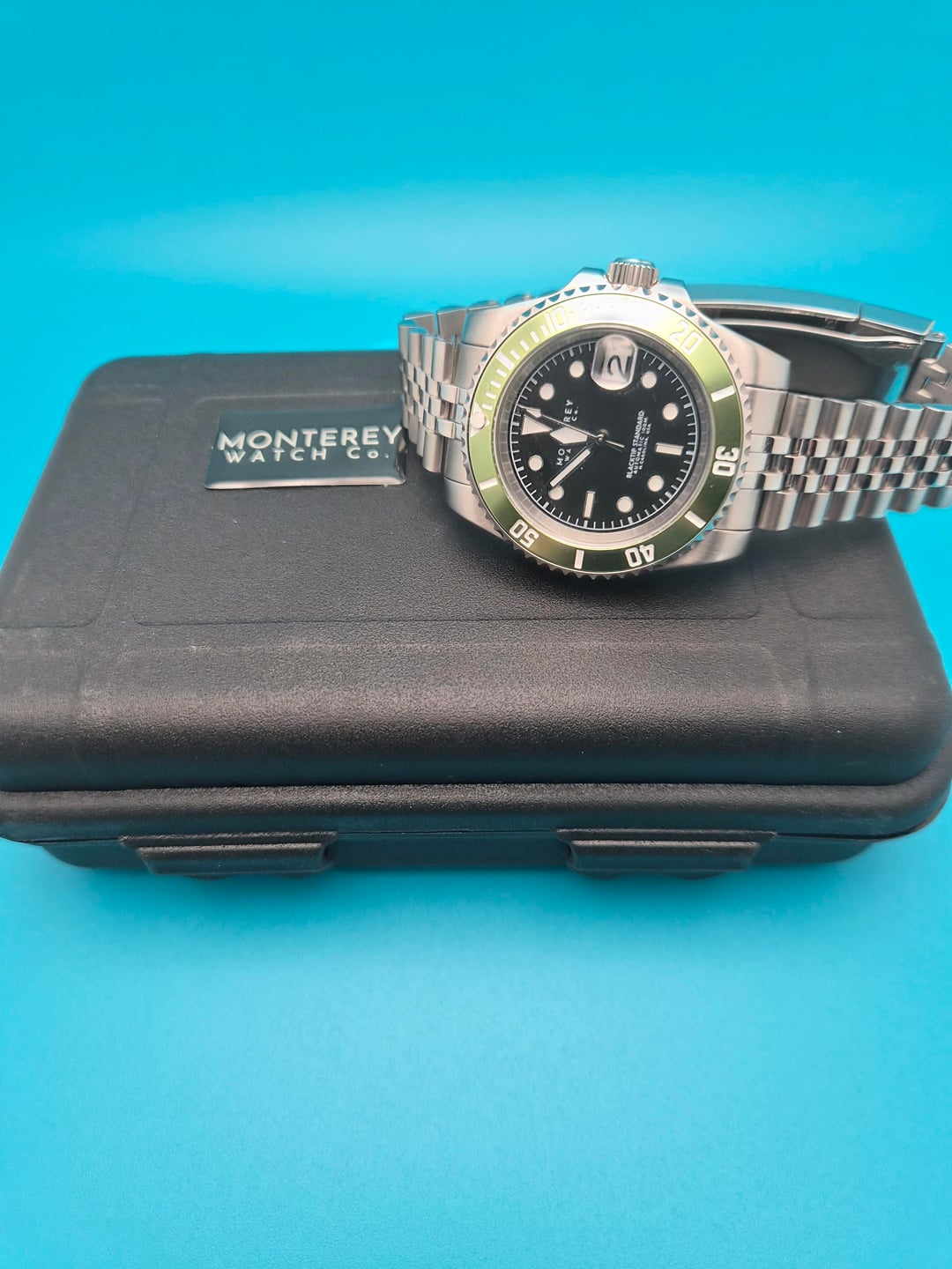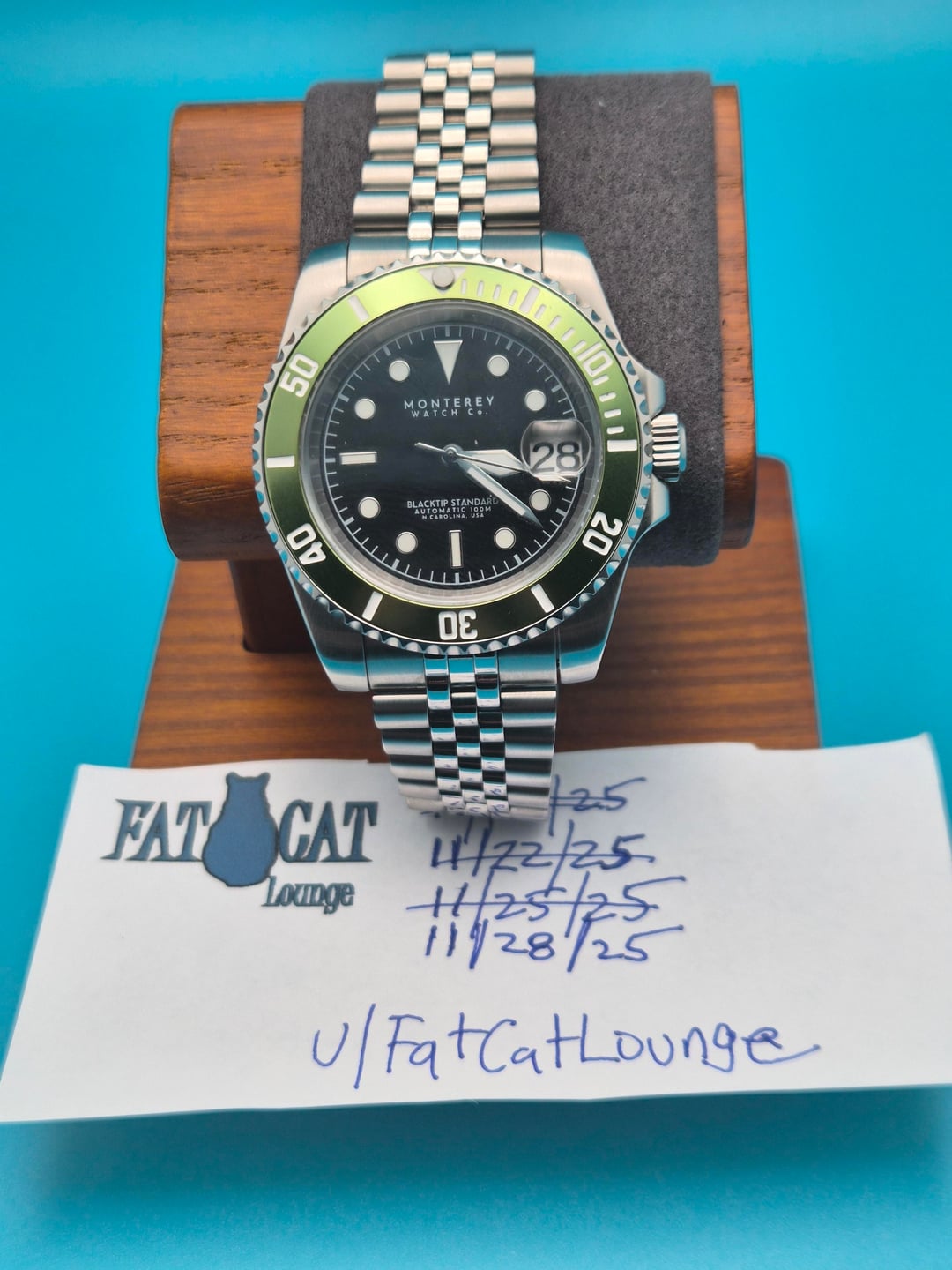 For Sale – Monterey Watch Company Black Tip Standard - Custom Harrods Green Dial Condition: Pre-owned, in excellent condition. Watch details: 40mm 12mm Height Unidirectional Ceramic Bezel Date Window with Magnifier Sapphire Crystal 100m Water Resistant NH35A Movement Luminous Dial and Markers Solid Case Back Screw-Down Crown Stainless Steel Bracelet Includes: Box, card Price: $200 Shipping: Free shipping within the CONUS. Payment: PayPal F&F, Venmo F&F, or Zelle accepted. Location: Fernandina Beach, Florida Thank you for viewing my listing!