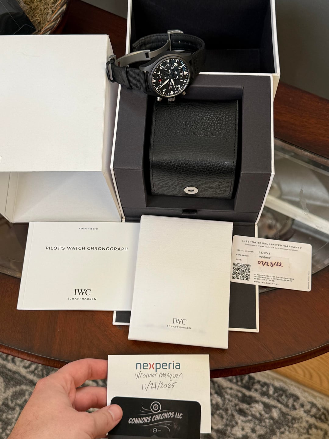 Model: IWC Pilot’s Watch Chronograph “Top Gun” (IW389101) Year: July / 2022 🔹 Key Features Movement: Automatic IWC Caliber 69380 chronograph movement (46-hour power reserve) Crystal: Scratch-resistant sapphire, anti-reflective coating on both sides Case back: Titanium with “Top Gun” engraving ✈️ About This Watch The IWC Schaffhausen “Top Gun” Pilot’s Watch blends stealth-grade materials with precision German engineering. The black ceramic case is lightweight yet durable, while the in-house caliber 69380 ensures flawless timekeeping and smooth chronograph function. The watch wears comfortably on its military-style textile strap, offering a perfect balance of performance and sophistication. Condition - This piece is in good preowned condition. Watch has light wear scattered around, but has overall been worn sparingly. Light scratch on the case as shown in photo. I’ve heard of people finding a way to remove light scratches on ceramic, i’m just not a professional haha. Crystal is clean, light scratches on AR which is removable. 🎁 What’s Included (Full Set) ✅ Original IWC Presentation Box ✅ Original IWC Travel Case ✅ Owners Manual ✅ Warranty Card Asking for $5,450 Shipped to the CONUS or best offer! This is a fantastic watch for any collection. Retail on this piece was $10,000+ after taxes and fees. Thank you for looking! Please message me with any questions.