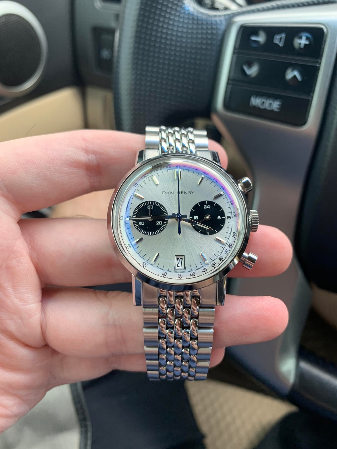 \[WTS\] Dan Henry 1964 MINT This Dan Henry 1964 Silver Panda Bicompax is in great condition. This brand does an awesome job creating affordable and reliable vintage-inspired pieces. The beads of rice bracelet is very comfy and drapes around your wrist. Comes with carrying pouch, bracelet links and leather strap. $185 + $15 shipping CONUS PayPal F&F (no notes please). No trades at this time. Please comment first before sending a personal message (please don’t send a reddit chat message). Pics: [https://imgur.com/a/KWxWE34](https://imgur.com/a/KWxWE34) Timestamp: [https://imgur.com/a/7HafKgW](https://imgur.com/a/7HafKgW)