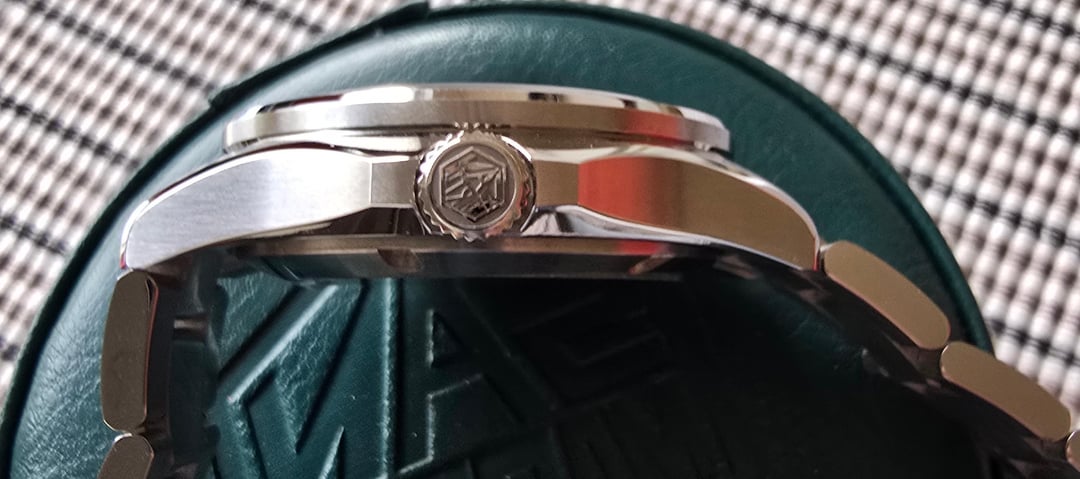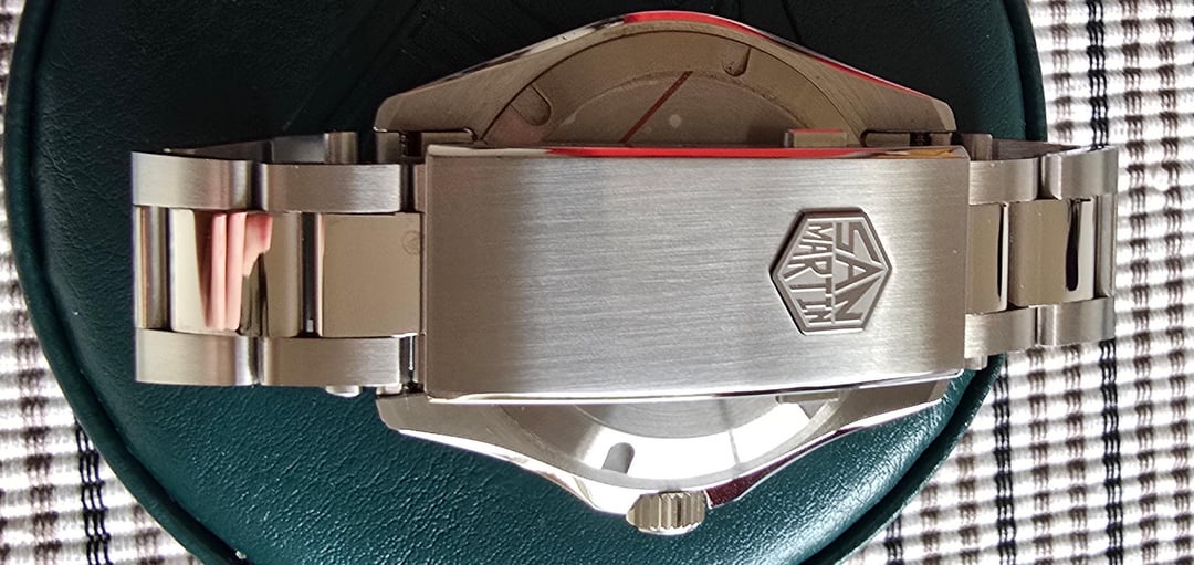 Bought from the EU San Martin store last January. Selling as I rarely wear it, the plastic is still on the caseback. In excellent condition, I would rate it 9 or 9.5 out of 10. Price includes registered mail to any EU destination. Movement: NH34 \[Automatic Mechanical Movement\] Case: Material – 316L Stainless Steel Case Diameter: 39mm Lug to Lug Length: 46.5mm Thickness: 13mm Lug to Lug width: 20mm Crystal: Sapphire crystal with AR Coating Bezel: 24-hour GMT Scale Stainless Steel Bezel Dial Color: Gardient Green and Gardient Purple Dial, 3D Hexagon Logo, Applied indices, Date Window at 3 O’clock Hands: GS Crafts GMT 4 Hands, Luminous, New Red GMT Hand Luminous: Green Lume, Hands and Markers Crown: Screw-down Crown, With Crown Guard & 3D Hexagon Logo Case Back: Screw-down Case Back Bracelet: 316L Solid Stainless Steel Bracelet,Polished Middle Links, Brushed On Both Sides, Width 20mm \* 16mm Clasp: New Fly Adjustable Clasp,With San Martin Hexagon Logo Water Resistant: 10Bar=100 meters Weight: about 145g