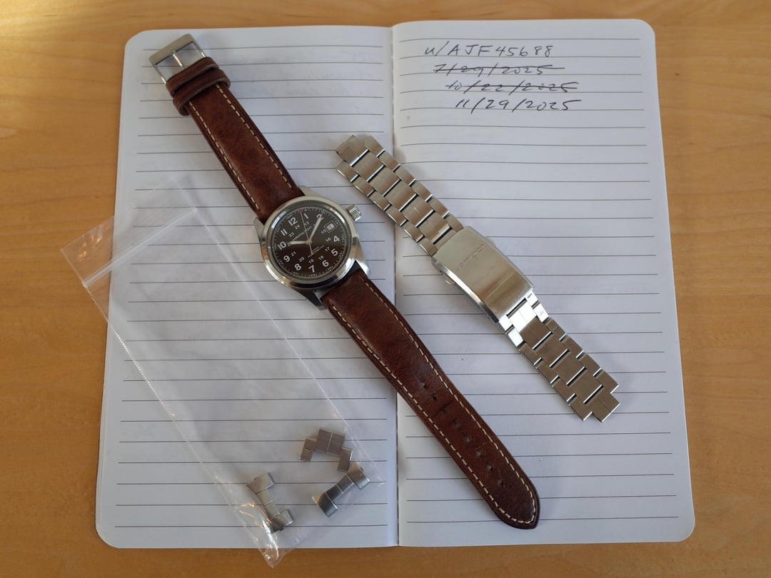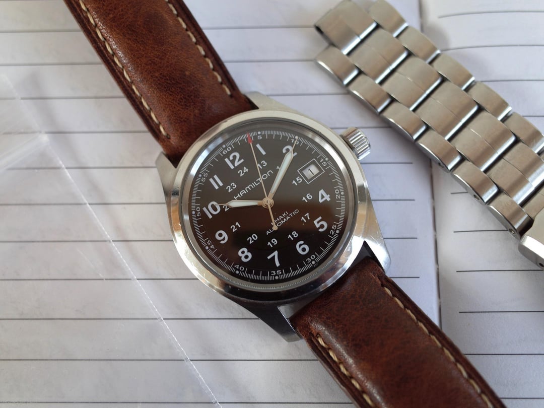 Hamilton Khaki Field Auto H704450. Good condition (see photos for wear), keeps excellent time (+/- 8 secs/day on my wrist). 38mm. Includes original bracelet with all links and B&R Bands brown calf leather band. No box, no papers. $350 PP F&F
