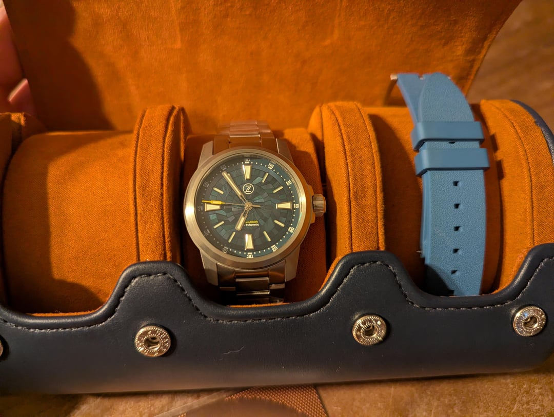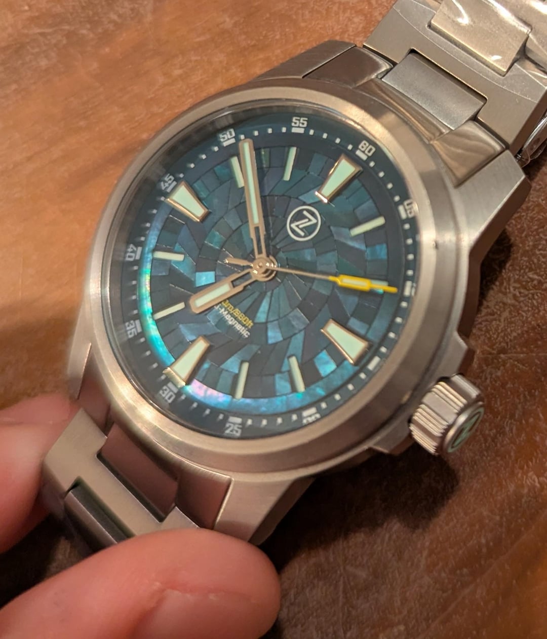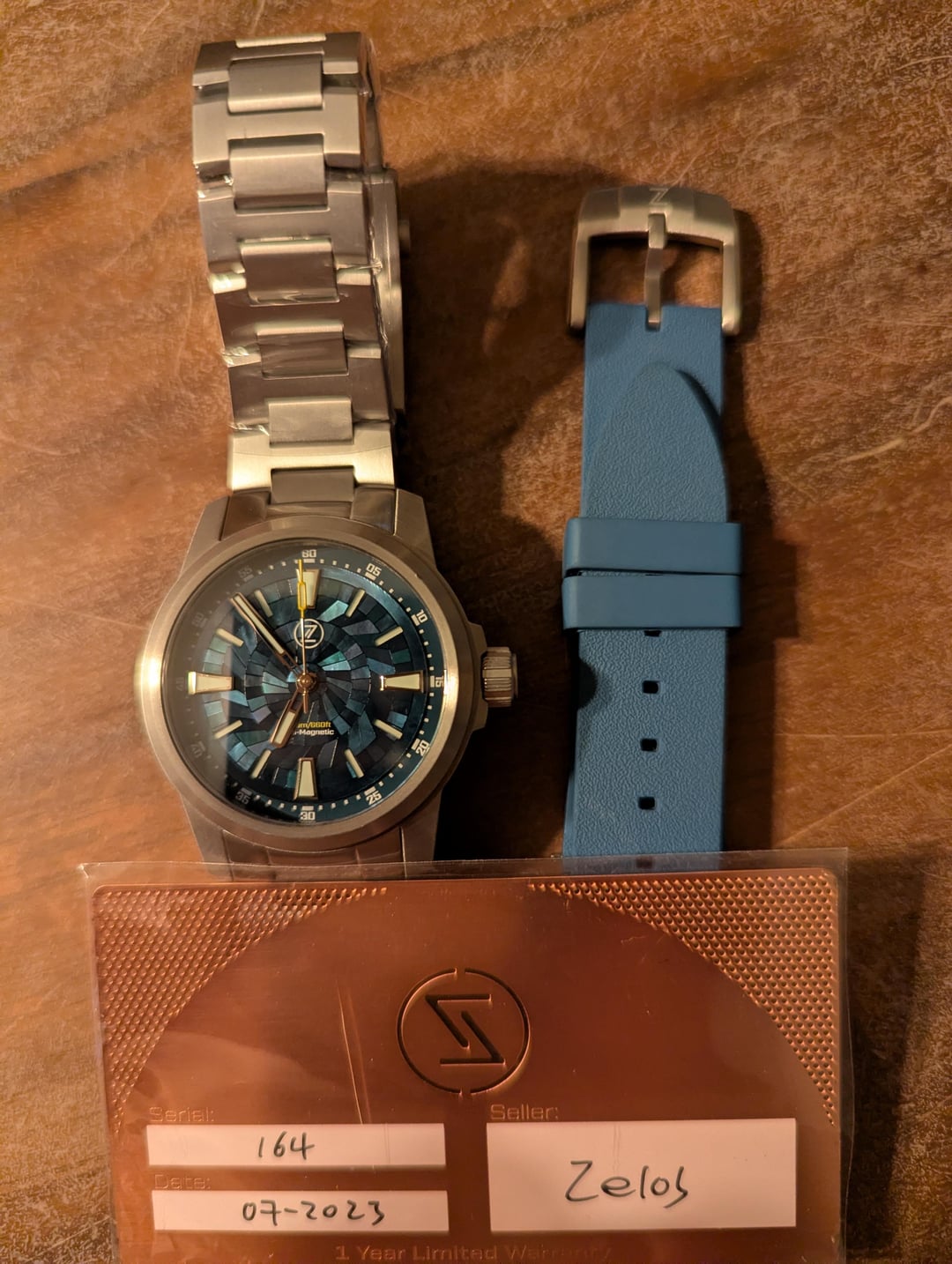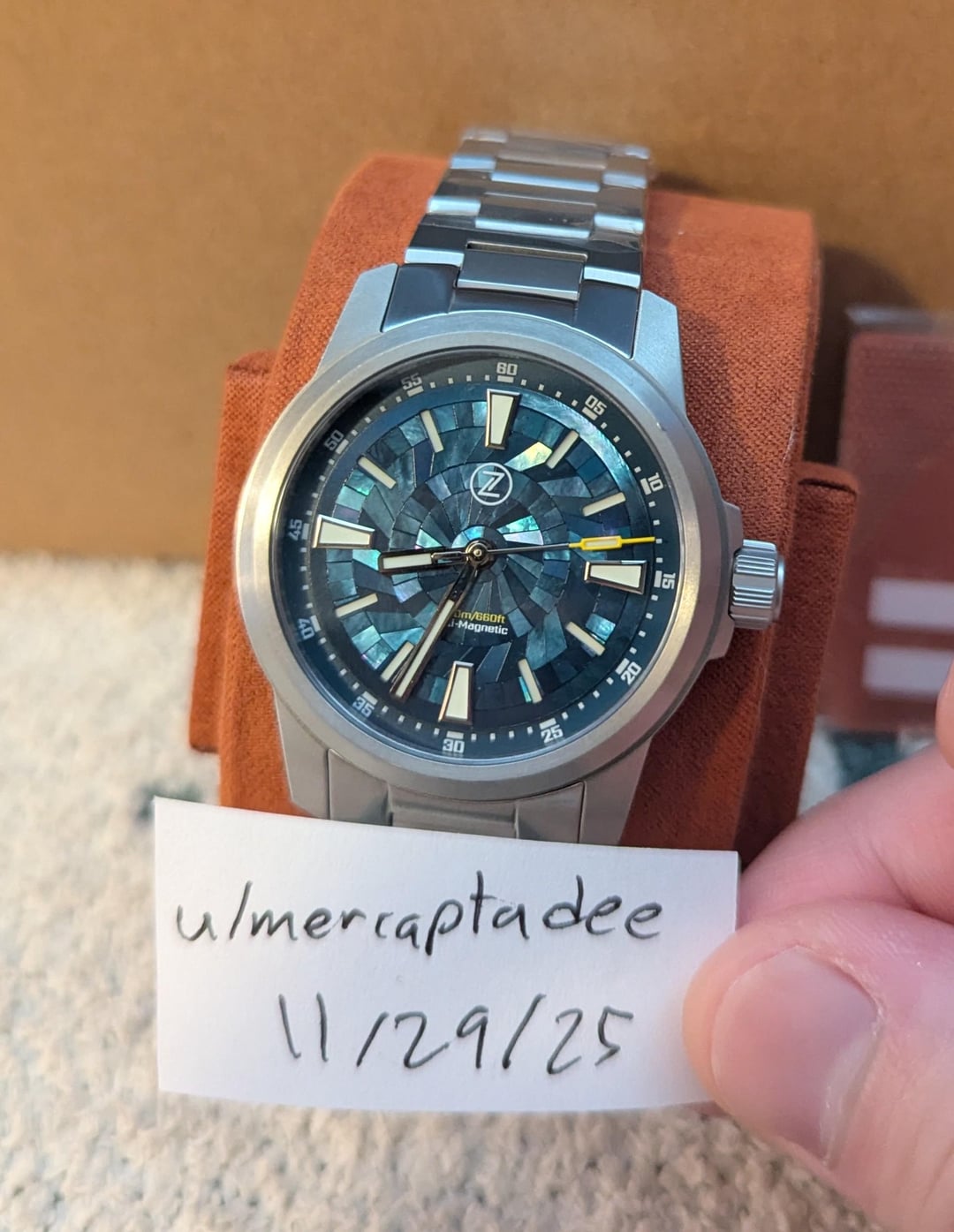 FOR SALE ✨ Zelos Aurora Field Ti - Mosaic Mother of Pearl (MoP) ✨ A watch you don't see come up for sale often! One of my grail watches. The way that the MoP shimmers and reflects with light and differing angles is a sight to behold. Bummed that I have to put this one up for sale, but sadly have other priorities now. Lovingly worn on a Zelos rubber strap since I got it, but has not been worn for months now. Comes with warranty card, travel case, all original packaging, and a bonus, matching Zelos rubber strap. Original straps are still in their wrapping, so they are in brand new condition! Only issue is a nick on the case between the 1 and 2 hour marks, which I've tried best to photograph. SPECIFICATIONS Diameter: 38mm Lug to Lug Length: 46mm Thickness: 12mm Case: Gr2 Ti with 1200HV Hardened Coating Lug Width: 20mm Movement: Miyota 9039 Movement Crystal: Flat Sapphire crystal with inner AR coating Bracelet: Titanium with updated Quick Adjust Clasp Selling for $450. Shipping from Hawaii, USA. US sales only via PayPal FF. Mahalo!