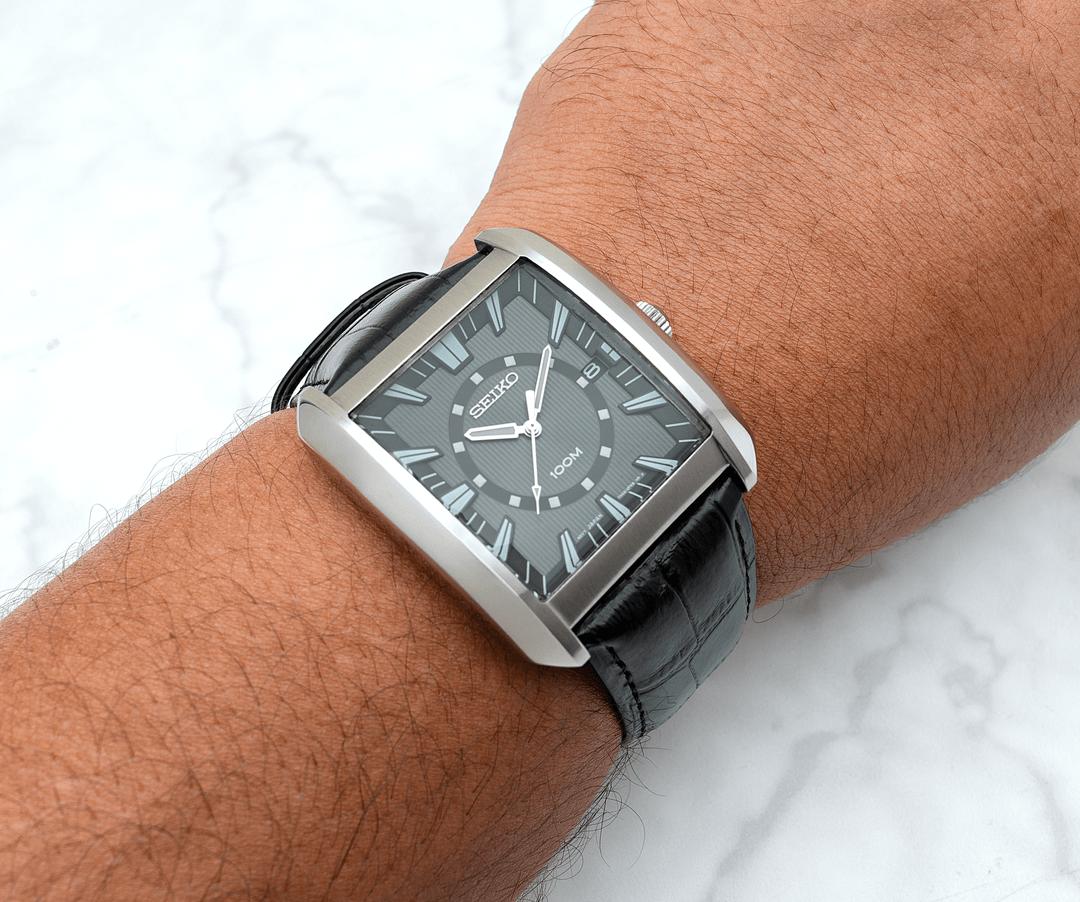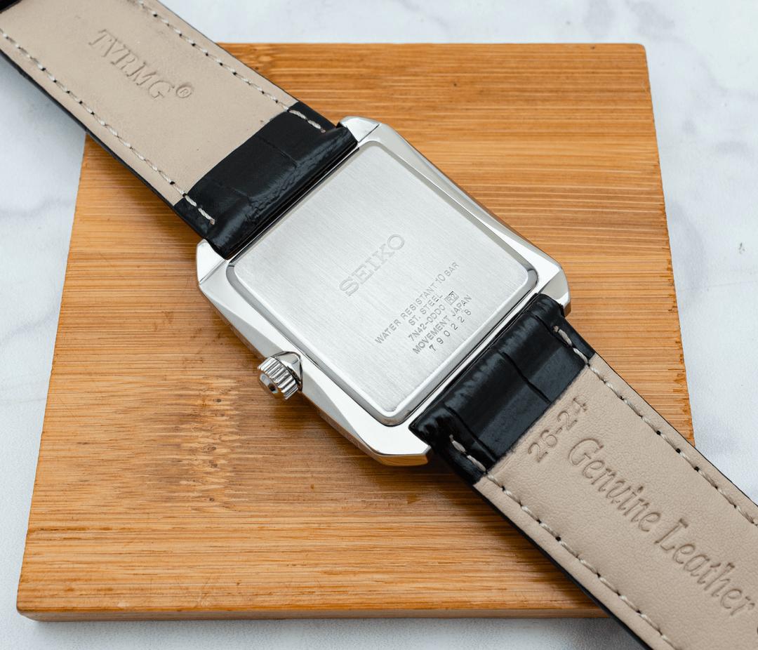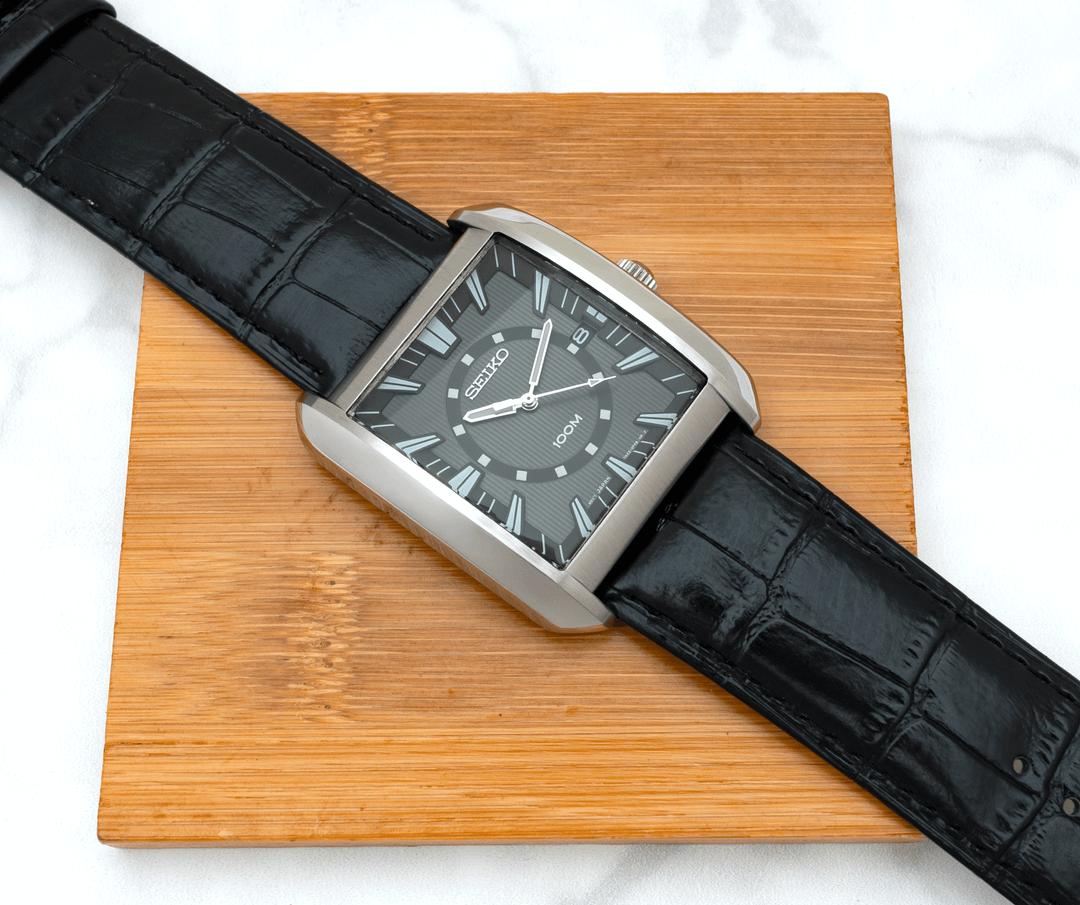 A very cool rare Seiko vintage watch. TV shaped retro Tank case. Stunning Greyish Black textured sunburst dial, unique layout. Amazing condition. Tastefully done symmetrical date window. Comes with an aftermarket Black leather strap, unsigned clasp. Very solid build quality. Ready to be used as a daily driver. Pictures don't do justice to this watch. Looks better upfront. Case is polished keeping all the sharp brushed lines, edges and mirror finishing. A good collector's piece. PRICE: $149 USD via Paypal, Wise, Crypto. FREE Shipping worldwide. I have a good number of exchanges here for a safe transaction. Check my Instagram: [https://instagram.com/hour.lust](https://instagram.com/hour.lust) * Reference model: SGEC91 * Case size: 38.5 mm (w/crown) * Lug to lug size: 44 mm * Case Thickness: 11.5 mm * Lug width: 26 mm * Seiko 7N42 Quartz Movement Pics: [https://imgur.com/a/hdQFCH1](https://imgur.com/a/hdQFCH1) TS: [https://imgur.com/a/qHJgsJf](https://imgur.com/a/qHJgsJf)