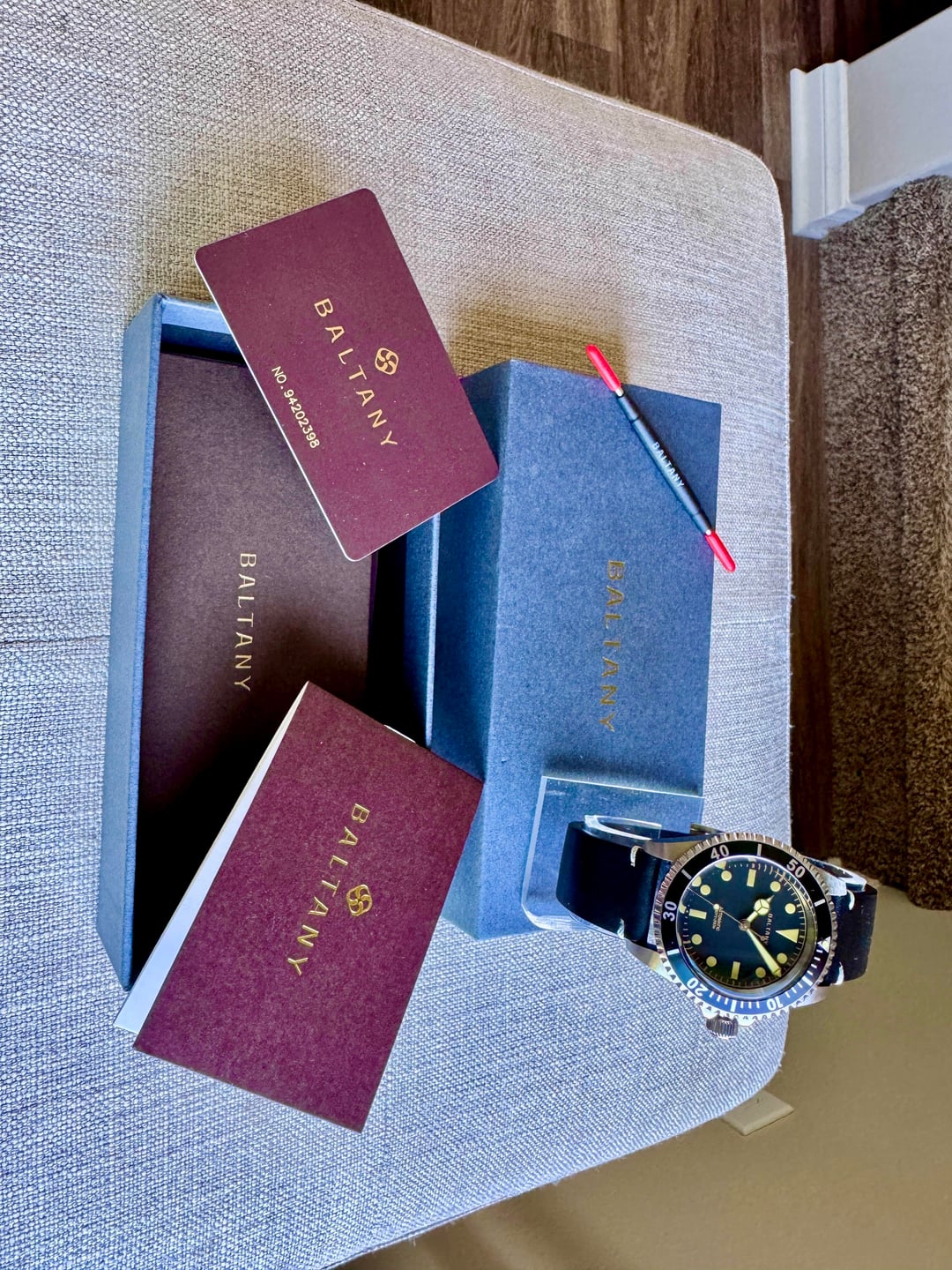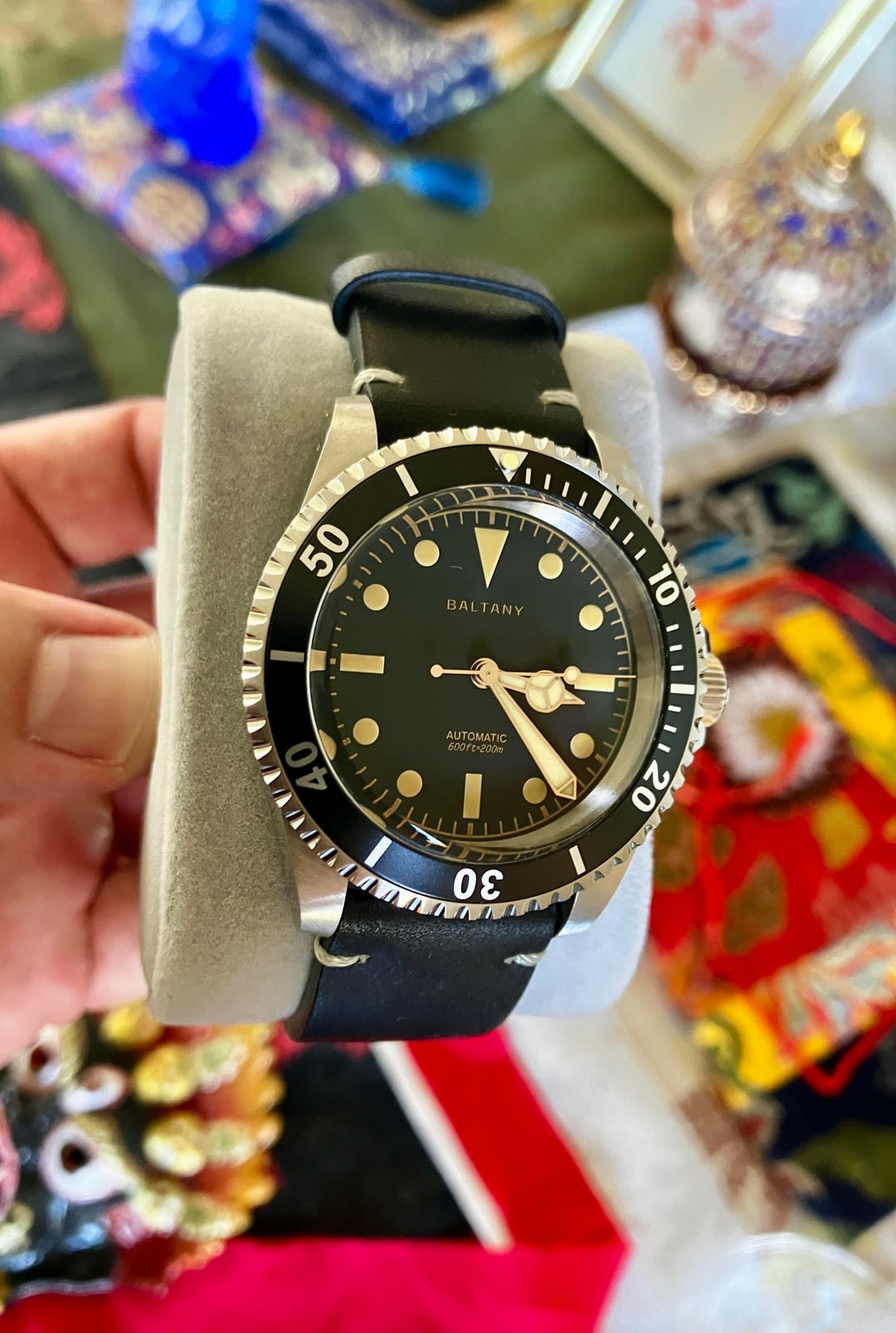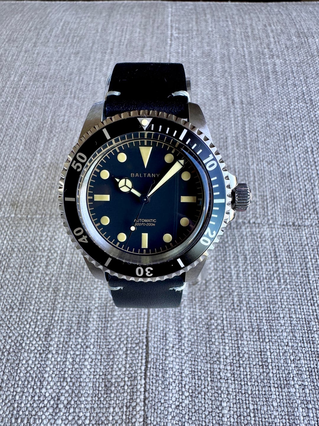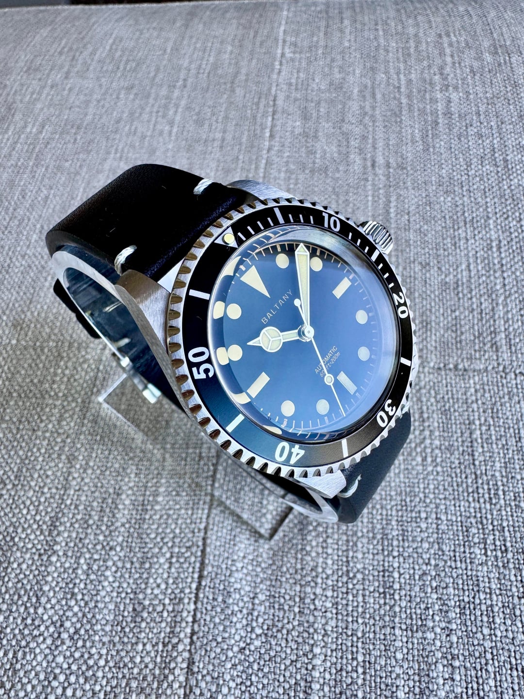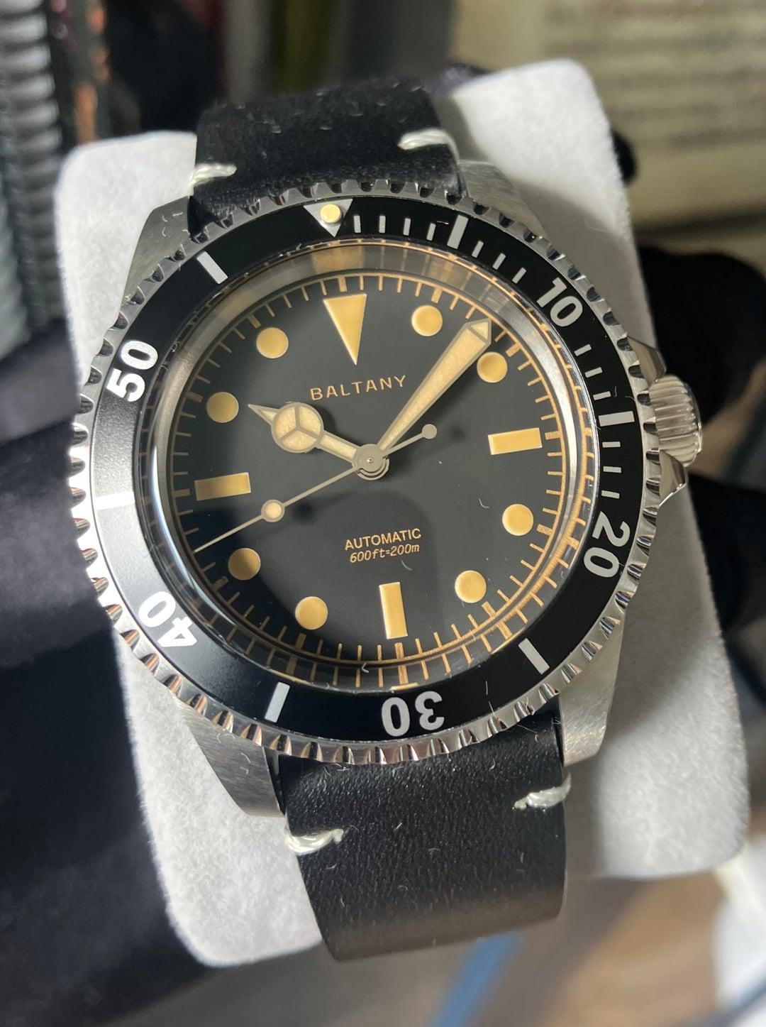 **Description**: This 40mm Baltany Retro Dive Watch S3043, a high-quality homage to the Rolex Submariner, is in excellent condition; please see the photos to verify (and please pardon the superficial dust on a couple of the photos). The movement is an automatic Seiko NH35 and the OEM leather strap with signed buckle has been worn only a handful of times. Original box included. [Timestamp.](https://imgur.com/a/timestamp-u-wizard903-r-watchexchange-pfogl3z) **Price**: $85 (firm) shipped CONUS. Zelle/Venmo preferred, PayPal FF available for those with purchasing history. No trades at this time. **Miscellaneous**: I've sold many watches, including higher-end pieces, on Reddit with 100% positive feedback. Please feel free to examine the details of my selling history; and feel free to send a chat with any questions. I currently have \~10 other watches for sale; please check my profile for details. All watches have been cleaned with a microfiber cloth and gentle solution.