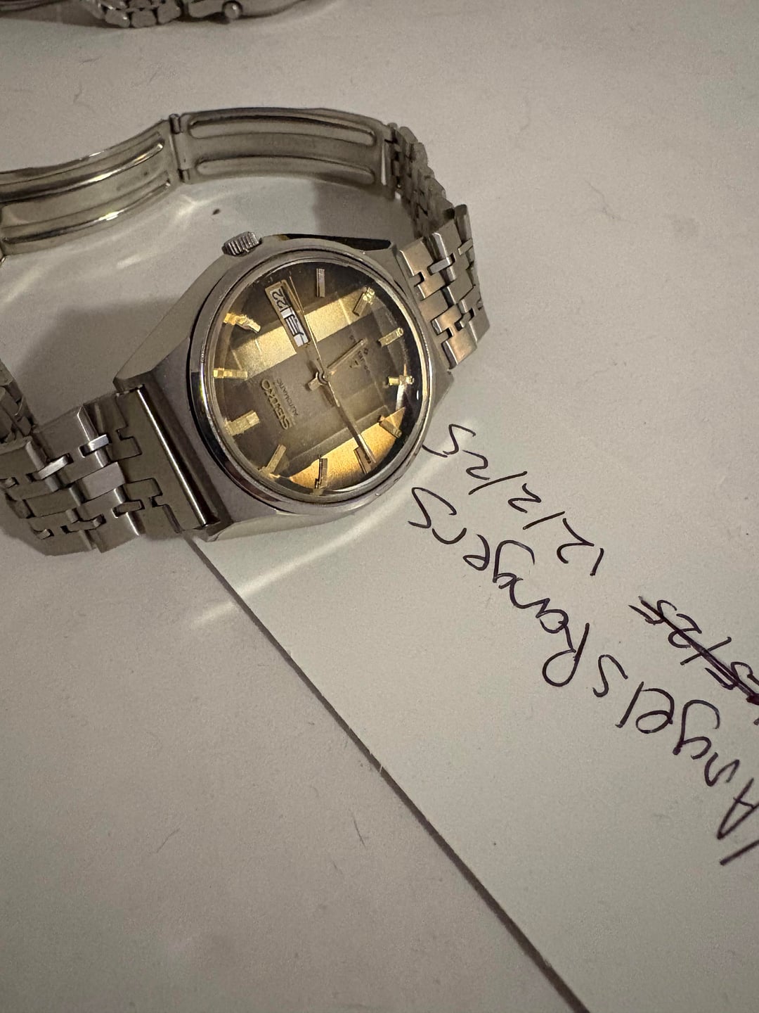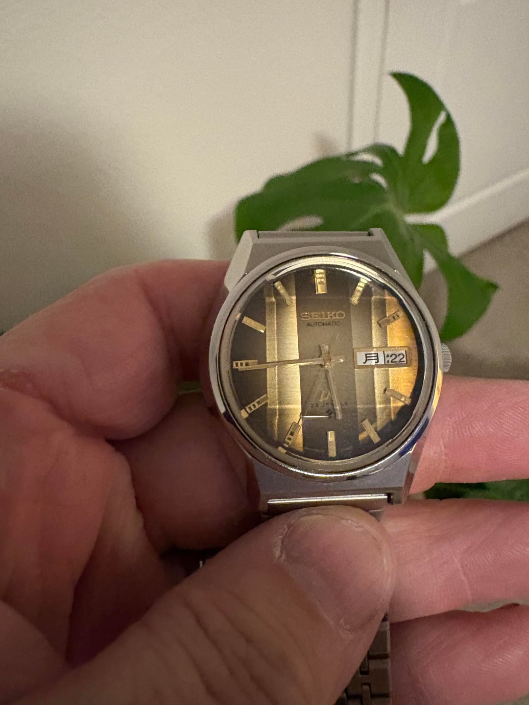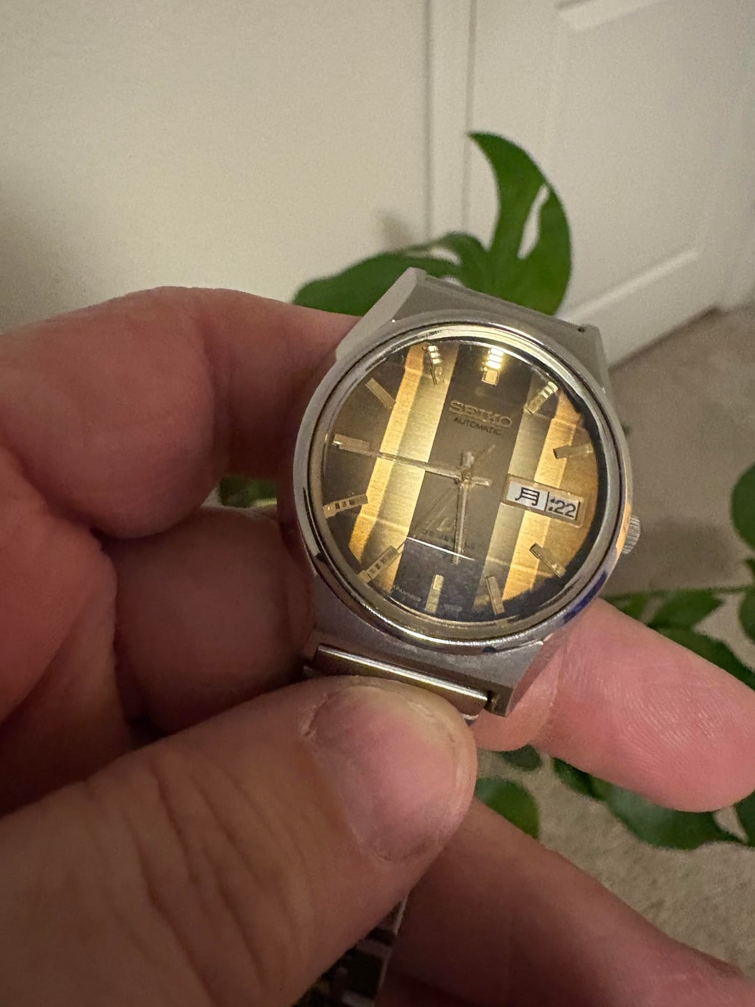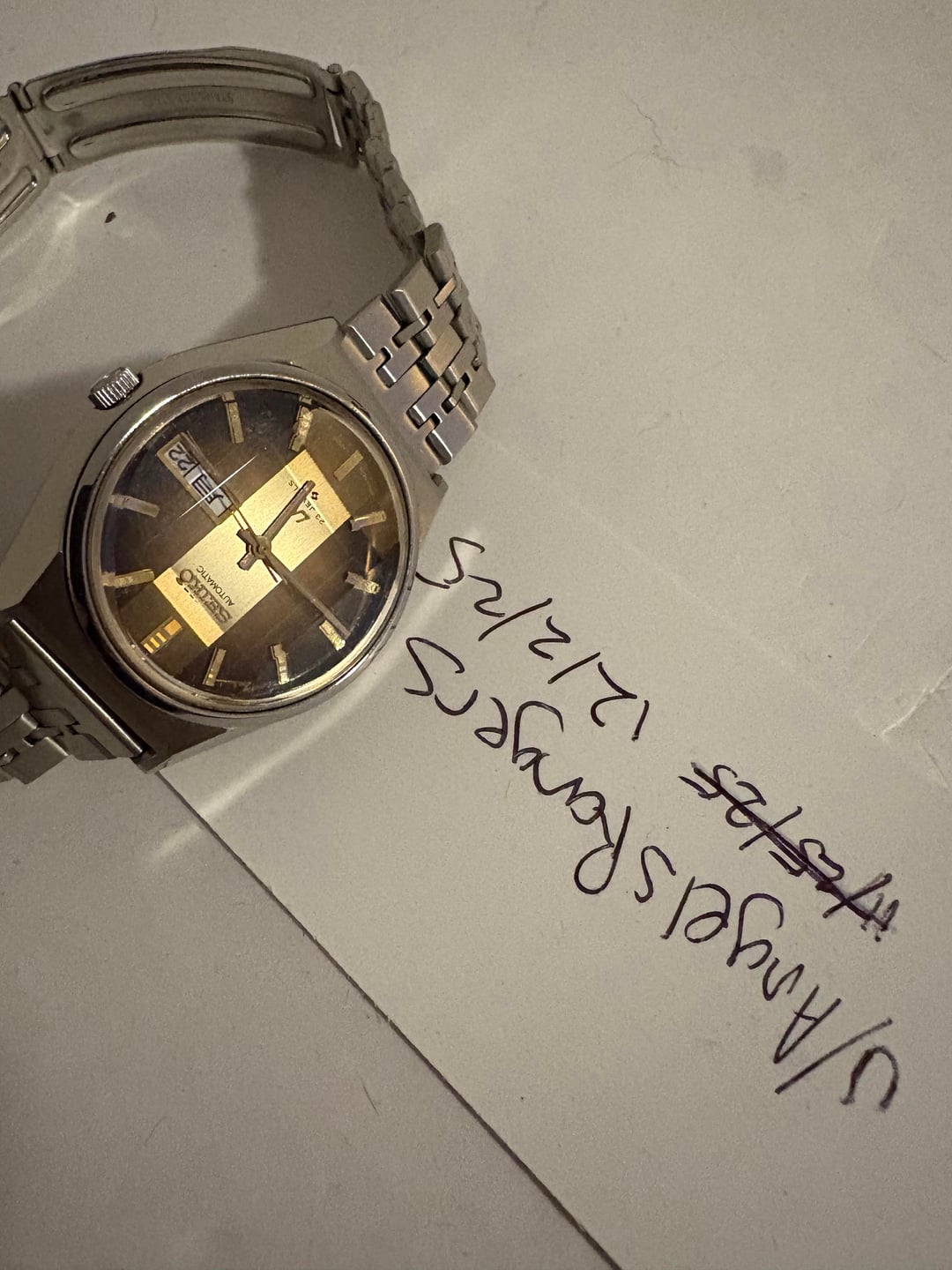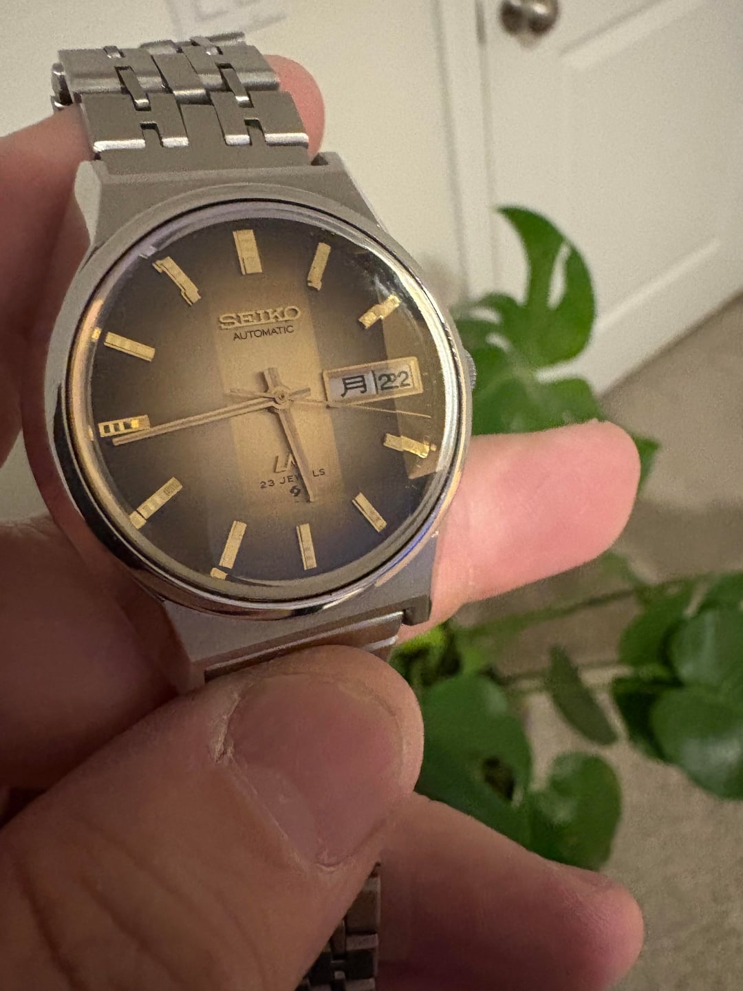 Up for sale or trade is my 1975 Seiko Lord Matic. The LMs have the same movement as the King Seiko. In great condition for a 50 year old time piece! Fits up to I’d say 7.5 wrist. Japan model. Kanji date. Gold/Brown. I can send a video too the light place off the faceted crystal is off the charts. Beautiful piece be it I’m realizing I like larger 40mm+ case watches so vintage just isn’t for me. Hoping someone will snatch it and give it more love than I can. Comfortable doing face time. 100% eBay rating and verified transactions on here so buy with confidence $350 shipped