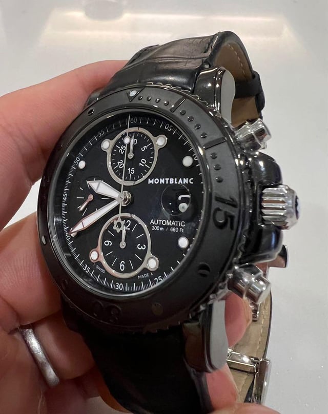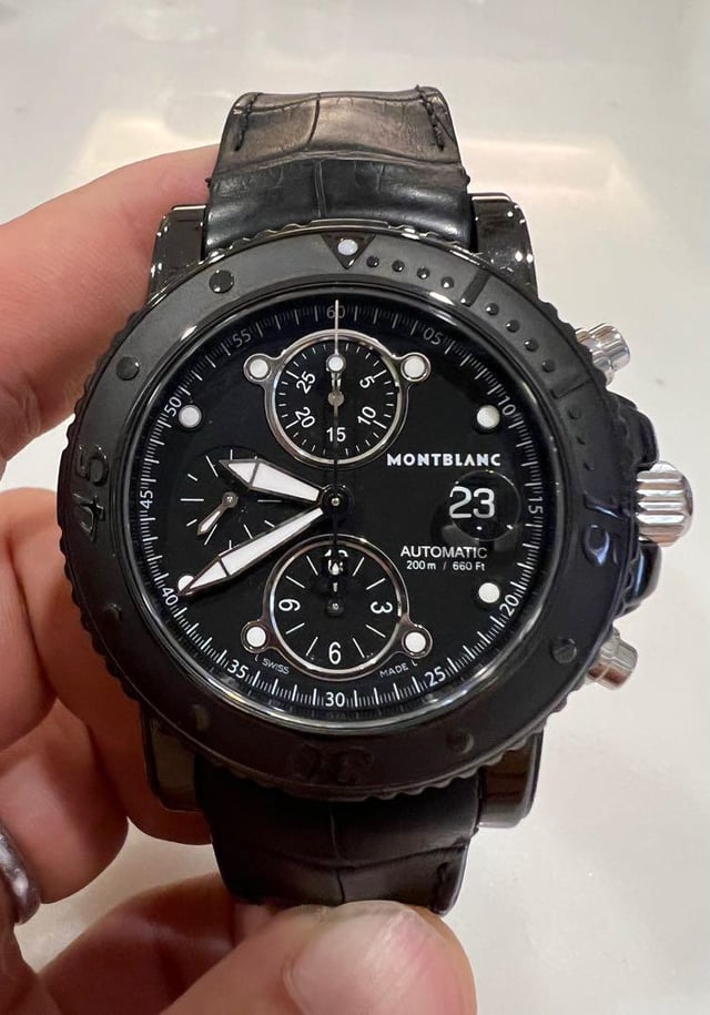 Montblanc Sport Chronograph Automatic 104279 Case/WR: 44 mm black DLC-coated steel sports case, 200 m water resistance Build: DLC-coated steel + convex sapphire crystal + screw-down crown + 200 m WR = proper dive-ready chrono, not just desk diver Function: Time, day-date, 12-hour chronograph + unidirectional dive bezel for timing Condition: Very good overall condition Strap Bracelet: Premium black alligator leather strap with folding/clasp-style buckle for a secure, sporty fit Case Size: 44 mm (approx. 15.8 mm thick, strong wrist presence) Movement - Montblanc calibre 4810/501 automatic chronograph (Valjoux 7750–style architecture) Reliability: Proven, widely-serviceable 4 Hz workhorse with \~46–48 h power reserve and chronometer-grade construction in this line Functions: Chronograph, Time (hours/minutes/seconds), Day, Date, Rotating timing bezel Stealthy full-black DLC case, real 200 m water resistance and a robust automatic chronograph movement make this Montblanc Sport a serious tool watch with luxury finishing. DLC stands for “Diamond Like Carbon” and is used for scores of technical applications requiring high resistance to mechanical stresses and corrosion.
