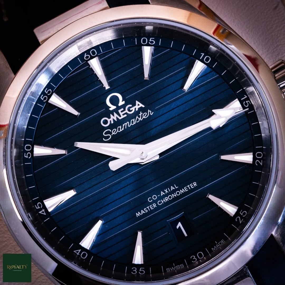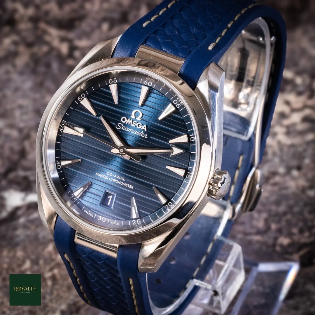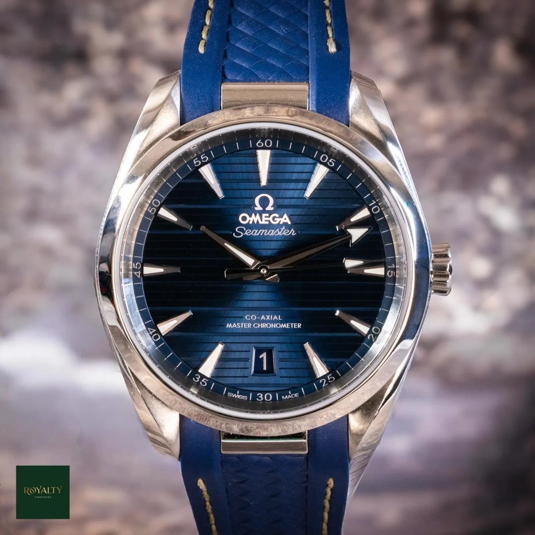 Omega Seamaster Aqua Terra 150M Blue Teak Dial 220.10.38.20.03.001 Case: 38mm Condition: This timepiece is in like new condition and shows little to absolutely no signs of wear. The crystal is pristine, and the case retains its sharp lines and brilliant factory finish. It has been handled with the utmost care by its previous owner and presents beautifully on the wrist, appearing virtually unworn. Accessories: This offering is a complete package for the collector, ensuring the new owner receives: * Original Omega Outer and Inner Box * International Warranty Card * Pictogram Card * Master Chronometer Certificate **Strap Configuration:** * This watch is fitted on a comfortable, high-quality blue rubber strap which complements the dial perfectly. * *Please note: While the warranty card reference (220.10...) indicates this model was originally sold on a steel bracelet, that bracelet is not included; it is sold as pictured on the rubber strap.* The Omega Seamaster Aqua Terra 150M is a superb tribute to Omega’s rich maritime heritage, perfectly balancing sophisticated dress watch aesthetics with rugged ocean-ready capability. This 38mm model features a stunning sun-brushed blue dial distinguished by a horizontal "teak" pattern, inspired by the wooden decks of luxury sailboats. Powered by the Master Chronometer Calibre 8800, this timepiece represents the pinnacle of precision and performance. It is a watch designed for the individual who demands versatility—equally at home under the cuff of a suit or on the deck of a yacht. $5️⃣0️⃣0️⃣0️⃣ + 🏷️ MSRP: \~7.1k Shipping available to anywhere in CONUS. Shop with confidence, many references available and authenticity guaranteed! NY residents subject to sales tax without resale certificate IG: royalty.timepieces Timestamp: [https://imgur.com/TL4K0Vi](https://imgur.com/TL4K0Vi)
