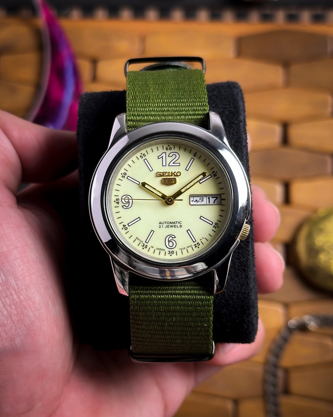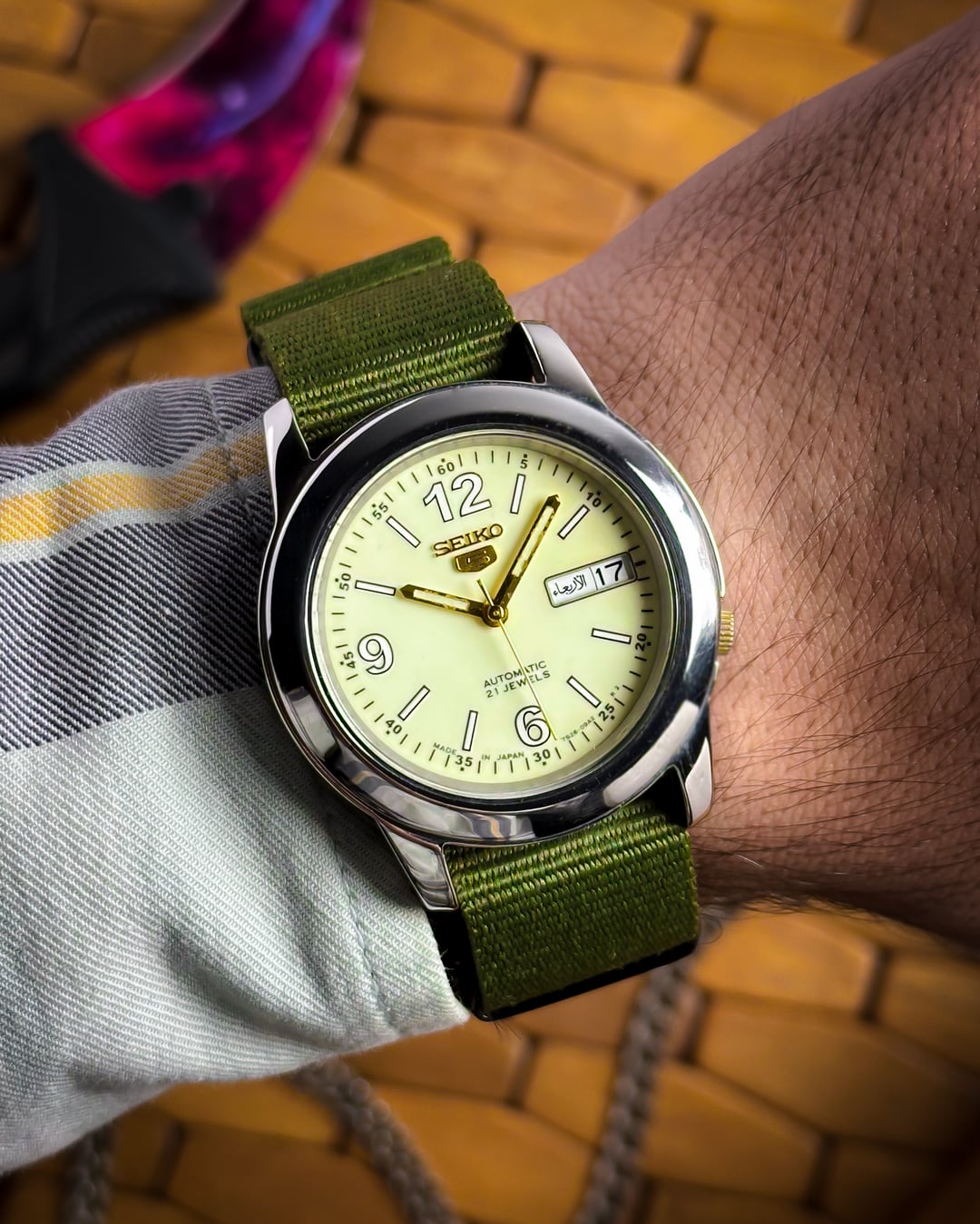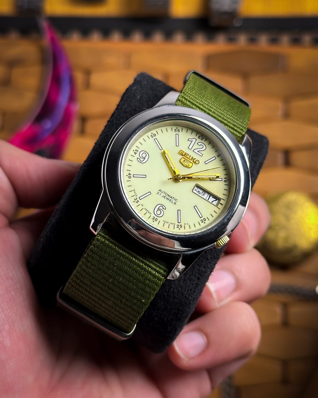 [Timestamp](https://postimg.cc/Mn8THBZs) Hey Watchexchange! This is the **Nuclear Lume**—a nickname we gave this automatic Seiko 5 to celebrate its **stunning, highly legible full luminous dial**. This watch stands out with its robust, classic size and bright visibility, making it a perfect field watch or high-visibility everyday piece. The dial is the star: a **full lume dial** that glows beautifully. It features **golden pencil hands** and **baton indices**. There are **multiples of 5** around the minute markers, enhancing its field watch aesthetic. The day-date complication is at 3 o'clock, and the days are shown in English and Arabic. The case is a robust classic style topped with a **Hardlex crystal**. This model features an **exhibition case back,** allowing you to view the dependable **21-jewel automatic Caliber 7S26** movement**.** This watch offers excellent versatility and comes with a **military green NATO strap** attached. **The buyer gets an extra strap worth $10 for free** and can choose between the sporty **blue NATO strap** or the **black/blue resin magnetic strap**. **🔹 Key Dimensions** * Case Diameter: **38mm** (without crown) * Lug-to-Lug: **43mm** * Thickness: **11mm** * Lug Width: **20mm** 💵 **Price: $150 shipped** 📦 **Payment: PayPal F&F** or G&S (**+4.5% fee by buyer**) or **bank wire (US banks accepted)** 📩 DM me for more pics or a custom timestamp. If you’re after a high-visibility, robust Seiko 5 with a full luminous dial and great strap options, this watch delivers exceptional value. Follow my [**Instagram**](https://www.instagram.com/everistwatches/) and **Reddit profile** for more **vintage drops**.