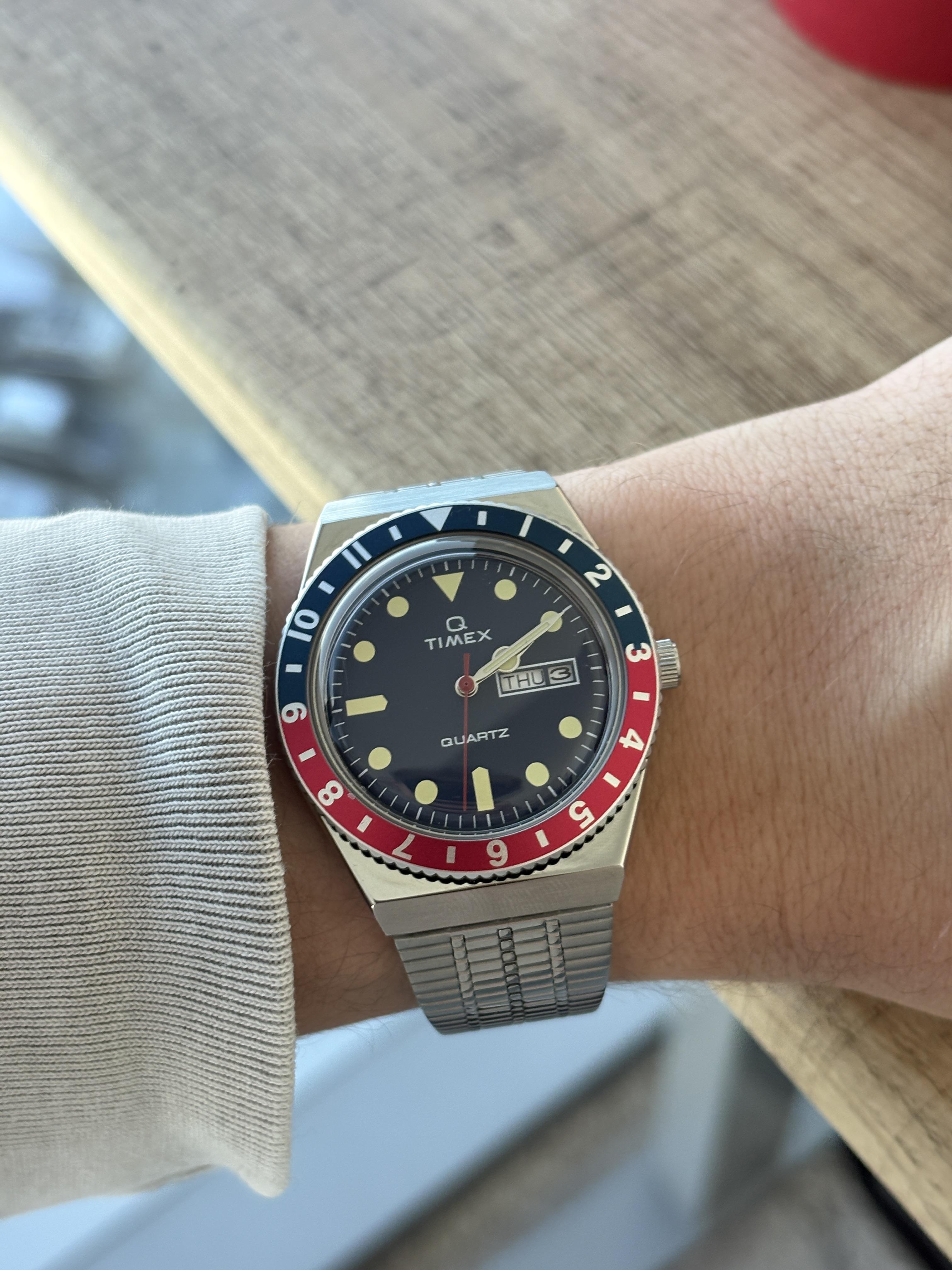 Model: Q Timex 38 Blue Dial Day-Date Display Condition: Used, very new (maybe 2 moths old). Crystal has a small mark on it but it's acrylic so it can be poly-watched out. Almost no signs of wear on the bracelet. Includes: Watch and Original Box/Manual/Contents Asking: $145 Shipped CONUS Paypal or Venmo Preferred I ship same day or following morning typically! UPS or FedEx depending on store hours near me. Additional Photos/Timestamp: [https://drive.google.com/drive/folders/1zqYdDDNvnw\_g\_N0tiNuHJ5vAwpNjBHcQ?usp=share\_link](https://drive.google.com/drive/folders/1zqYdDDNvnw_g_N0tiNuHJ5vAwpNjBHcQ?usp=share_link)