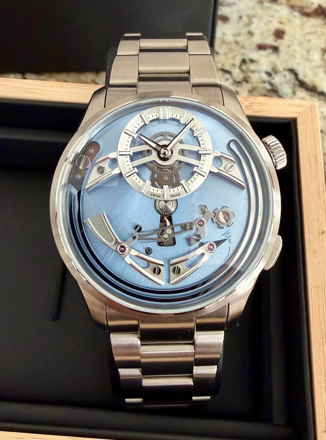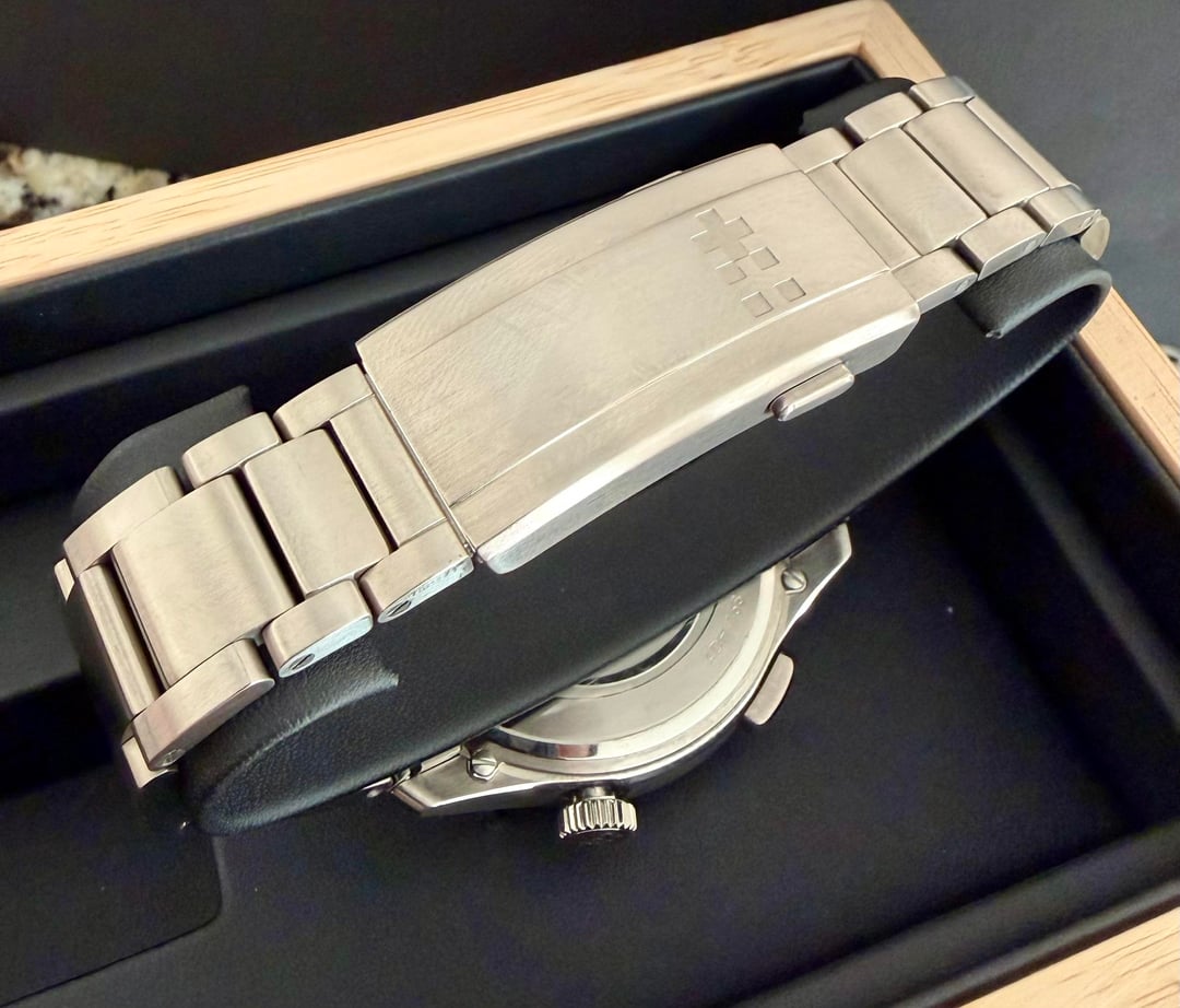 Up for sale is a lightly used Christopher Ward C1 Bel Canto in Cielo on the Bader bracelet, purchased new from the Texas showroom in 2024 and under factory warranty until 2029. Complete with box and all paperwork as shown. Condition: lightly worn Model: C01-41APT0-T00B1-B0 Movement: Swiss, Sellita SW200-1 with FS01 chiming module, 38 hours PR Crystal: Anti-reflective domed sapphire crystal Case: Grade 5 Titanium case Dimensions: 41mm diameter, 13mm height, 48mm lug to lug, 22mm lug width Crown: Push-down crown with twin flags motif Dial: Cielo (light blue, sunray finish) Bracelet: Grade 2 titanium bracelet with micro-adjustable ratchet clasp, single screw links and quick-release system WR: 30 meters $3900 shipped CONUS Payment via wire transfer, Zelle or Paypal (you pay the fees) International shipping available with your label.