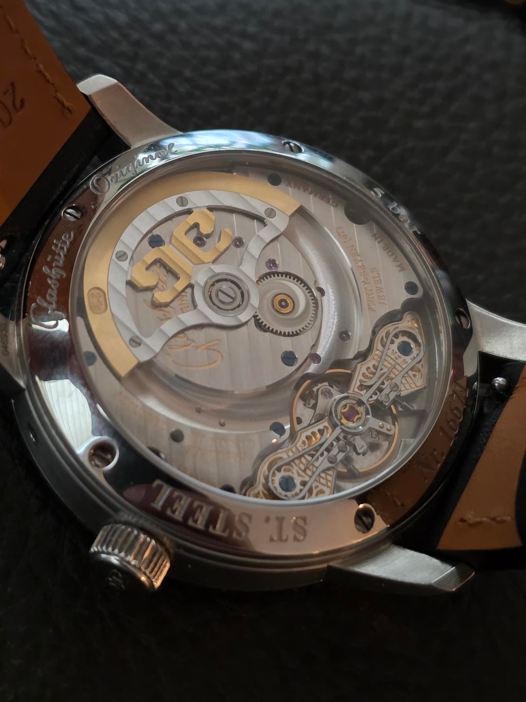 One of the best value for money high horologt watches with a beautiful movement showcasing hand finishing techniques. The dial is beautiful and has white gold hands and rhodium plated indices. This is the 40mm version and wears beautifully. Key features - 40mm Case and 47 lug to lug - large Panomatic date - Moonphase indicator - Glorious display back and movement, you would buy a loupe to enjoy this one. Watch only. Got it from watchex from a very famous seller here. Comes on AM leather strap + OEM deployant clasp. OEM grey crocodile strap is included but condition is fair. Priced at $6650+ label TV would be $7000 Open to interesting trades that are unique, no watches below 4k value please. Comment here and then PM me.