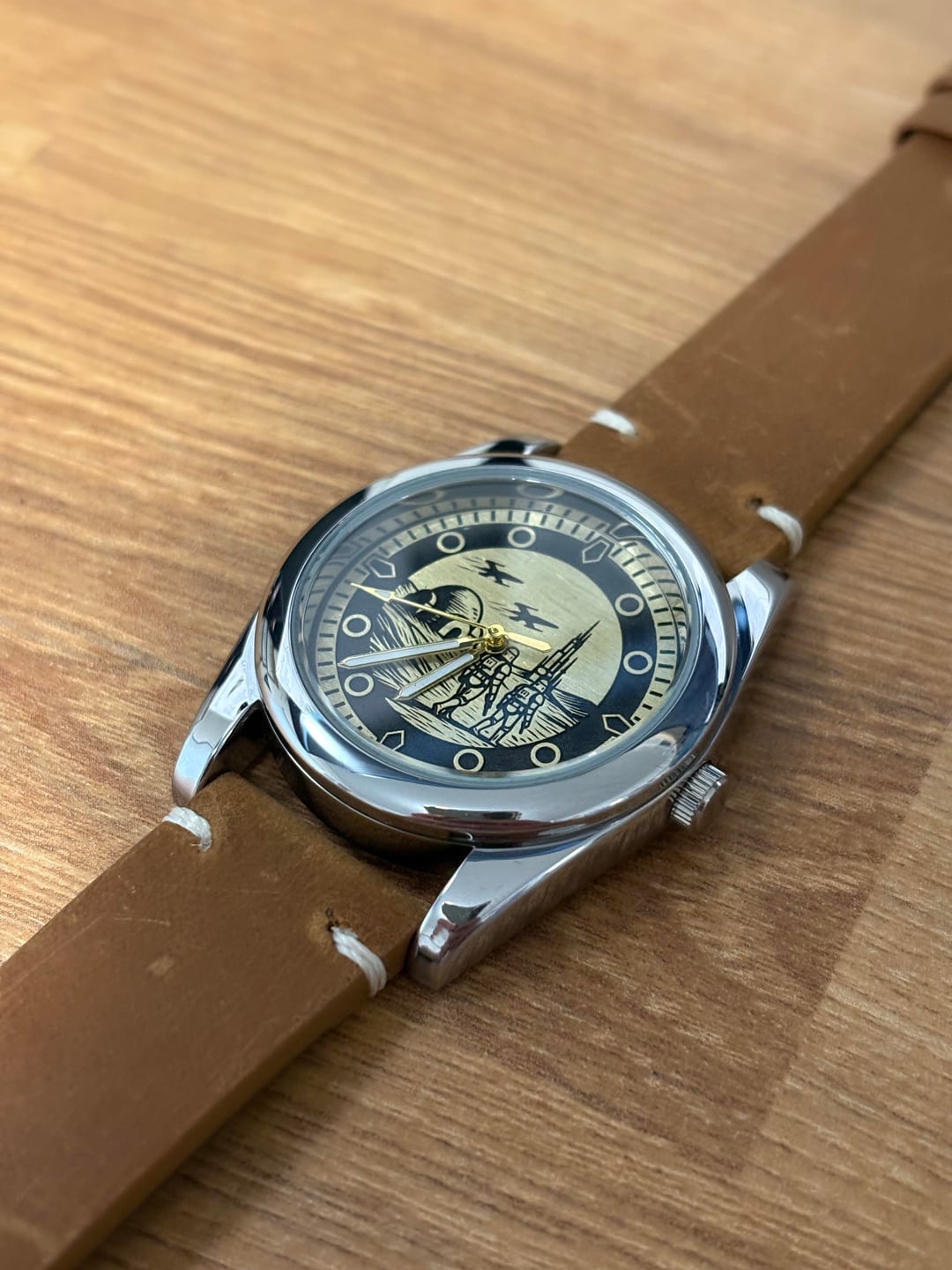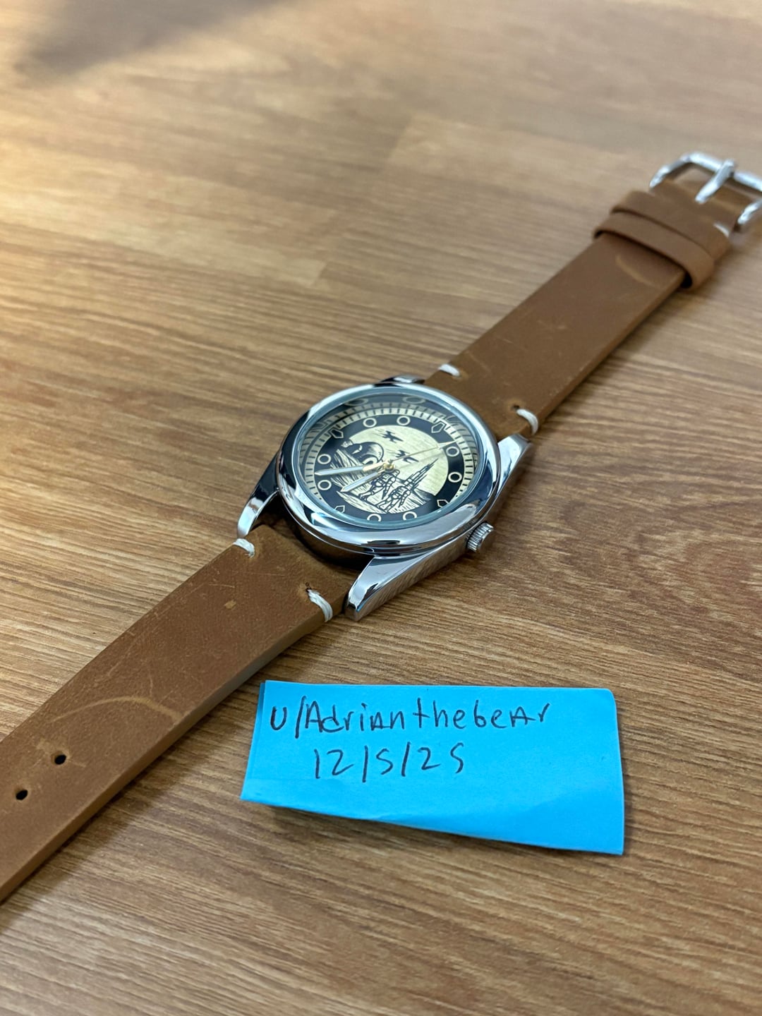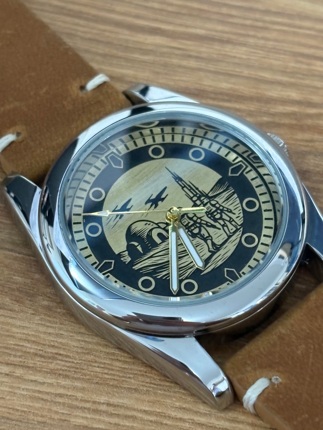 Hi WatchEx, Up for sale is a custom built Star Wars theme watch with a Star Wars scene depicting two Stormtroopers walking across a barren battlefield with a pair of X-Wing fighters flying overhead. These dials are cut from a sheet of jeweler’s brass using by laser, painted, hand-sanded and waxed. The case is a very slim 10mm by 37mm in diameter. Watch will come with a watch travel pouch for safe keeping. Specs: - Case: 37mm in diameter and 10mm thick - Glass: Sapphire Crystal - Movement: Seiko VH31 Quartz movement with a sweeping seconds hand. - Strap: 20mm brown leather strap - Condition: Brand new Price: $135 SHIPPED within US Like what you see and the watch sold? Happy to make you another or customize a different piece for you! Feel free to DM me for a commission or follow my page for more examples of my work in Instagram: https://www.instagram.com/avilawatchco?igsh=MXh5OXh2bDFjb3h3NQ%3D%3D&utm_source=qr