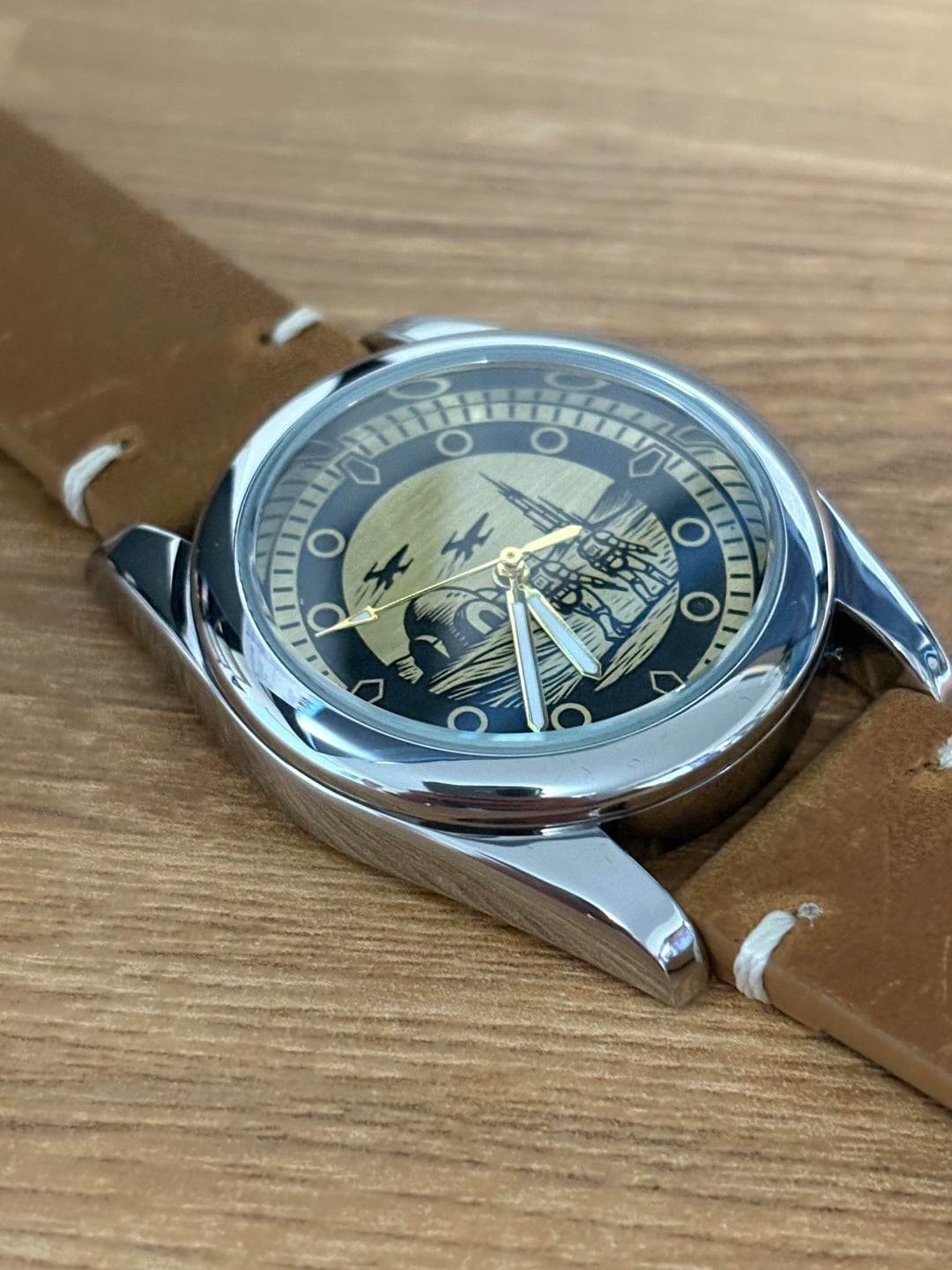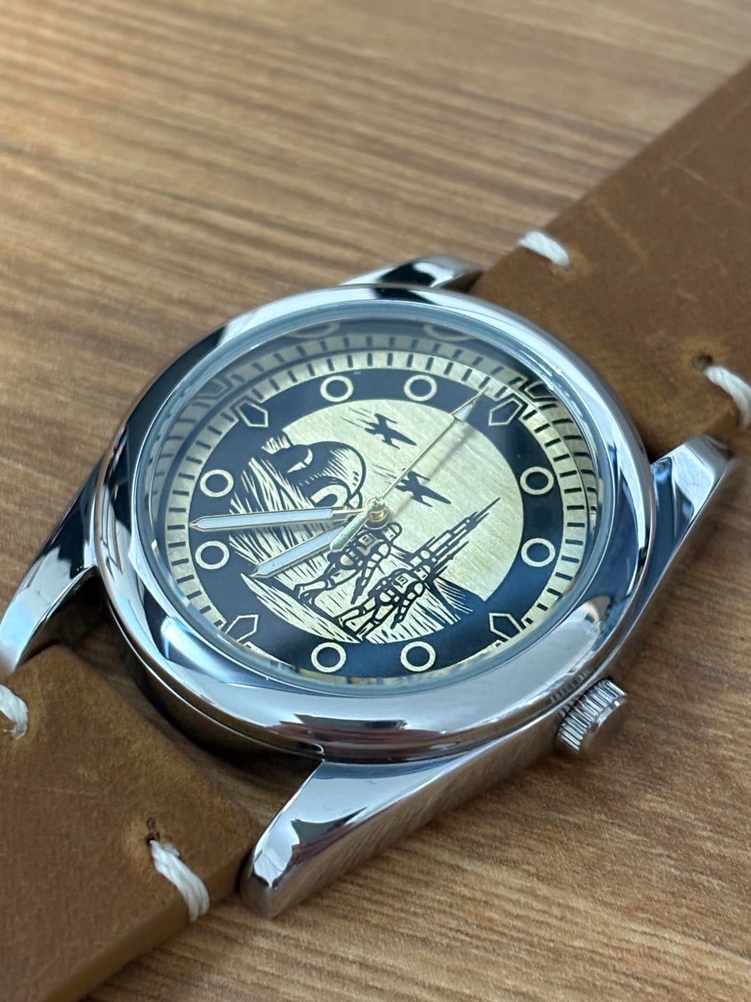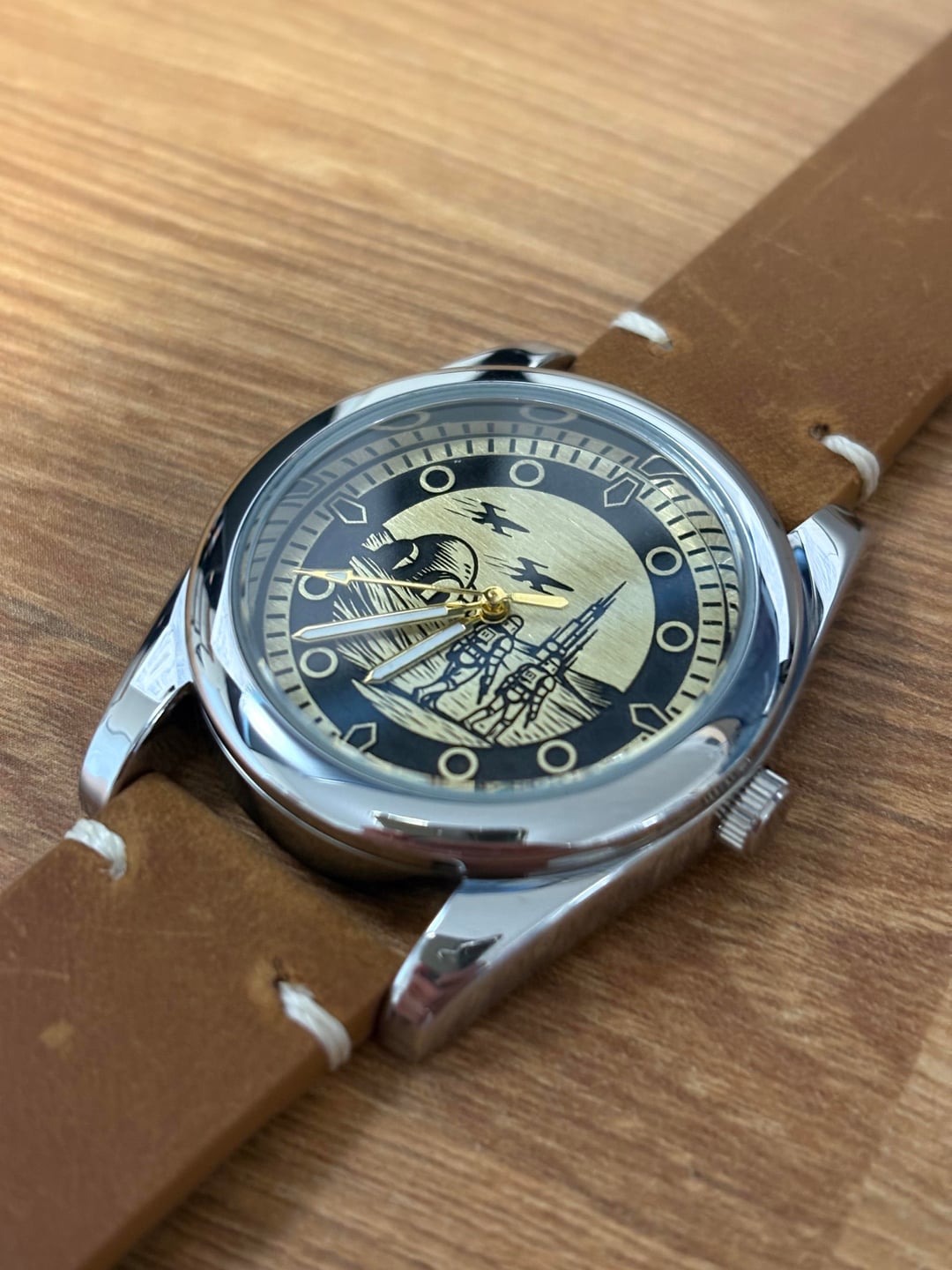 Hi WatchEx, Up for sale is a custom built Star Wars theme watch with a Star Wars scene depicting two Stormtroopers walking across a barren battlefield with a pair of X-Wing fighters flying overhead. These dials are cut from a sheet of jeweler’s brass using by laser, painted, hand-sanded and waxed. The case is a very slim 10mm by 37mm in diameter. Watch will come with a watch travel pouch for safe keeping. Specs: - Case: 37mm in diameter and 10mm thick - Glass: Sapphire Crystal - Movement: Seiko VH31 Quartz movement with a sweeping seconds hand. - Strap: 20mm brown leather strap - Condition: Brand new Price: $135 SHIPPED within US Like what you see and the watch sold? Happy to make you another or customize a different piece for you! Feel free to DM me for a commission or follow my page for more examples of my work in Instagram: https://www.instagram.com/avilawatchco?igsh=MXh5OXh2bDFjb3h3NQ%3D%3D&utm_source=qr