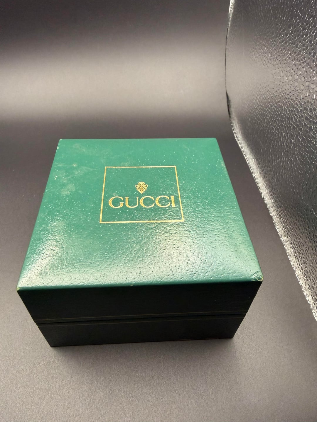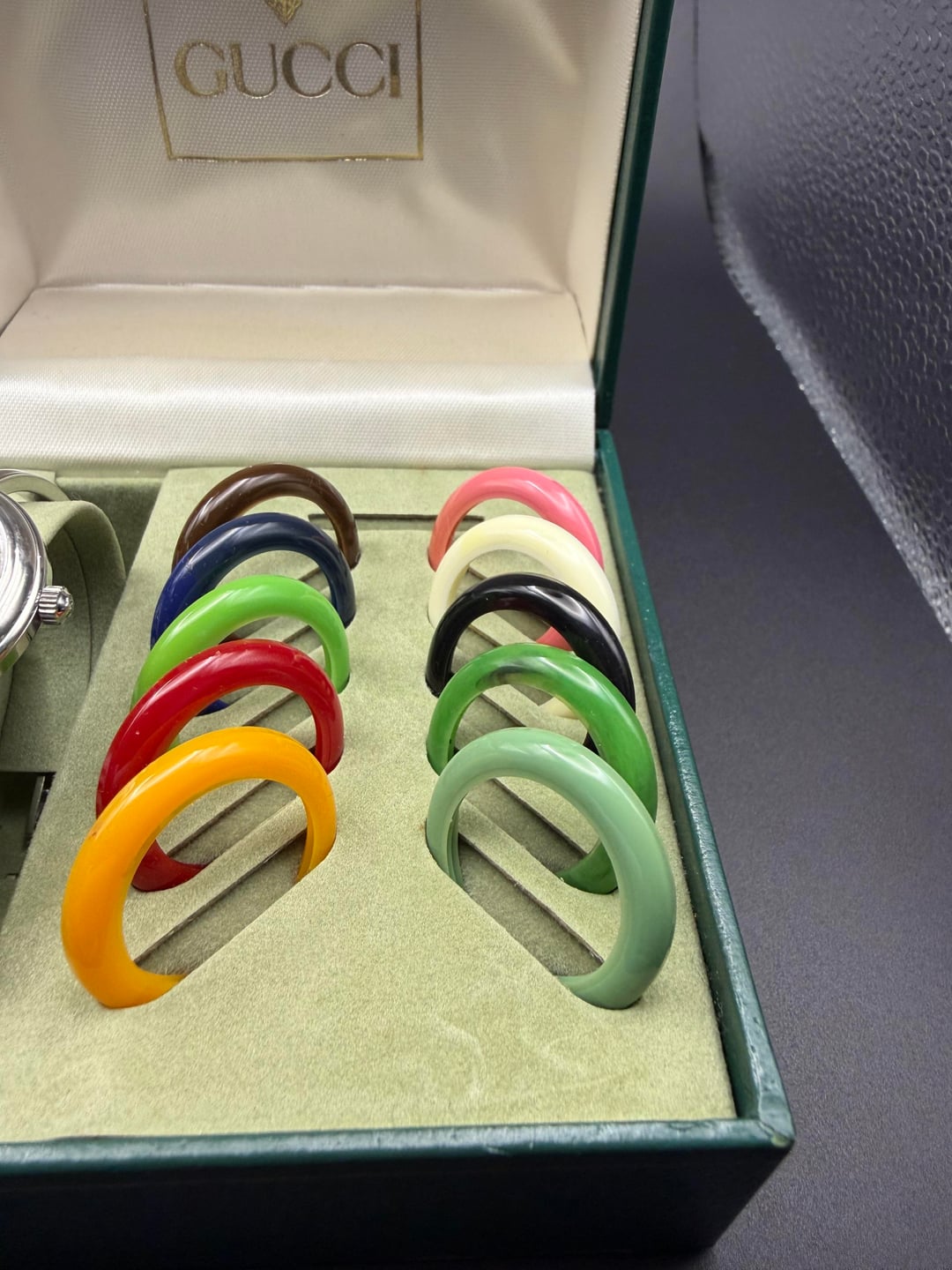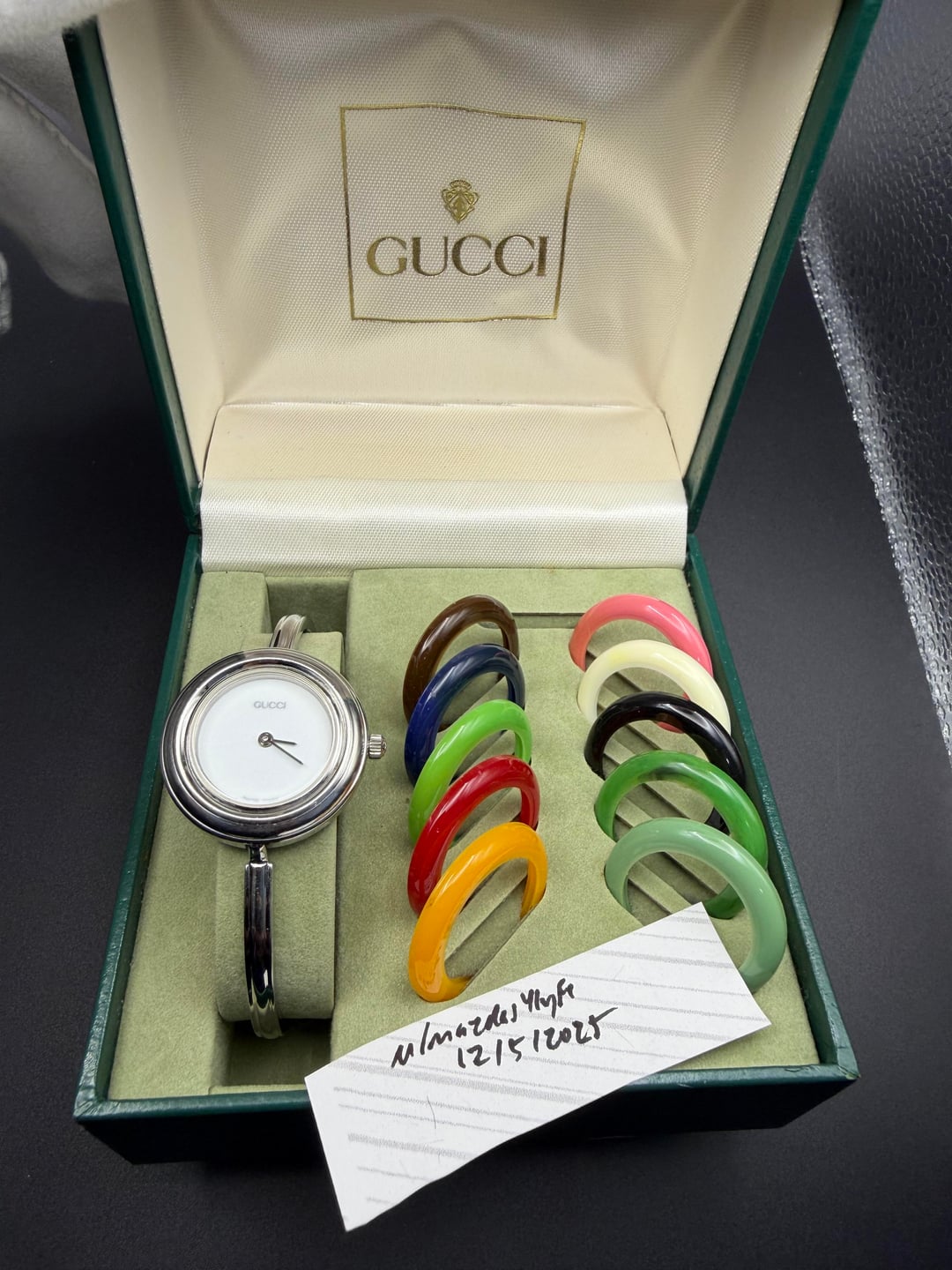 Selling vintage gucci 11/12.2 in box with full original colors bezel set. Watch has a brand new scratch free glass, new battery, and has been tested for good timekeeping. Condition on this one I would rate about 9/10, and it is a much rarer silver color (most of these are gold tone). Price for this set $599 shipped within USA. Also have more of this model, rice link style, gold tone, without box, different conditions, and different bezel colors, which may cost less depending on options. I also have watches without the box for cheaper.