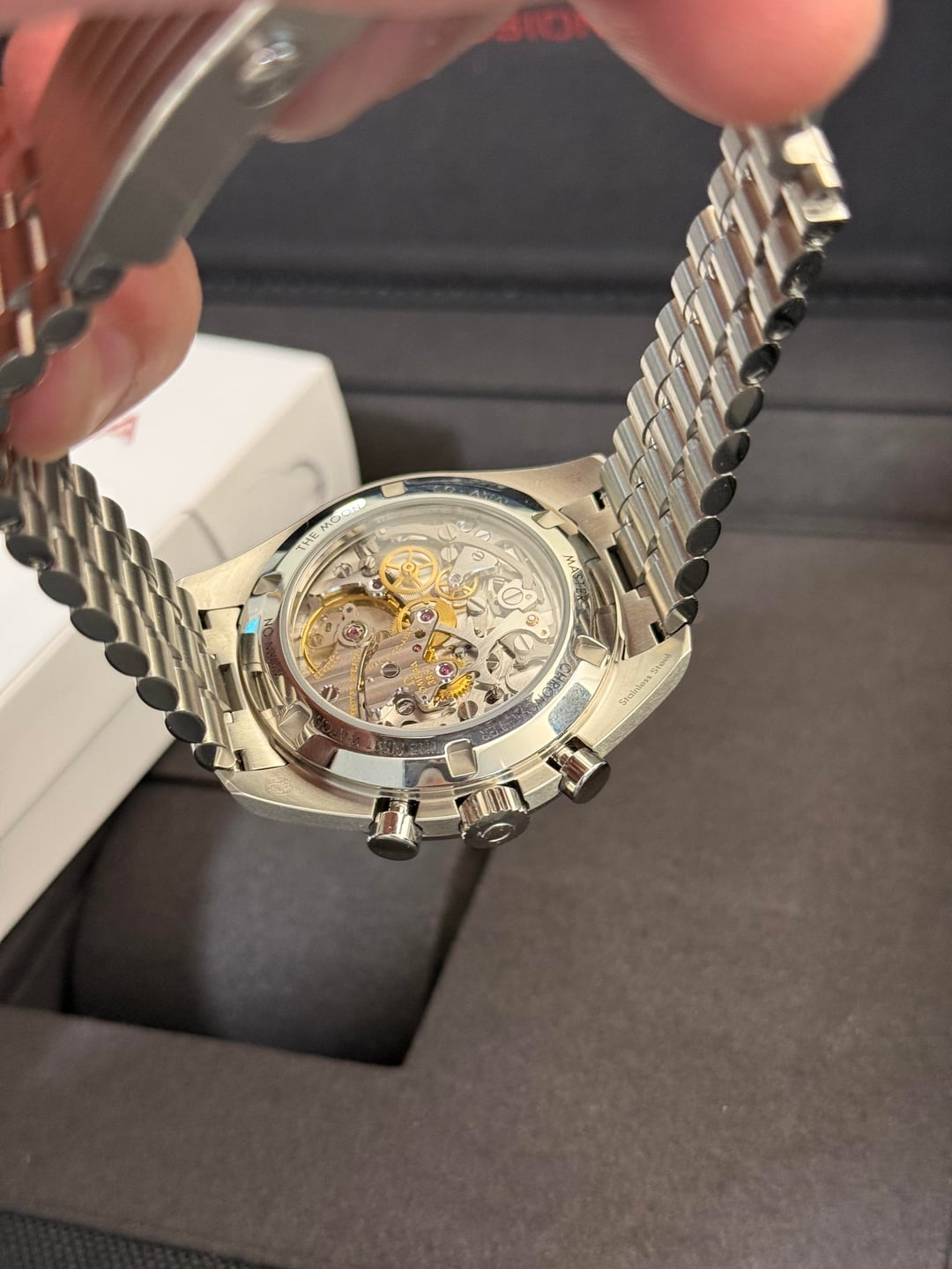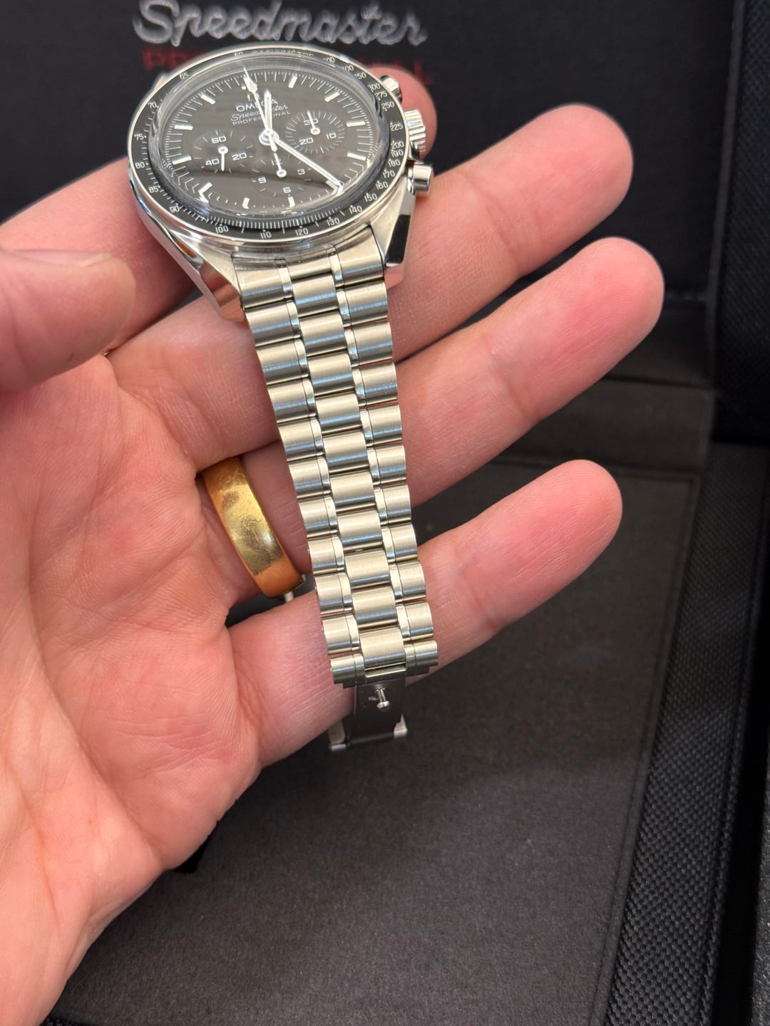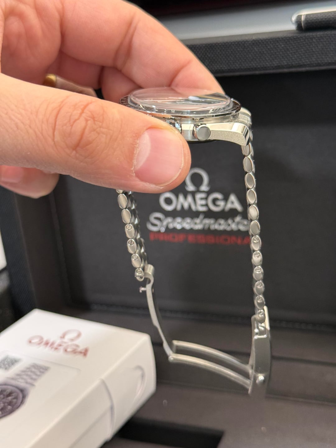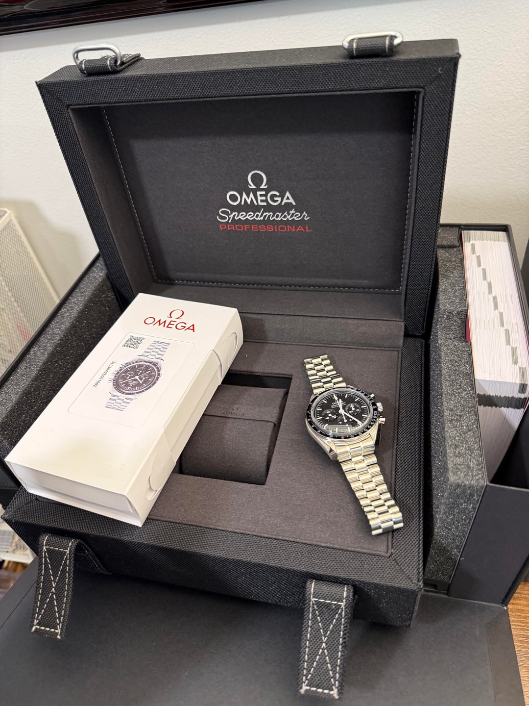 Up for sale is my Omega Speedmaster Professional “Sapphire Sandwich”, the latest generation with the Master Chronometer movement. This is reference 310.30.42.50.01.002. Condition • Very good condition • Worn only a handful of times • May have some light desk rash on the clasp • Minor, insignificant marks may be present from minimal wear • No major scratches, dings, or issues What’s Included • Full set: outer box, inner presentation box, cards, manual, hang tag, and all links • Warranty: US Authorized Dealer warranty card dated August 2025 Specs • Omega 3861 Master Chronometer movement • Sapphire crystal front and exhibition sapphire caseback Price $6,500 FIRM + your label • No trades • Zelle preferred Timestamp in last photo