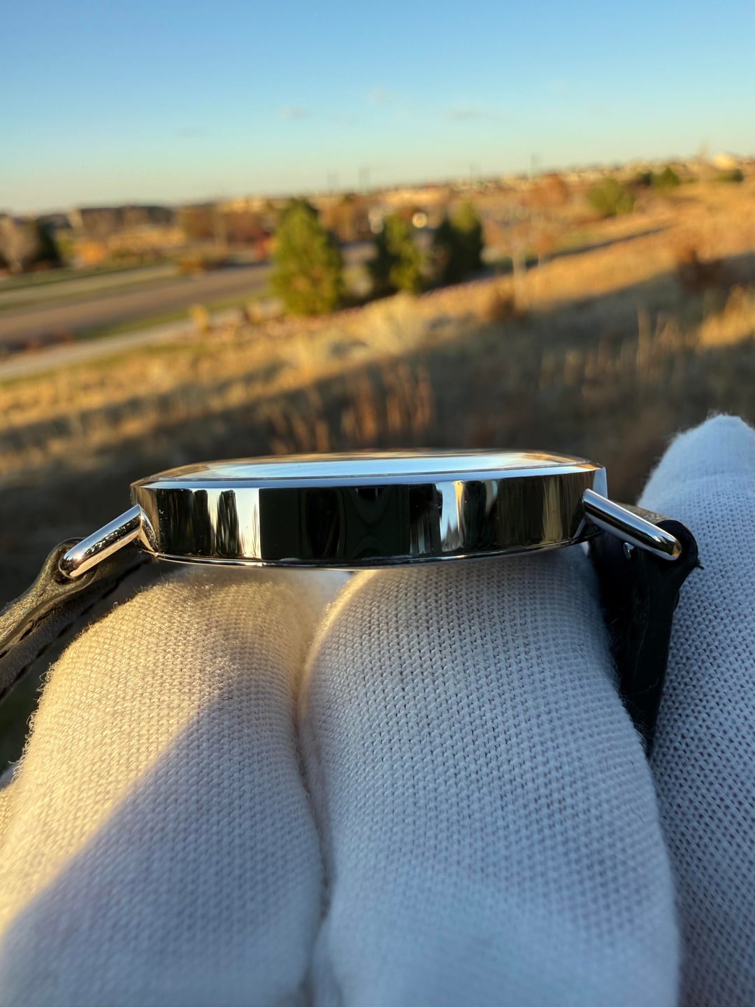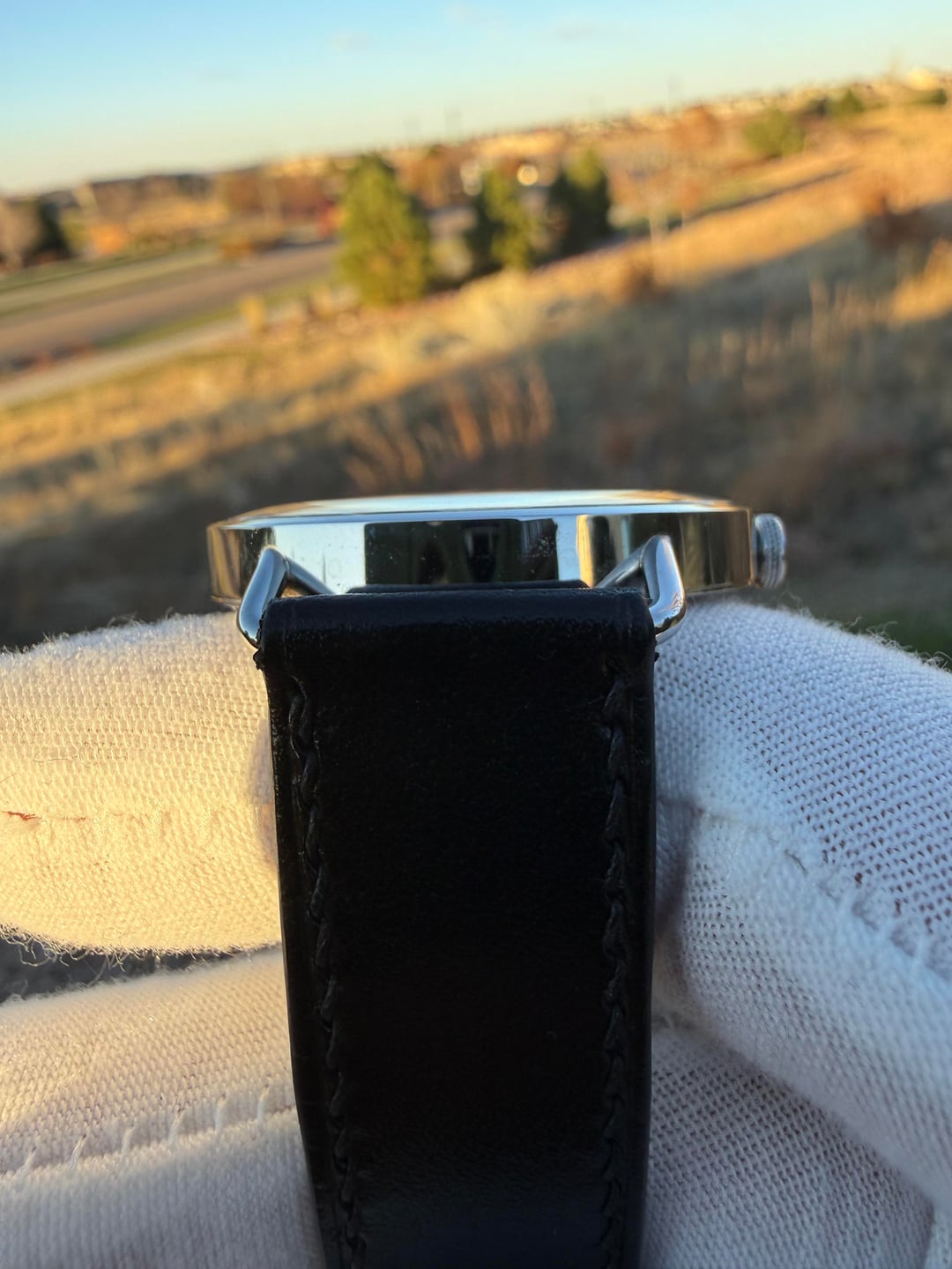 Up for sale is a Nomos Metro 38 in excellent overall condition. The watch shows minimal signs of wear and has been very well cared for. Runs flawlessly and keeps excellent time, as expected from Nomos’ in-house Alpha manual-wind movement. Details: • Model: Nomos Metro 38 • Reference: 1112 / 5356 • Case Size: 38 mm • Movement: Nomos Alpha manual-wind • Crystal: Sapphire front • Dial: Charcoal with signature Metro markers and mint accents • Strap: Original shell cordovan strap (one of the keepers is separated) also includes new high quality leather strap. Condition: The watch is in excellent condition with only very light hairlines from careful use. No major scratches, dings, or marks. Crystal is clean and clear. Winding is smooth and the watch runs strong. Includes: • Watch, box, leather holder, and papers Price: $1,399 Shipping: Will ship fully insured within the U.S. Signature required. Local pickup also welcome. Located in Denver metro. Notes: Beautiful minimalist piece from Nomos with the iconic Metro design — thin, lightweight, and extremely wearable. Feel free to reach out with any questions or for additional photos. Cheers!