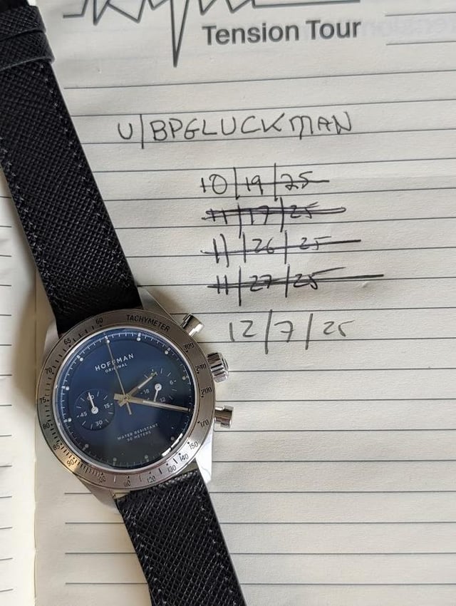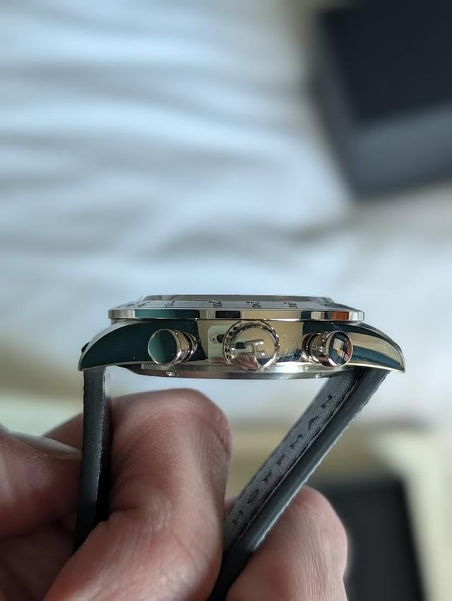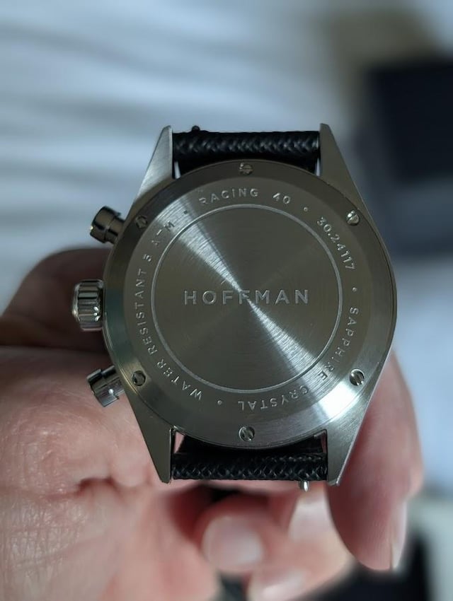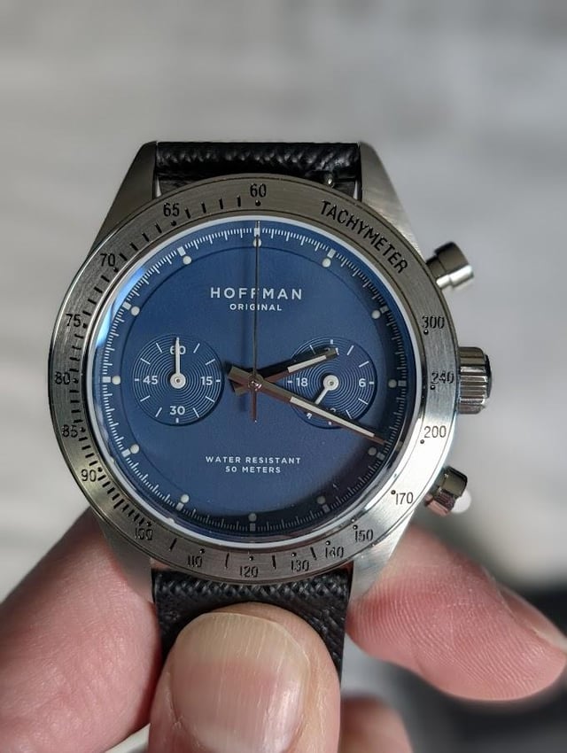 This Racing 40 chronograph from Chicago-based microbrand Hoffman a catch-and-release for me, as it's only been worn once, and never on the original strap, so no scratches or marks on the case. Watch is the discontinued navy-and-silver colorway on a black Saffiano leather strap. Key specs are as follows: * Width 40mm x length 48mm x thickness 12mm * Chronograph. Caliber VK64 mechanical quartz movement * 5 ATM / 50 meters water resistance Asking **$139 negotiable**, shipping through USPS within the US, payment either via PayPal F&F or Zelle. Please add $20 for PayPal G&S.