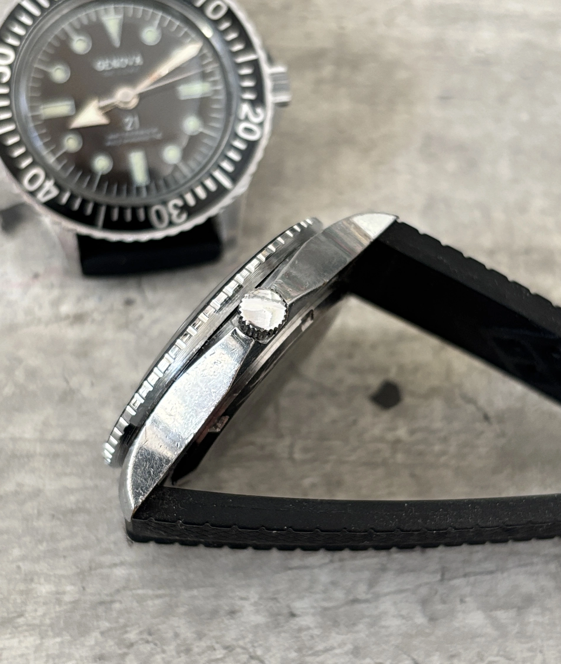 I am selling a pair of 1960’s Genova DeLuxe 21 Diver watches. These are both powered by Baumgartner BFG-866 manual wind movements. They are a great size at 40mm w/out crown and have 20mm lugs. Both are fitted on rubber divers straps. Bezels on both turn freely.