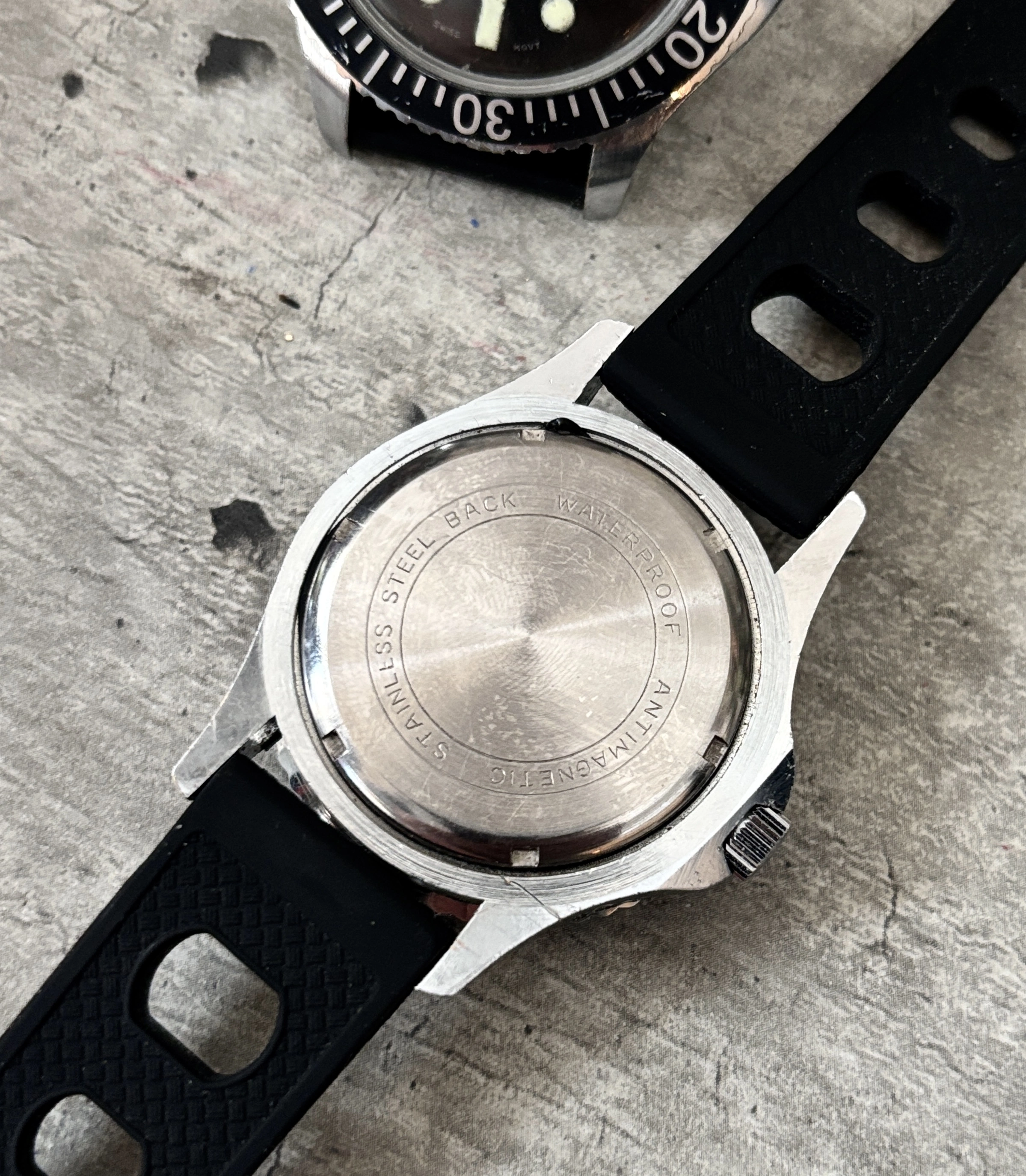 NO DATE dial watch would likely be later 1960’s. Watch has a clean glossy black dial, sharp white script and classic layout. Who doesn’t love a no date diver!