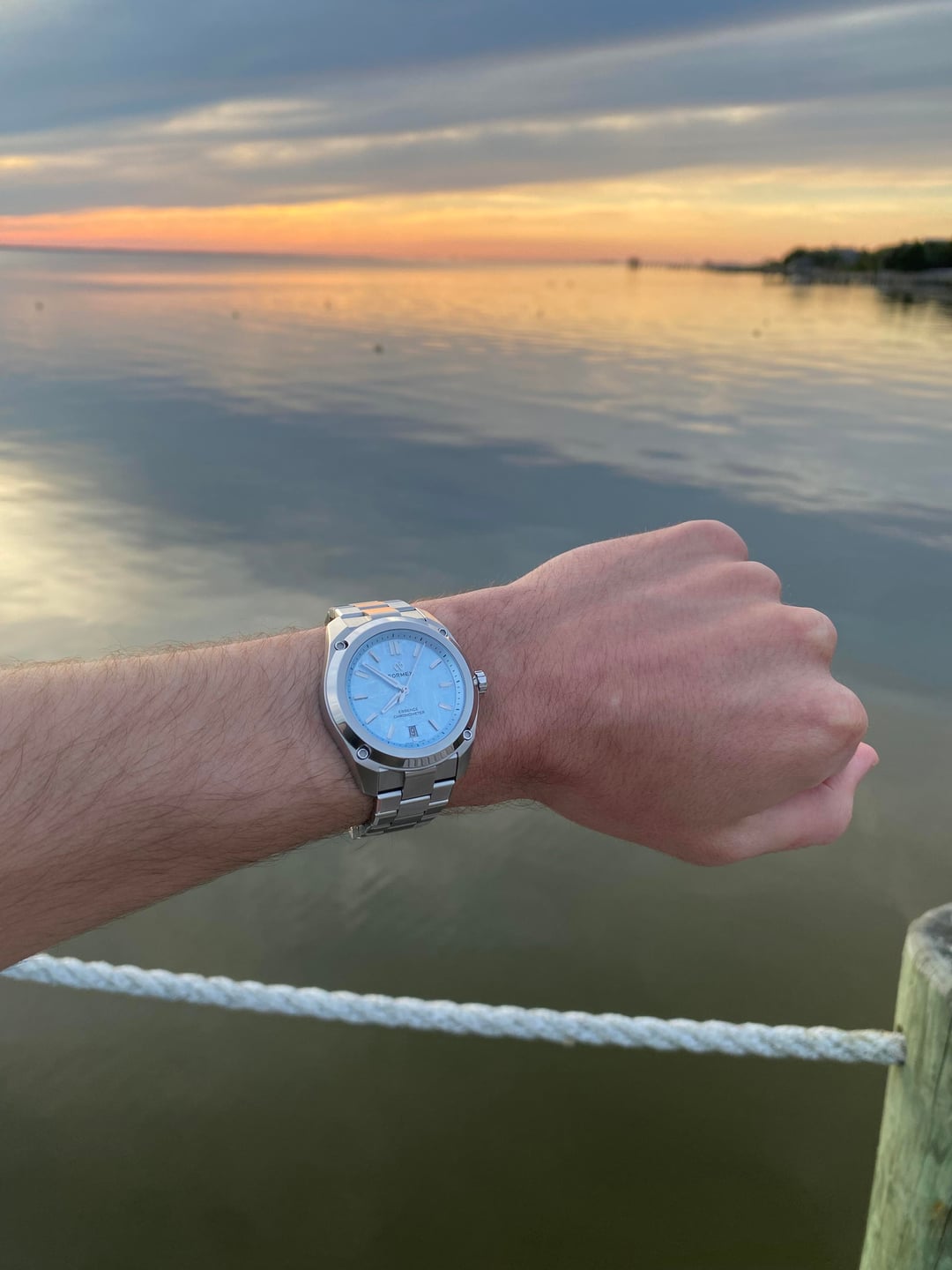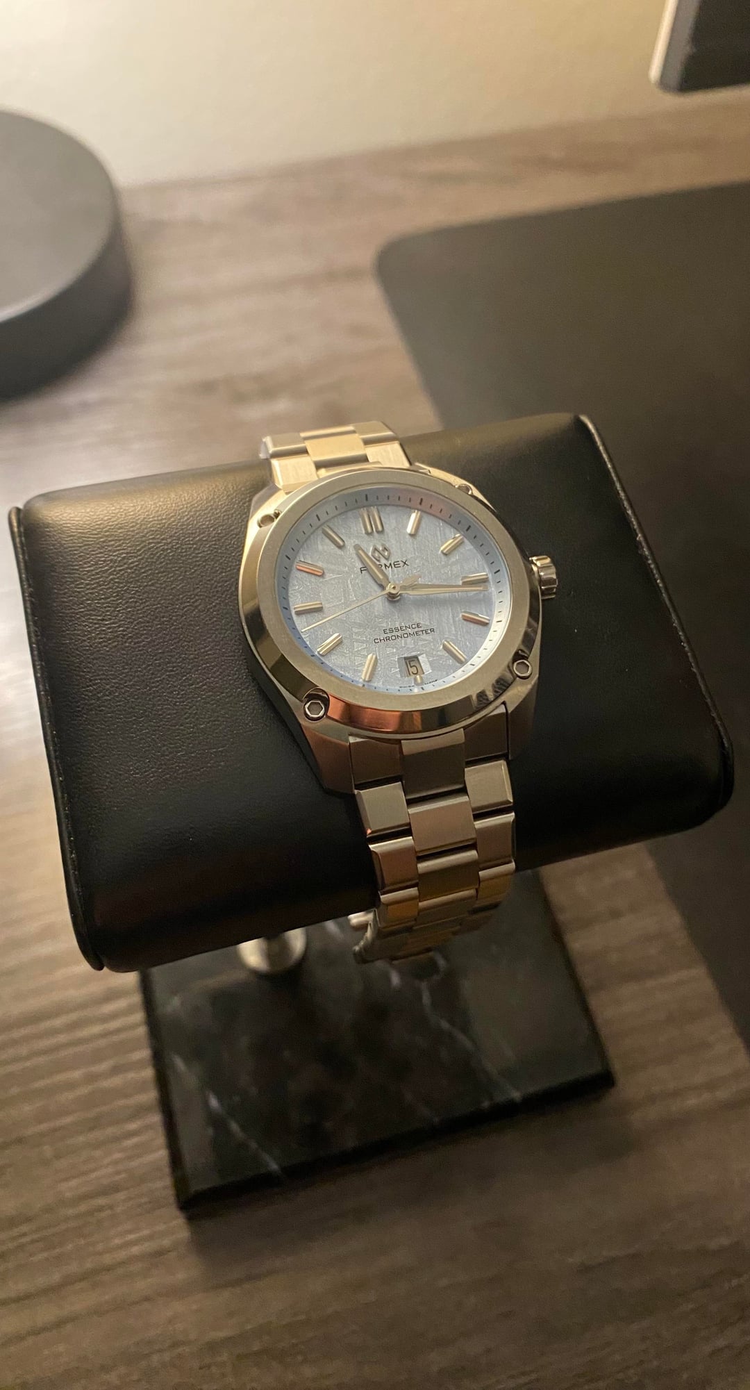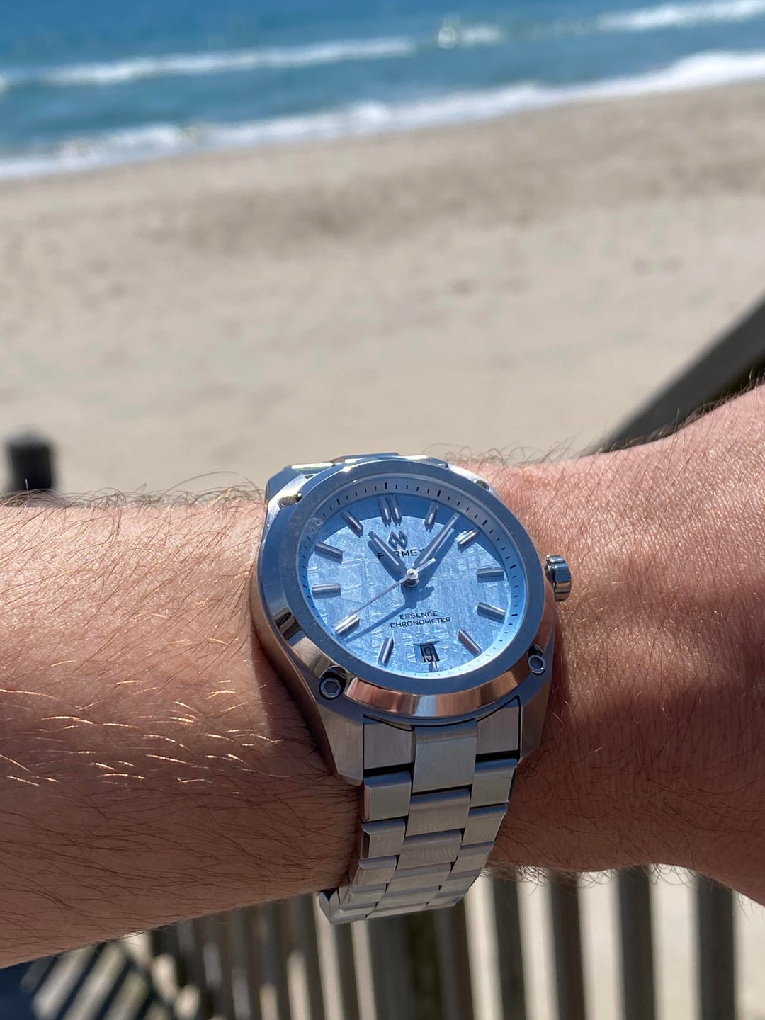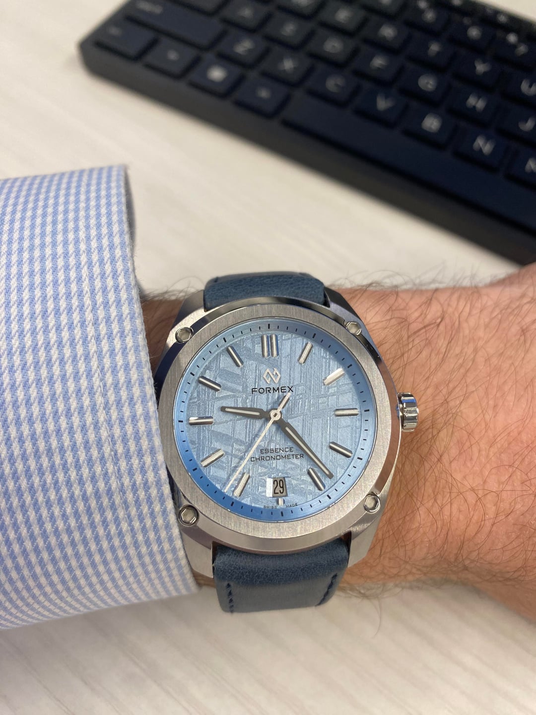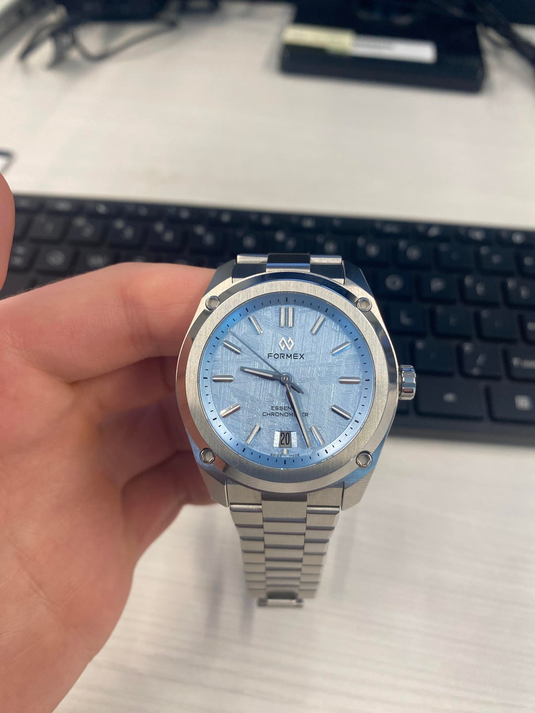 Formex Essence Space Glacier 39mm Purchased 2025 only 100 pieces created Box and papers included with warranty Includes additional formex blue strap with deploant clasp Looking to sell for $2,200 Minimal scratches from wear this year. Keeps time within COSC (cosc papers included) Best value meteorite dial on the market ☄️