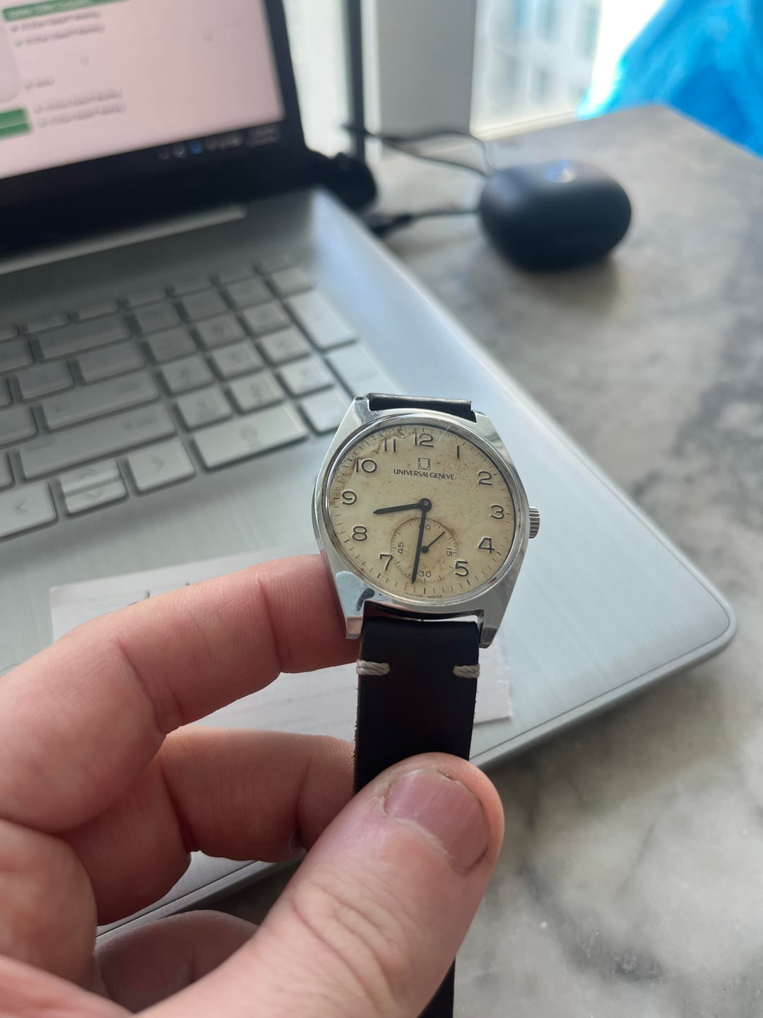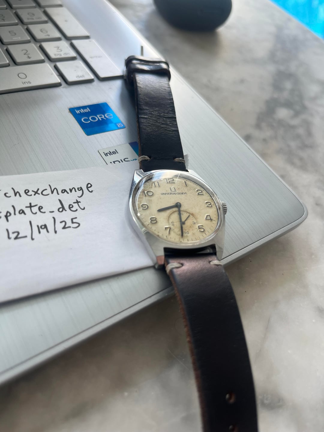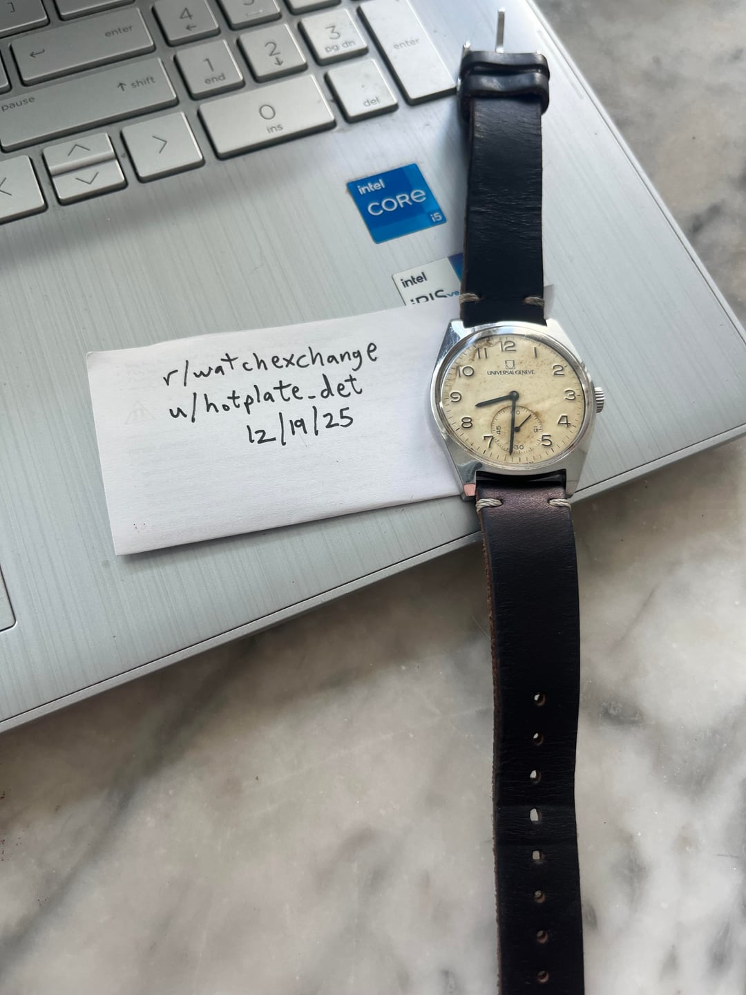 Some history on this amazing Italian railway watch- [https://www.fratellowatches.com/a-close-look-at-my-vintage-universal-geneve-ferrovie-dello-stato-fs/#gref](https://www.fratellowatches.com/a-close-look-at-my-vintage-universal-geneve-ferrovie-dello-stato-fs/#gref) This example appears to be the harder to find first series made (35mm slimmer case, not including crown). The enamel dial has some clear areas of damage from around the 9 c'clock-12 o'clock area, but timekeeping and winding is excellent (the previous owner had it serviced within the past year). Cushion case and caseback are in good condition. Universal Genève fitted these watches with its caliber 64, a non-hacking movement Very legible dial with arabic numerals raised off the dial. Comes on a very comfortable black leather strap. Asking $320 OBO shipped CONUS only