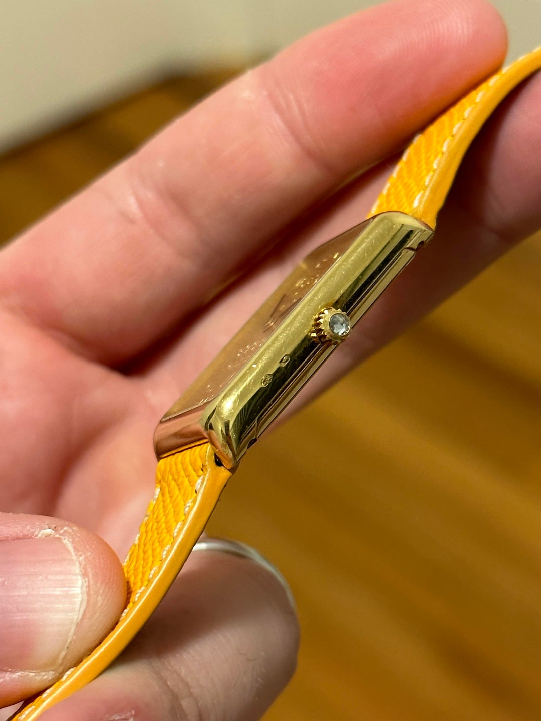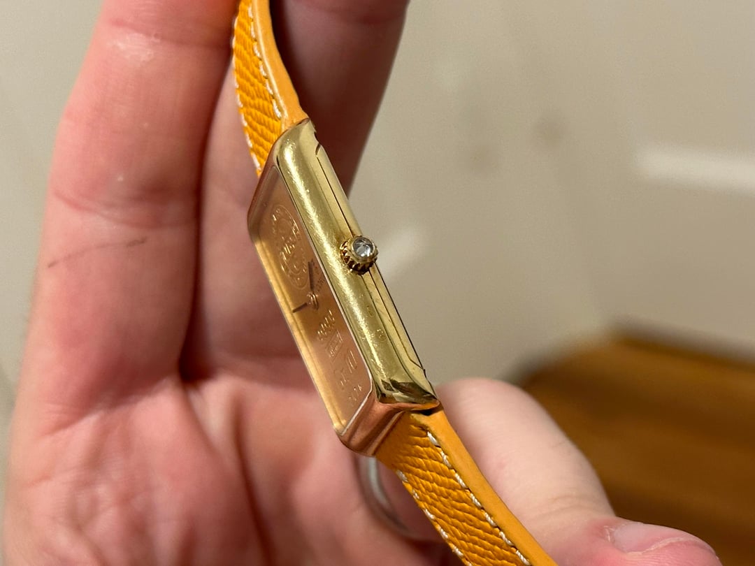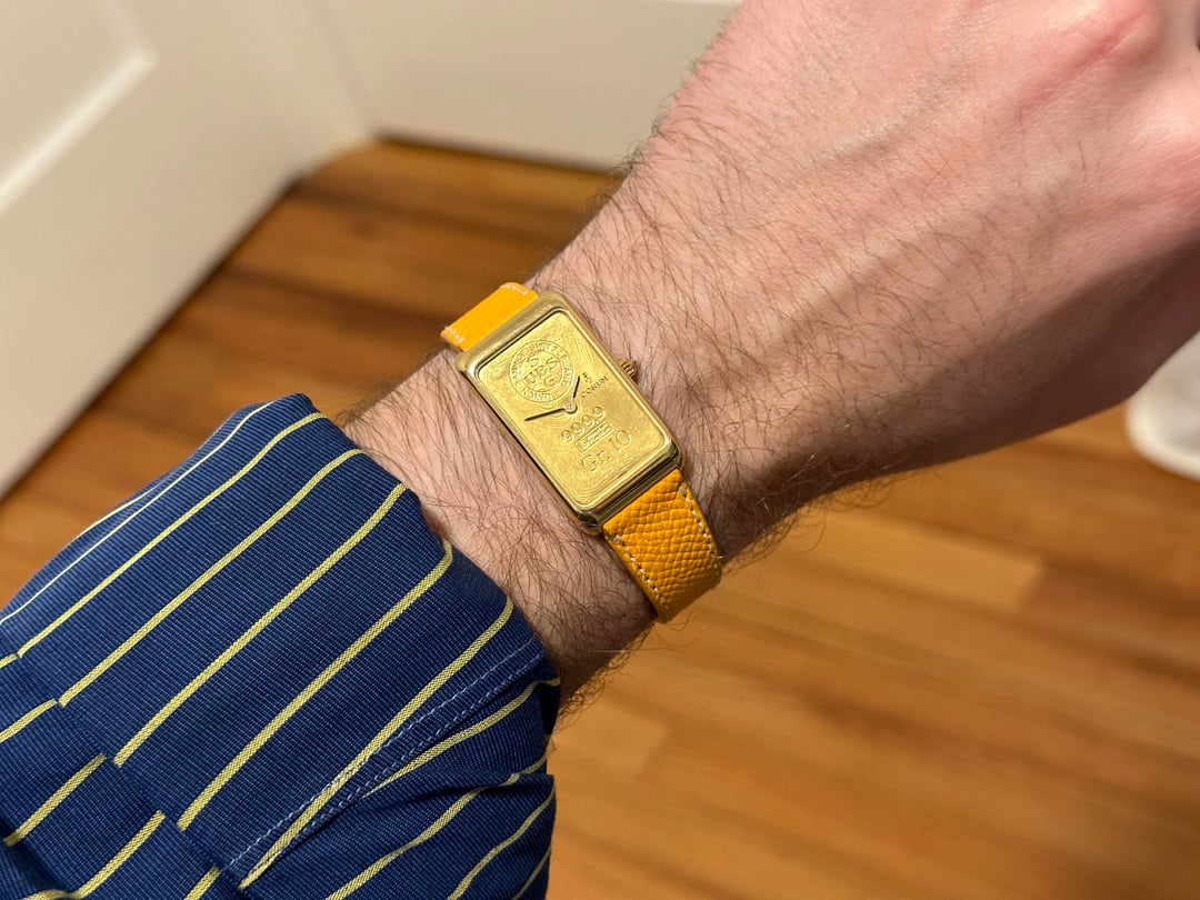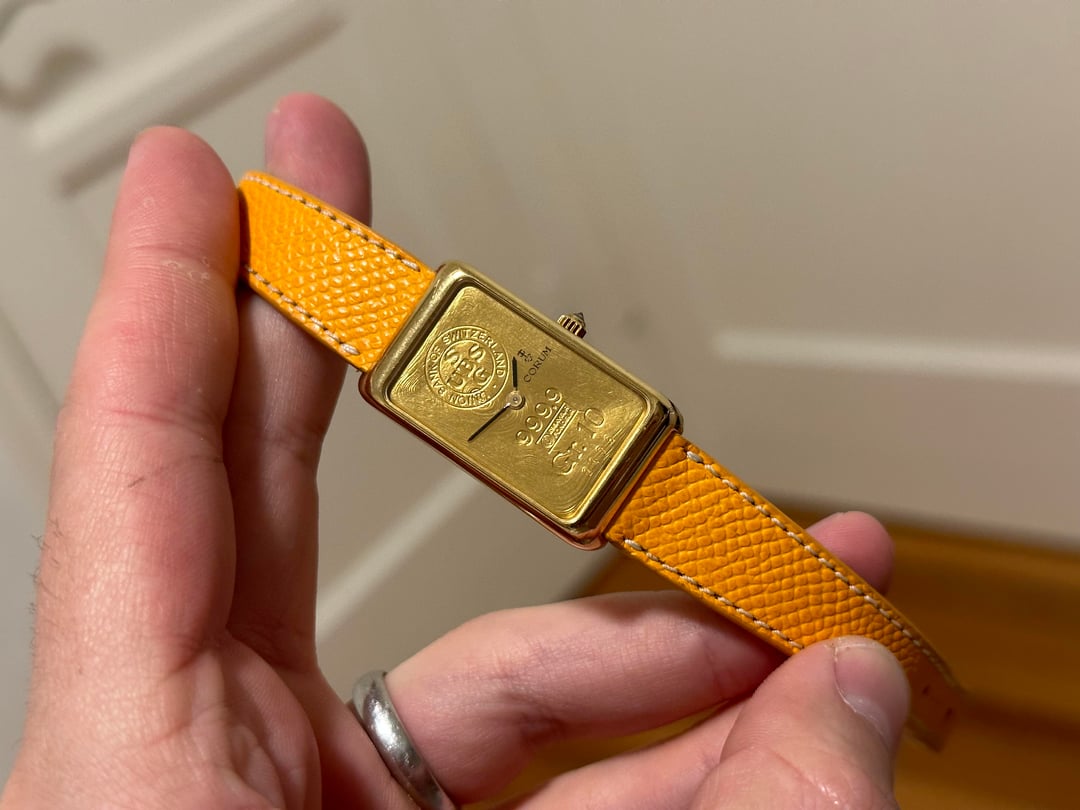 Gold prices recently hit all time highs. Why buy gold and throw it in the safe when instead you can wear it on your wrist? Now you can with this Corum ingot watch. The watch is in fantastic shape. The 18k gold case is generally free of any marks or significant wear. The hallmarks are visible both on the side of the case and on the case back. The 18k case back has started to show patina and tone, with the gold developing a purplish hue. The watch dial is a 24k 10g gold Bank of Switzerland ingot. The watch features a manual wind movement, which is turned by the diamond studded crown. The watch measures in at 35mm long and 21mm wide. It is about 7mm thick. The total weight of this watch is 33.89. The watch comes on a custom leather veblenist strap and contains a Corum buckle. **Price:** $2,999 but open to reasonable offers **Timestamp:** in photos **Videos:** I can send a video of the watch through my instagram, @WarmDials **Payment and Shipping:** to be agreed upon by the buyer and myself, taking the buyer's purchase history into consideration. I'm located in the United States and frequent user in this community. I have bought and sold often, and I'm happy to answer any questions you may have / provide more photos or a video. You can find me on instagram at @WarmDials. Don't hesitate to reach out if you have any questions or want to chat