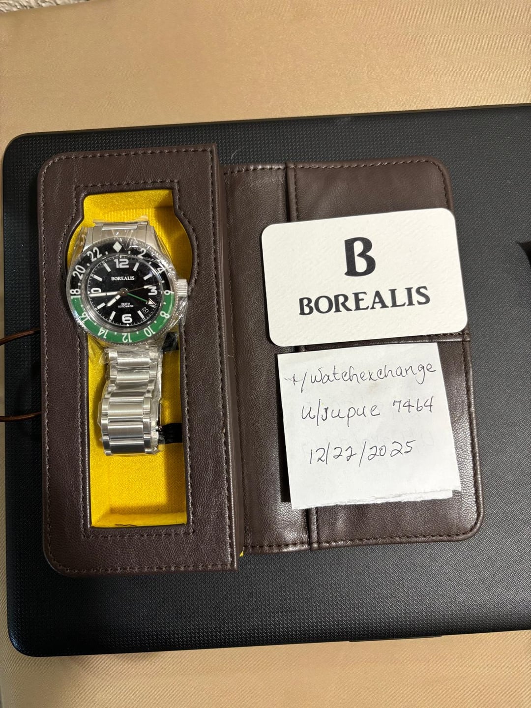 Offering this up at the reduced steal price of only $165 plus $13 for CONUS shipping via USPS Priority. Watch is in like new overall cosmetic condition with no gouges, deep scratches, or dents. Crystal is also clean; stickers are still on the watch. This appears to be a full-kit with the leather carrying case and card seen in the last pic but pls confirm for yourself if this is important to you. https://www.borealiswatch.com/en-gb/products/borealis-sea-storm-mk2-gmt-version-bi-green-black-bezel-date?variant=42012866412700 This is being sold as-is with no warranty or returns expressed or implied. Thanks for your consideration and please let me know if you have any additional questions or requests as I'm happy to oblige.