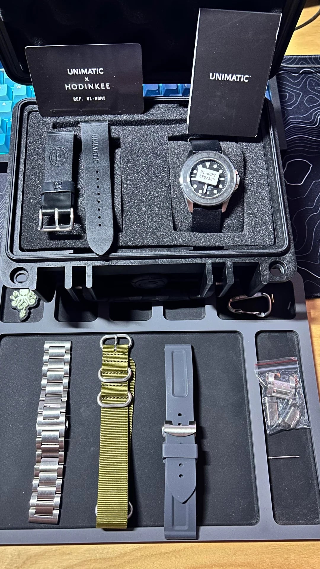 Downsizing my watch collection, I'm not looking for trades and not shipping internationally. This will be double posted on my other account [u/GreyPatinaSoul](https://www.reddit.com/user/GreyPatinaSoul/) **Asking $1350 Shipped CONUS**. Like many of my watches I take care of em really well this is like new with the original stickers and even original box they shipped to me. I've included like $200 worth of straps along with it. The lowest price one is in the UK but you will need to pay for VAT upon receiving. I've priced it pretty fairly. Included with the watch: *-OEM Horween Unimatic Leather strap (I never even put on.)* *-Oyster Bracelet (extra links and spring bars)* *-Green NATO Strap* *-Gray Panerai style with clasp* \_\_\_\_\_\_\_\_\_\_\_\_\_\_\_\_\_\_\_\_\_\_\_\_\_\_\_\_\_\_\_\_\_\_\_\_\_\_\_\_\_\_\_\_\_\_\_\_\_\_\_\_\_\_\_\_\_\_\_\_\_\_\_\_\_\_\_ **Specs from Unimatic:** U1-HGMT Edition of 500Ref: UWK-U1-HGMT The first UNIMATIC GMT – created exclusively for HODINKEE. Based on the original Modello Uno dive watch, the new U1-HGMT features a unidirectional bezel, graduated for 24 hours, with a grey GMT hand that can be independently adjusted in 24-hour increments to indicate a second time-zone. The caseback is engraved with a custom display highlighting the world’s 24 major time zones. * *Swiss Movement Sellita SW330-2* * *11% slimmer case* * *Drilled lugs* * *First Unimatic GMT reference*