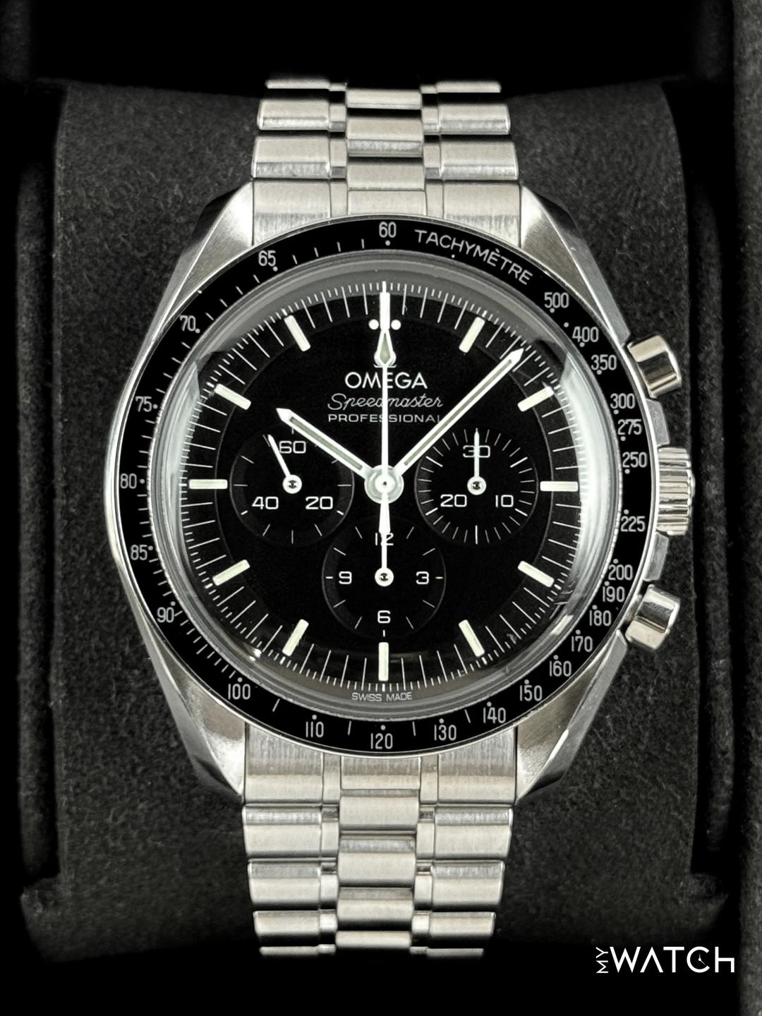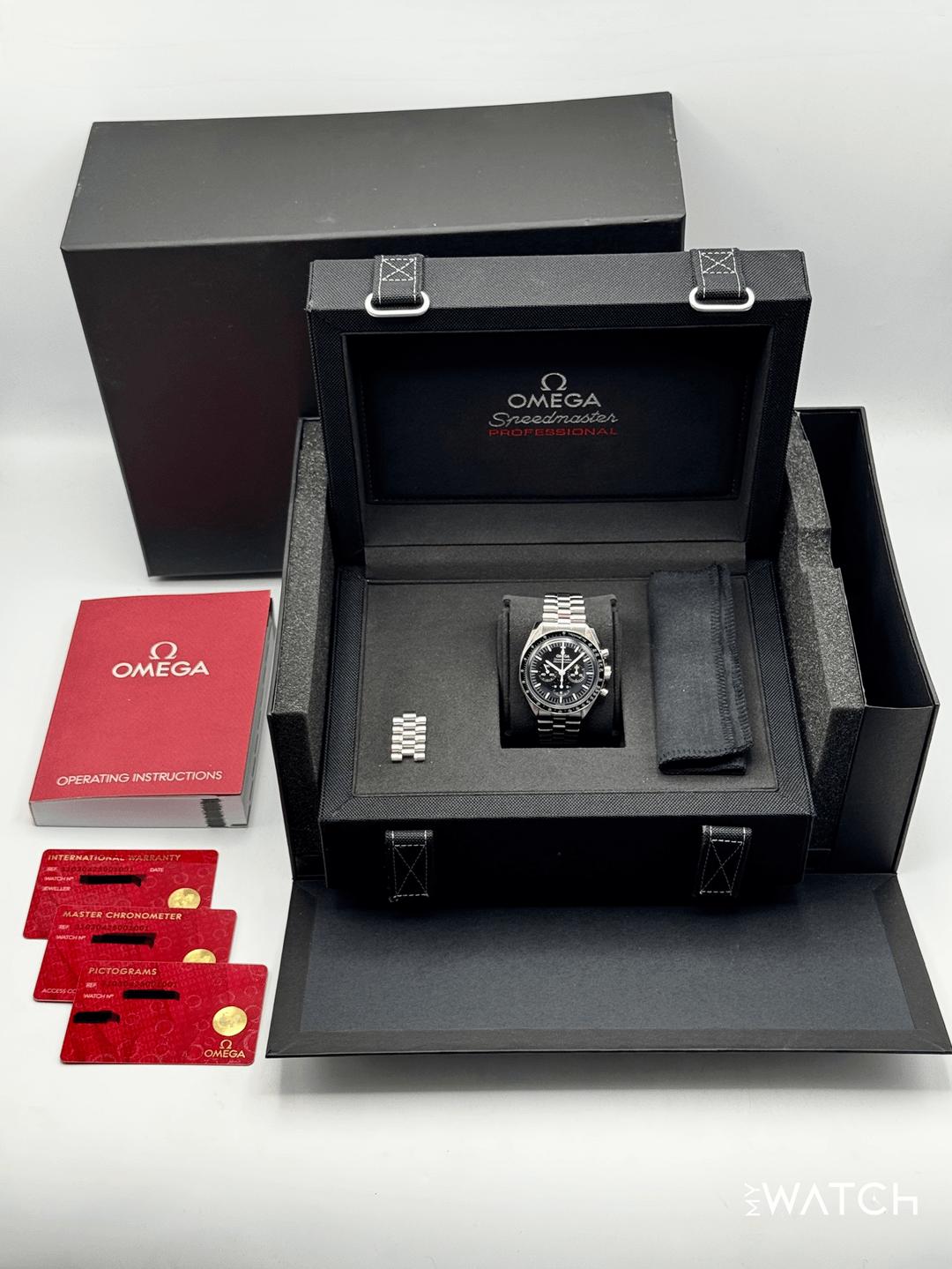 🔵**2024 Omega Speedmaster Moonwatch Chronograph 42mm 310.30.42.50.01.001 Stainless Steel Black Dial with Hesalite Crystal** 🔵**TRADE or SELL us your luxury watch, all brands considered. Message me details.** **Includes the following:** **✔️Original Double Omega boxed** **✔️Box and Papers - Yes** **✔️International Warranty card** **✔️5 year manufacturer warranty** **✔️Master Chronometer and Pictograms Cards** **✔️Operating Instructions** **✔️Legendary Moonwatch Booklet** **✔️Cleaning Cloth** **✔️Hesalite crystal** **✔️Size: 8.0inch wrist (Full Links)** **✔️Bracelet: Stainless Steel with Foldover clasp with comfort setting** **✔️Watch is in excellent overall condition. Please see photos for details.** **✔️**[**Trades**](https://mywatchllc.com/pages/sell-rolex-watch) **welcome** Business Name: **My Watch LLC** LOCATION: Oak Park, Michigan ✔️[MyWatchLLC.com](http://mywatchllc.com/) for current inventory ✔️Google Business Listing [https://g.co/kgs/Cmd6FPW](https://g.co/kgs/Cmd6FPW) ✔️Business Hours M-F 9-6 ✔️Facetime/Video chat/calls welcome to view the watch interested. ✔️Contact: 248-422-0909 via text or call for quickest response. 🟢TERMS: Visit [MyWatchLLC.Com](http://mywatchllc.com/) for payments accepted 🟢REFERENCES/REVIEWS: We are well reviewed on all platforms from google, trust pilot, rolexforums, additionally we have 300+ reference in multiple FaceBook watch groups, reference checks welcome. 🟢SHIPPING: If you are not local, we offer Fully Insured FedEx overnight shipping in the USA for a fee. International shipping available. [https://mywatchllc.com/products/2024-omega-42mm-310-30-42-50-01-001-speedmaster-moonwatch](https://mywatchllc.com/products/2024-omega-42mm-310-30-42-50-01-001-speedmaster-moonwatch)