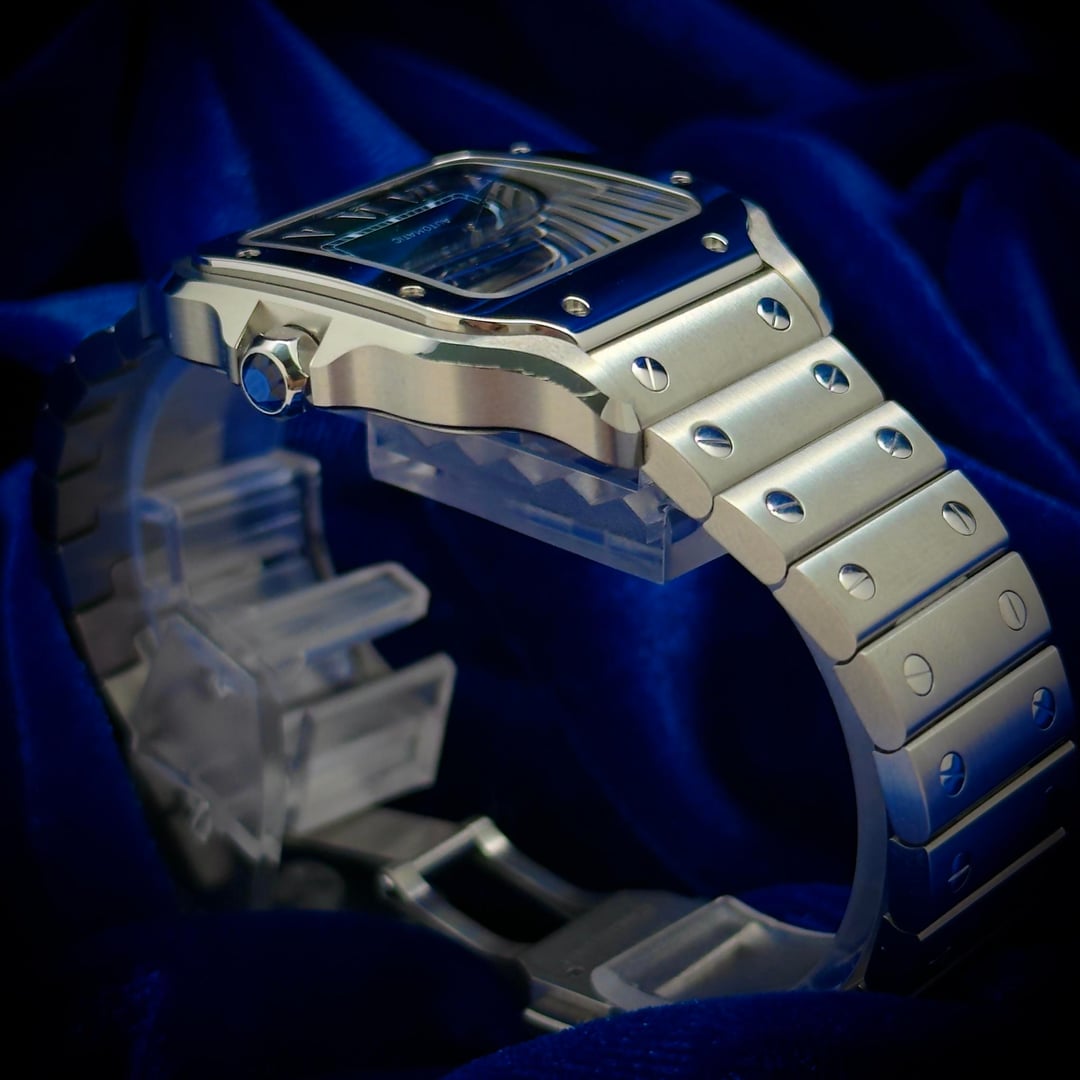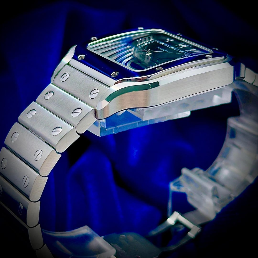 Cartier Santos Medium Quartz Stainless Steel Roman Dial Blue Leather Watch