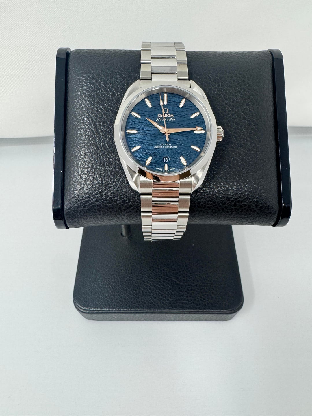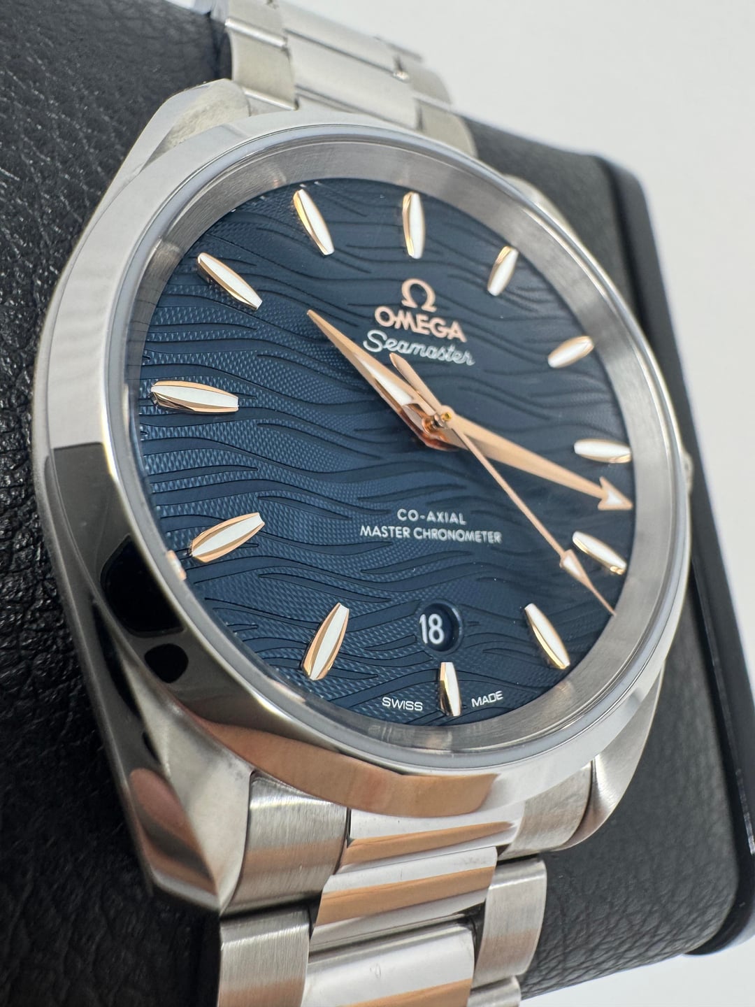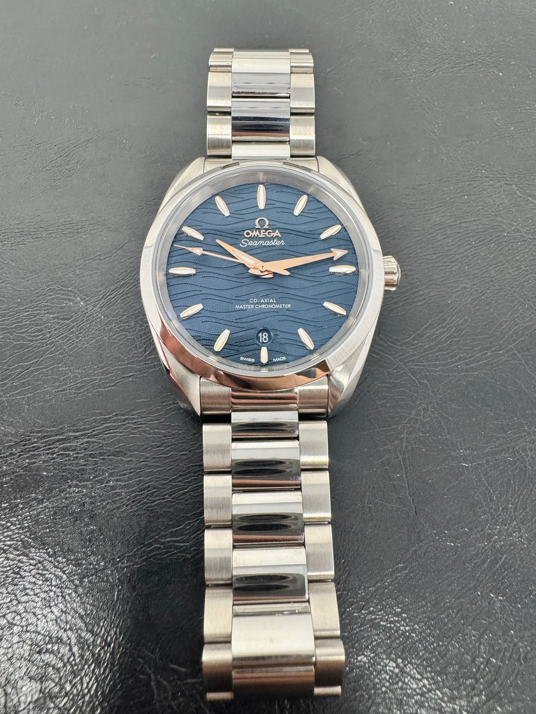 Hi everyone, letting go of my Omega Seamaster Aqua Terra. This is the stunning 38mm version with the deep blue "wave-pattern" dial and Omega's Master Chronometer Calibre 8800. Perfect all-rounder sporty enough for everyday wear but clean and elegant for dressier occasions. Model: Omega Seamaster Aqua Terra 150M Reference: 220.10.38.20.03.002 Case Size: 38mm Dial: Blue wave-pattern dial, 18K Sedna-gold hands/indices Movement: Co-Axial Master Chronometer Cal. 8800, 55-hour power reserve Crystal: Sapphire front + exhibition case back Bracelet: OEM stainless steel bracelet with polished/brushed finish Condition LNIB What's Included Full kit: box, cards, booklet, cards holder Price $4800 Shipping: CONUS