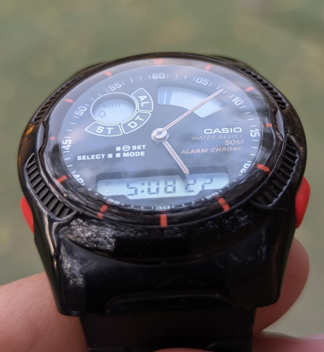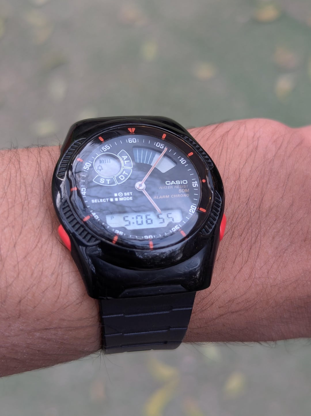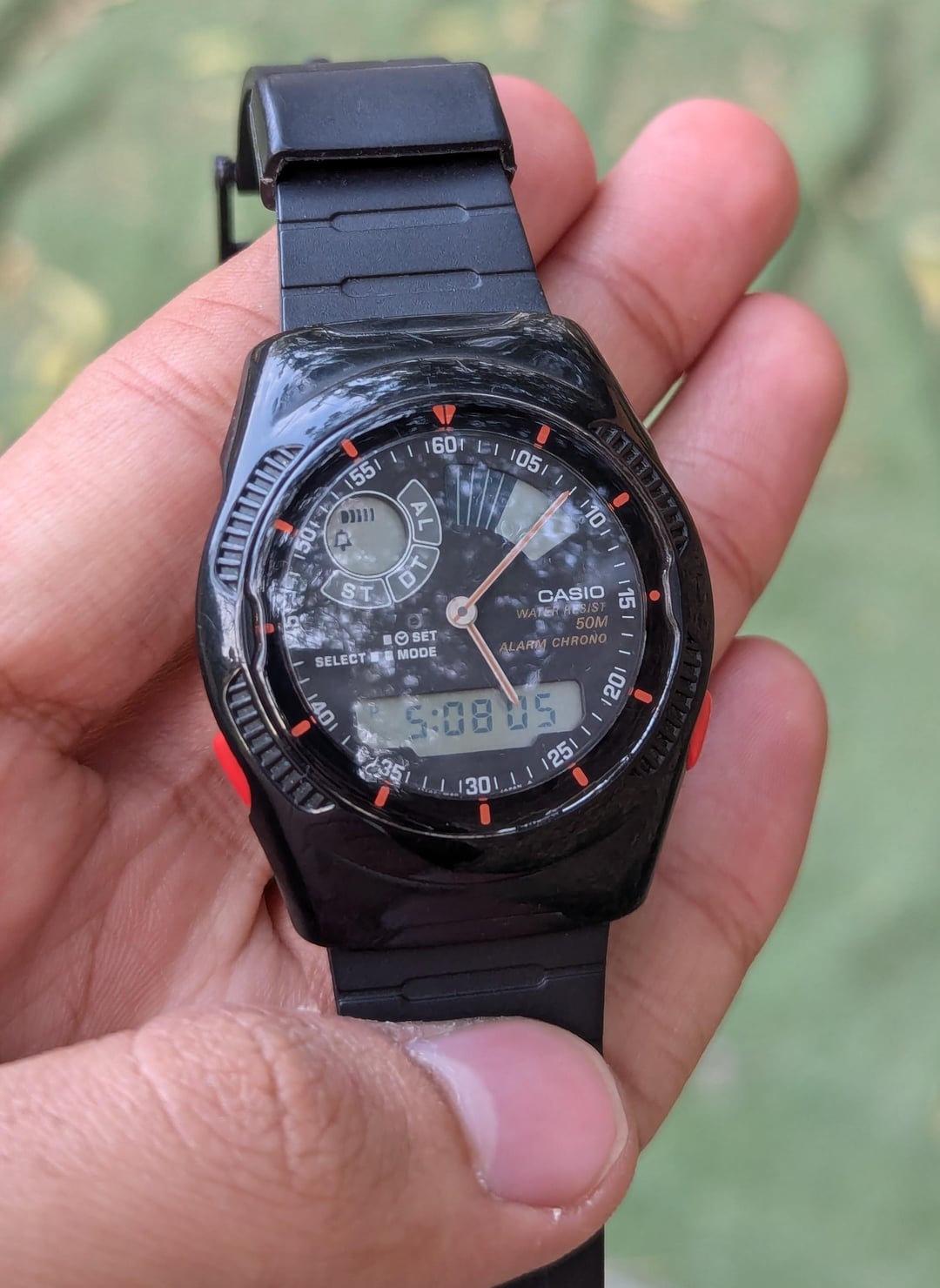 Up for sale here is a rare/very rare (from what I've seen) Casio AW-38 module [747]. It has a very stealthy look with red hour markers, Darth Vader vibes for sure. It has a dual time display Analog hands + Digital LCD. Stopwatch (1/100 sec), Daily Alarm, Hourly Chime, Day/Date Calendar. It has a Black plastic/resin case with an acrylic crystal. The condition of the watch is 9/10. The watch is fully functional. The crystal is domed and in very good condition considering the age of the watch. The price of the watch is 150$. The watch will be shipped via FedEx! *The watch comes with an after market box* Thank you!