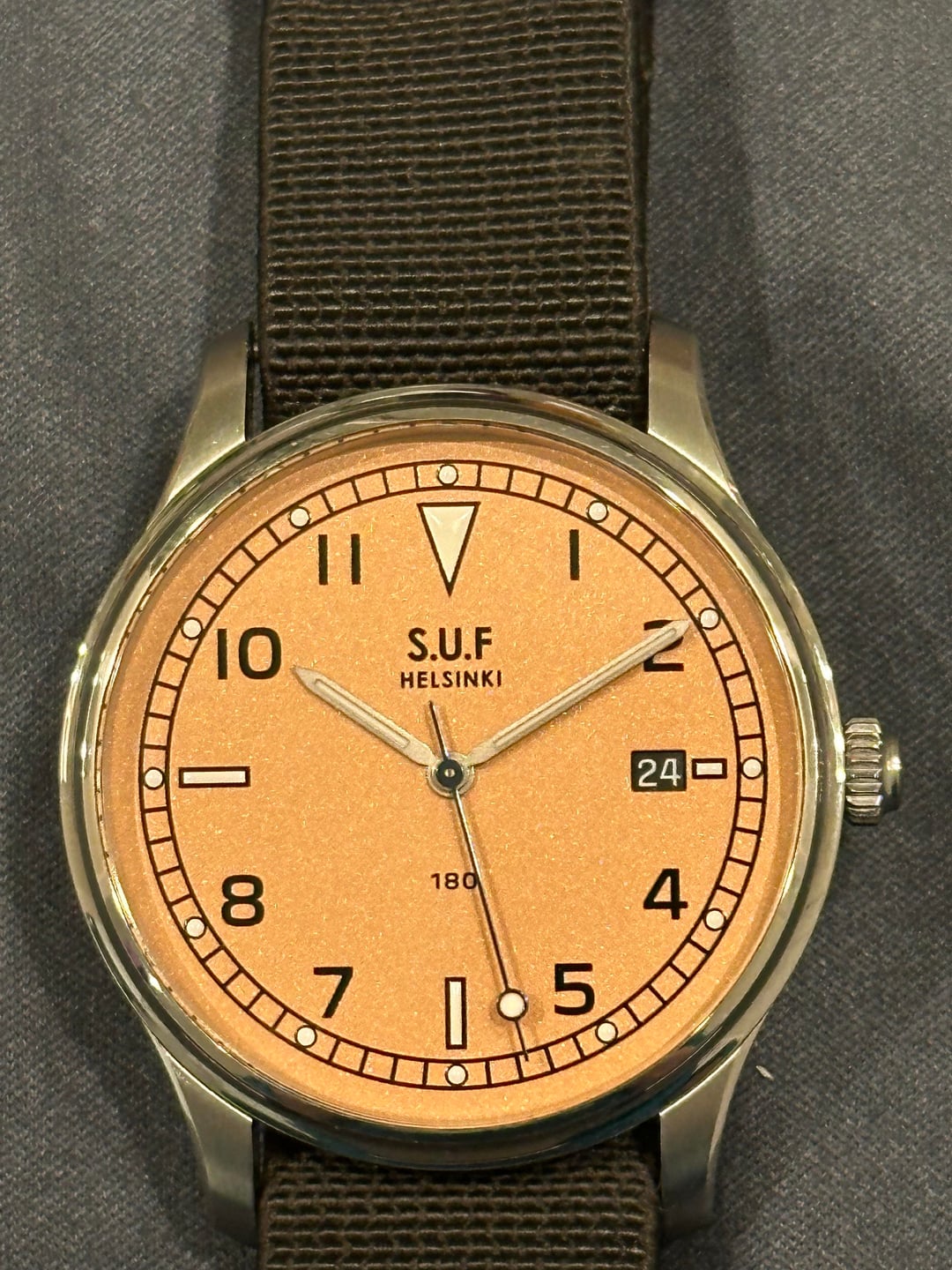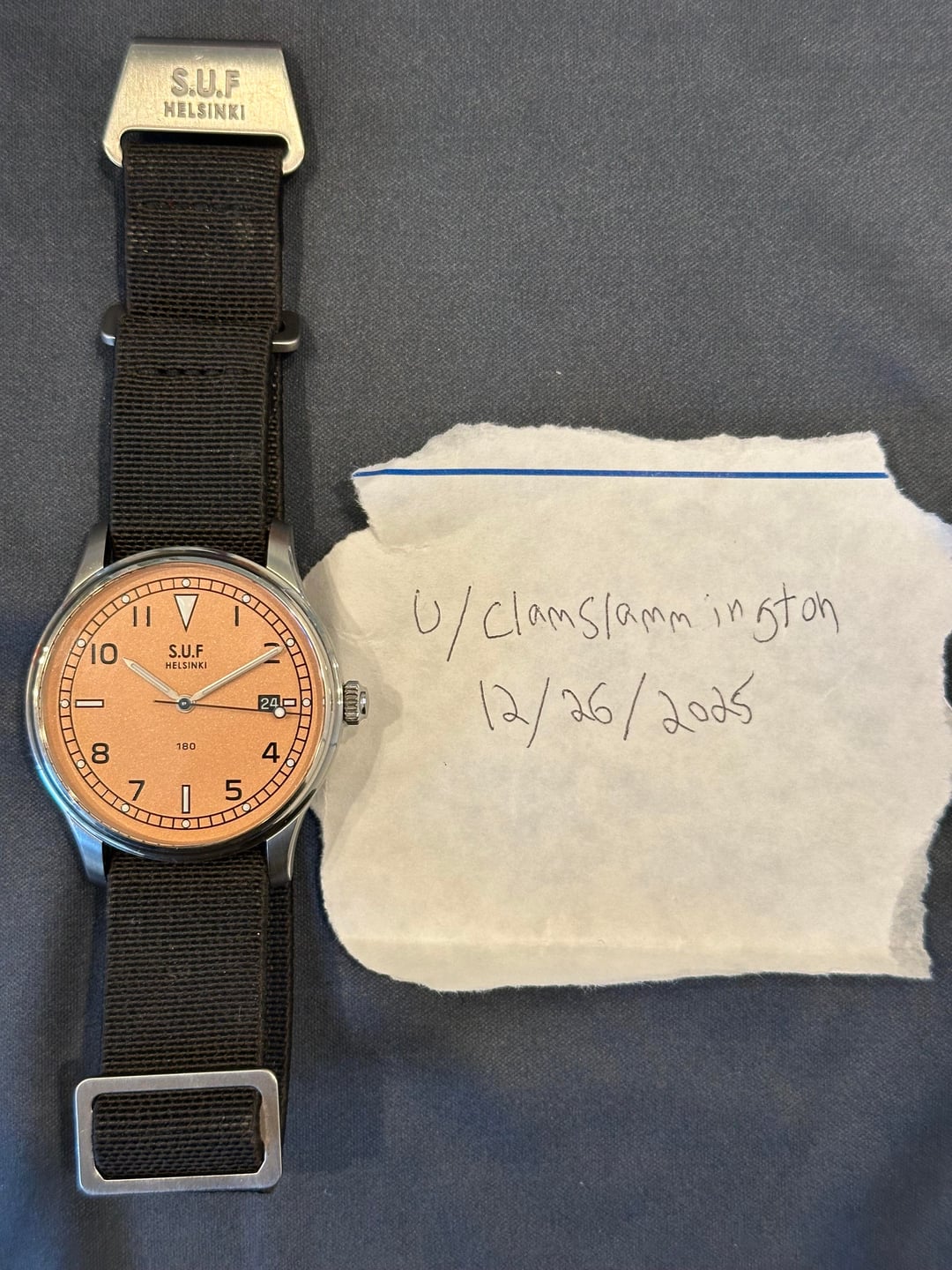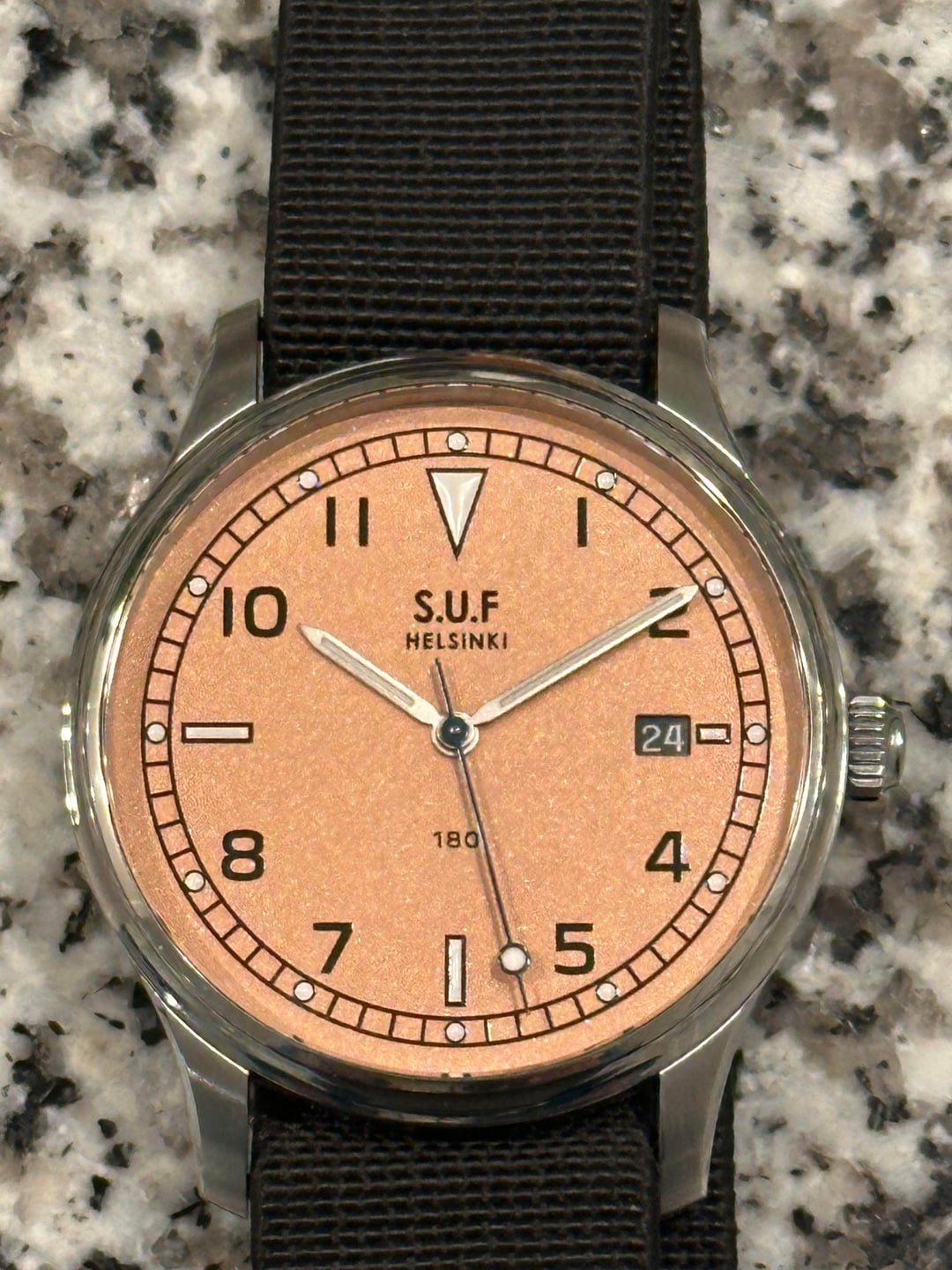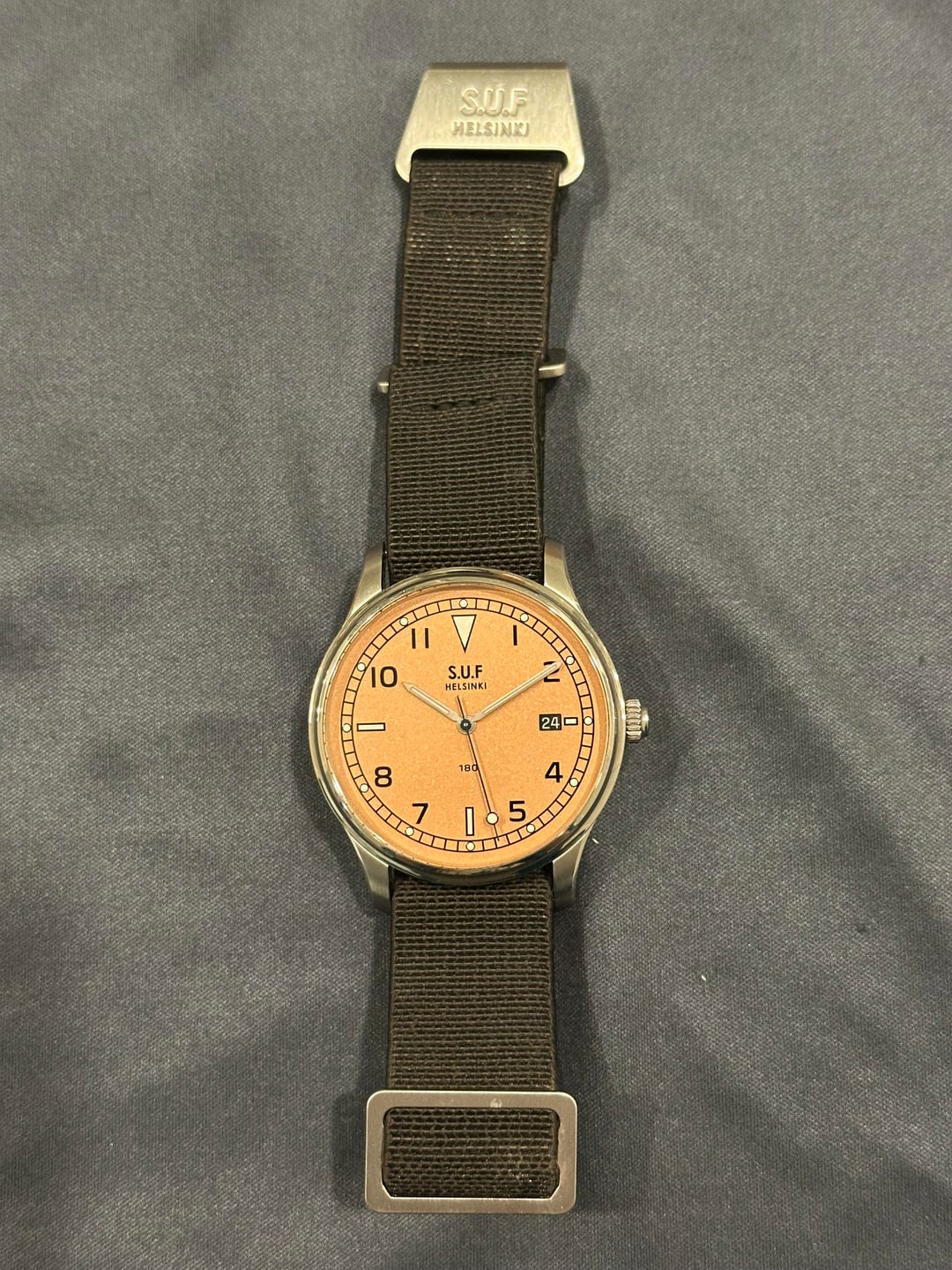Hi everyone, Today I am looking to sell my S.U.F Helsinki 180 in frosted salmon. This was a limited edition of 51. Most 180s are made in runs of 50, but this one was 51 for Stepan Sarpaneva’s 51st birthday. The dial is in the frosted salmon color, and it is really beautiful. In the sun it is sparkly and in darker conditions it is more salmon or even orange. The seconds hand is beautifully blued, as well. The watch is in great condition, in my opinion. The polished bezel is concave, so there are only minor marks from wear, presumably from rubbing on my sleeve over time. On the caseback you can see marks down the middle, these are from the MN strap. The watch runs great, no issues at all. It is water resistant to 100m. The watch comes with the original MN strap, S.U.F Nordic elk leather strap, and S.U.F leather watch pouch. I am asking $2,000, shipped, via PayPal G&S. CONUS only. Please let me know if you have any questions. Photos and timestamp: https://imgur.com/a/QpQsTaA