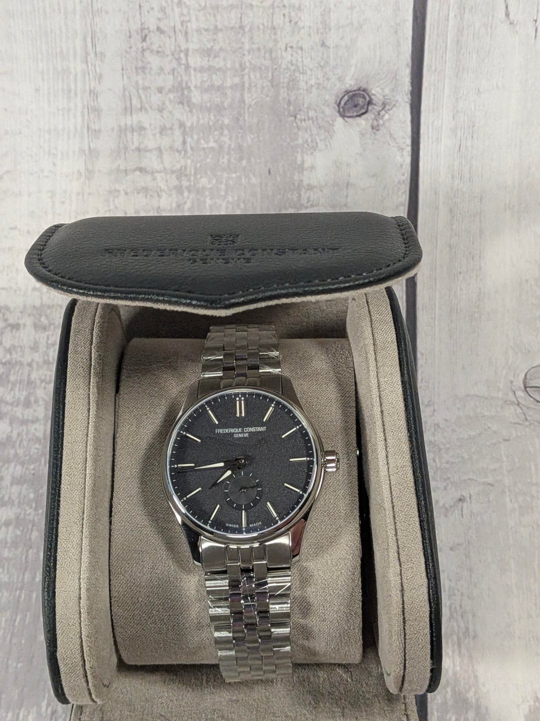 Frederique Constant Classics Index Automatic – Dark Grey Dial (Ref. FC-530G3B6B) – UNWORN / FULL SET. This is a perfect example of accessible Swiss luxury, featuring a sophisticated dark grey/black dial with a distinctive "Small Seconds" sub-dial at the 6 o'clock position. Asking $850, shipping extra, CONUS only