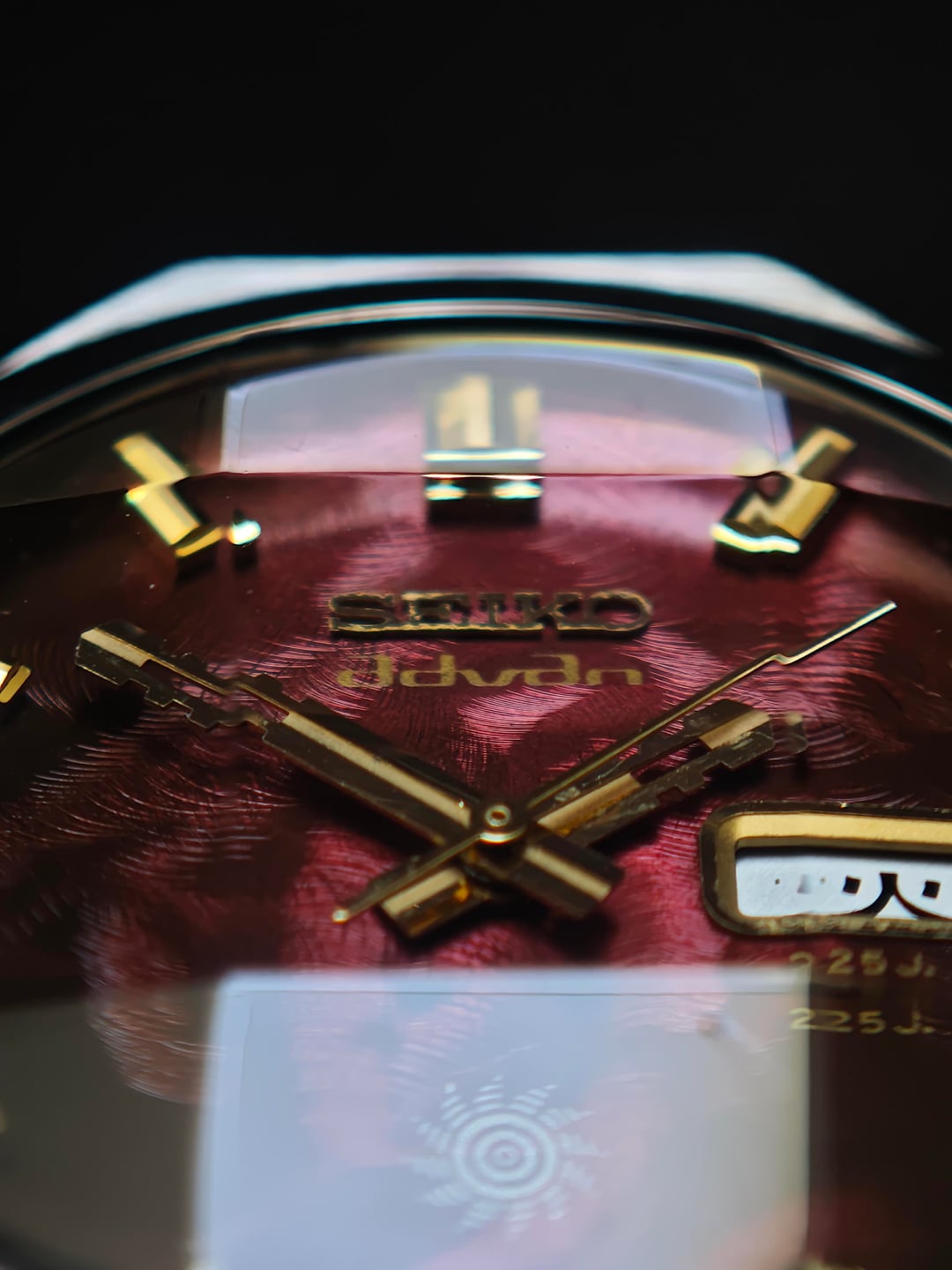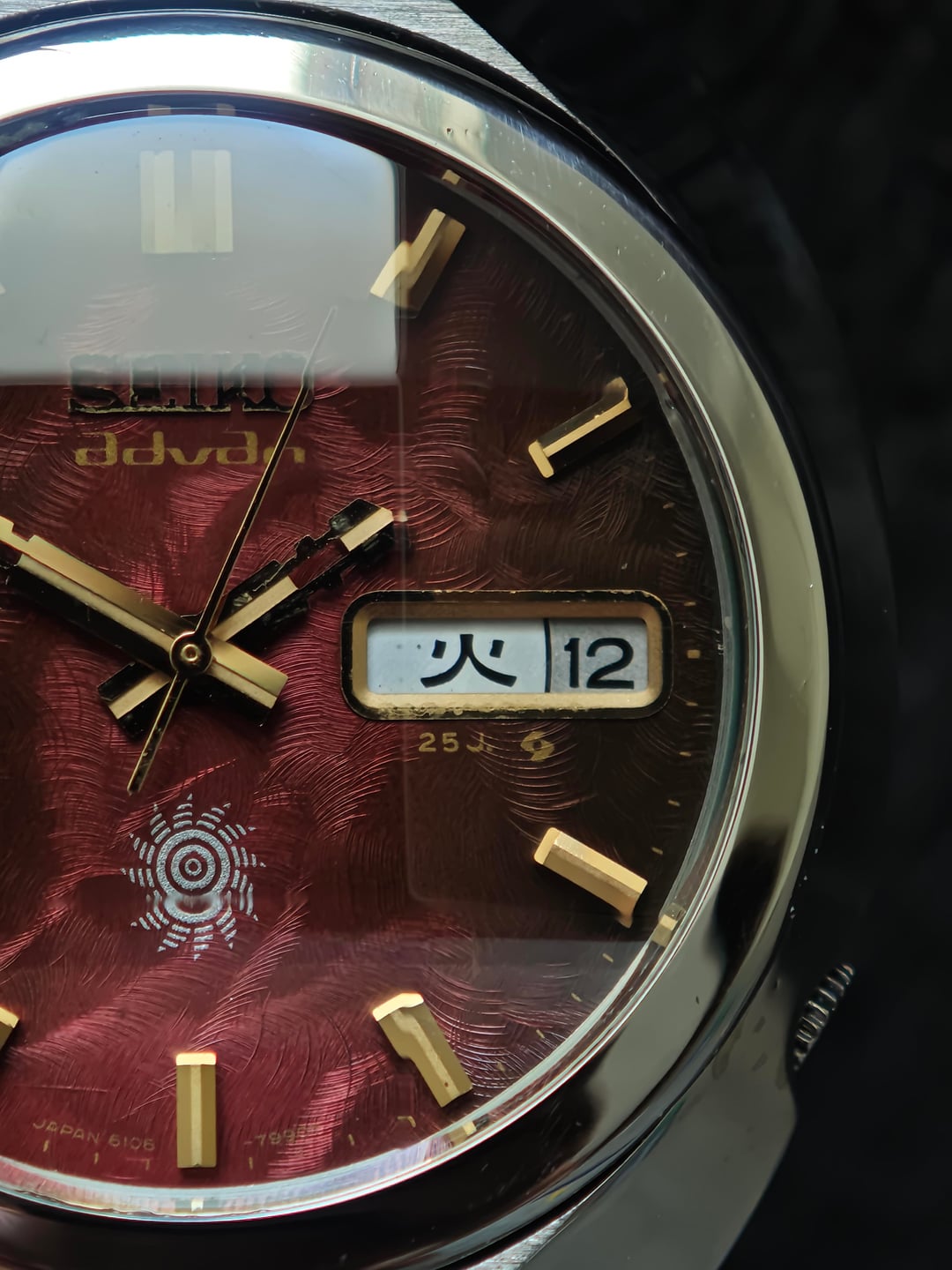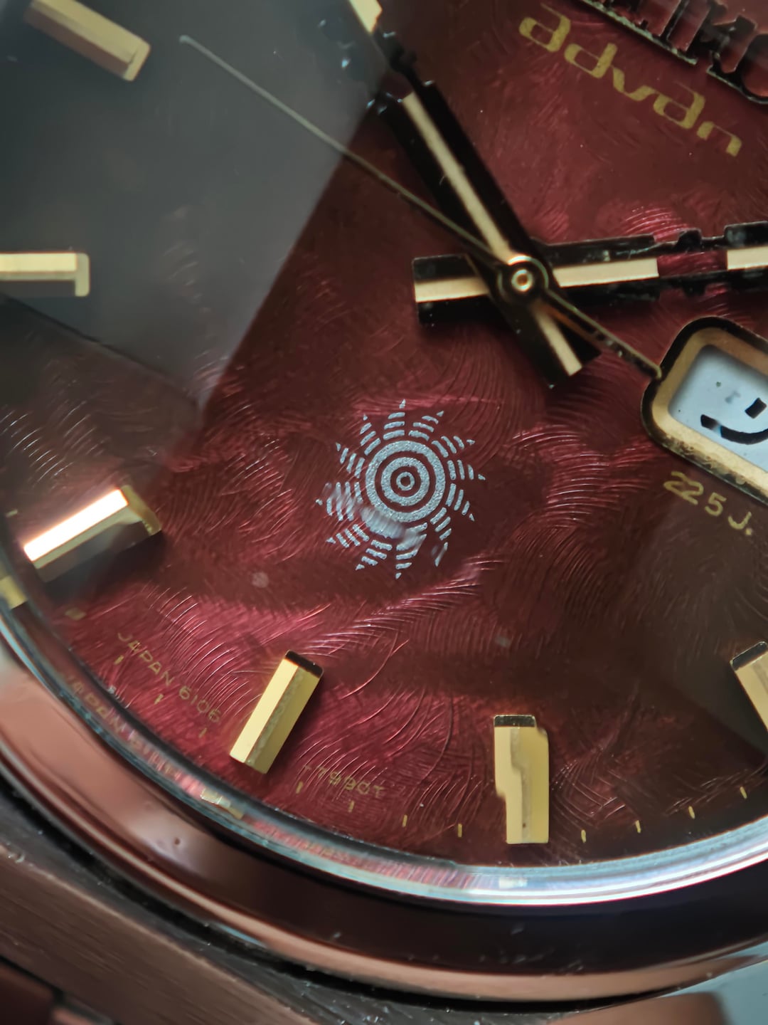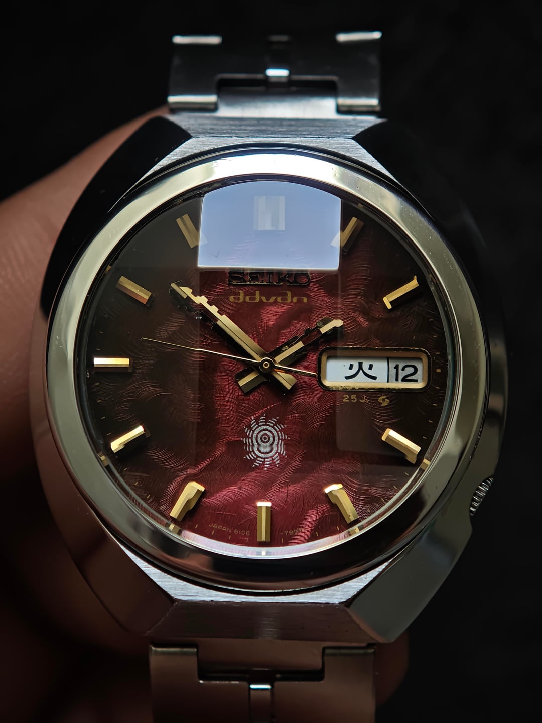 Up for sale a fiery classic from the early ’70s — the Seiko Advan “Inferno.” Deep textured red dial that shifts from ember-dark to glowing flame depending on the light. Gold baton markers, stepped Advan hands, and the sharp sunburst crest at 6 o’clock complete the look. Powered by the 6106 automatic: clean, reliable, and running strong. Case lines remain bold with that unmistakable Advan presence. Price: $600 shipped (tax duty included) Details: – 6106 automatic – Day/date quickset – Textured red “Inferno” dial – Gold indices + Advan hands – Excellent overall condition A standout piece from one of Seiko’s most expressive early-’70s lines. Let me know if you need more pics or wrist shots.