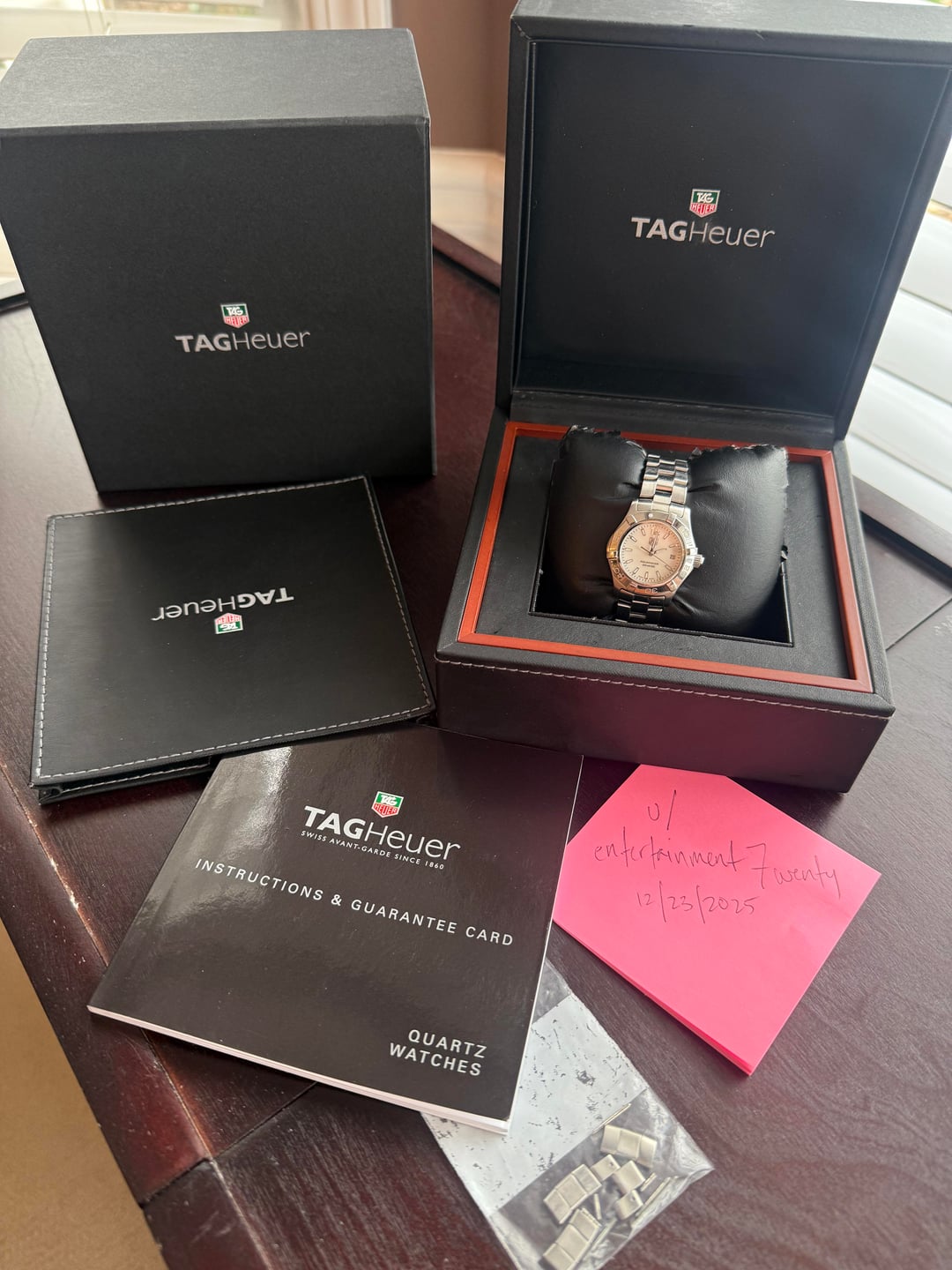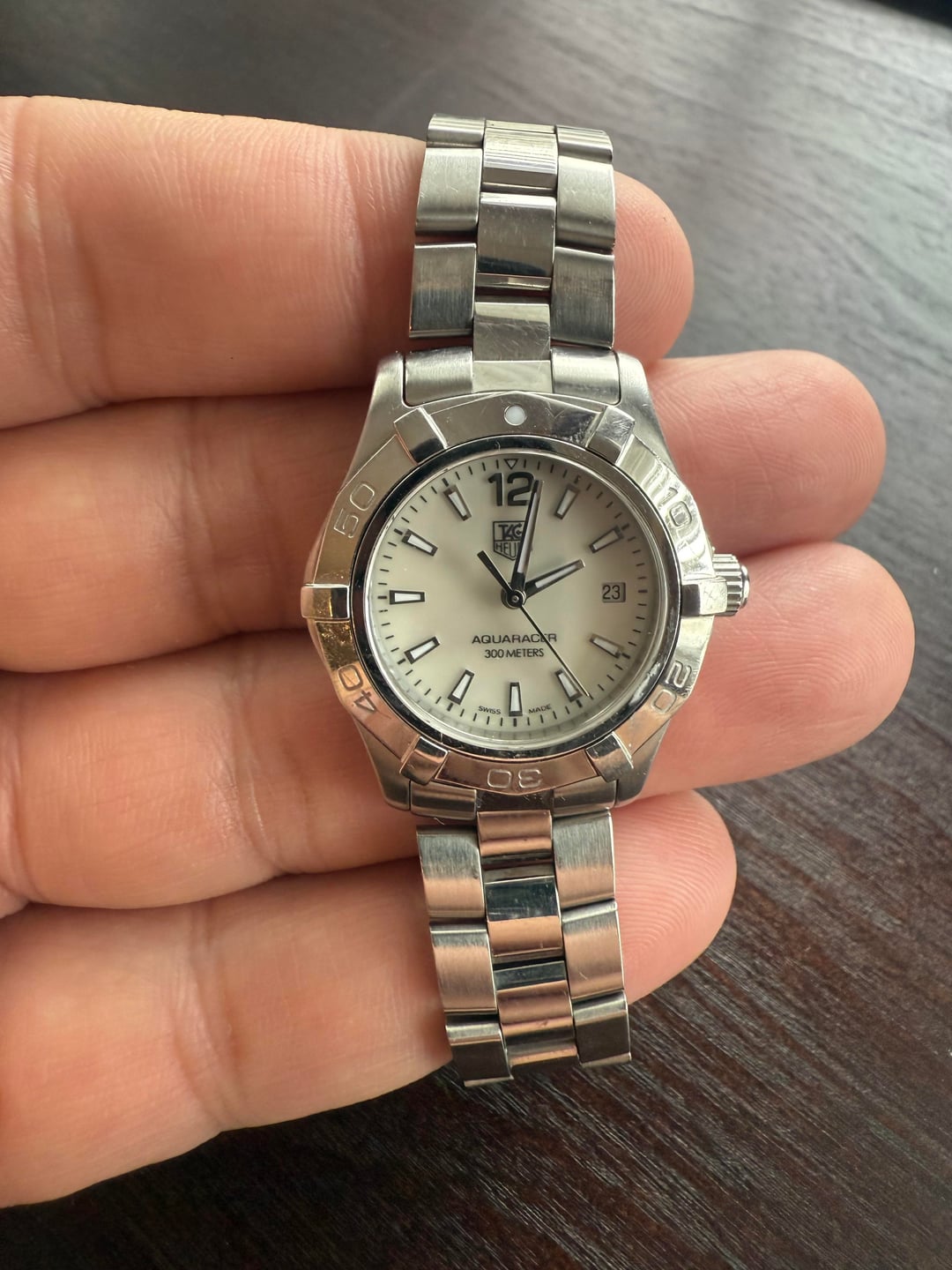 Up for a sale is a Tag Heuer WAF1414 Aquaracer 200m women's quartz 27mm watch with the mother of pearl dial. Watch is definitely used but is running well. Sale includes outer box, inner box, booklet, and all links. Asking $249 OBO ~~$299~~ via PayPal F&F or Zelle and includes CONUS shipping. Not looking for trades on this one. Please post a comment here before messaging or I likely will not respond. Happy to share any additional pics or timestamps for anyone interested. Thanks for looking!
