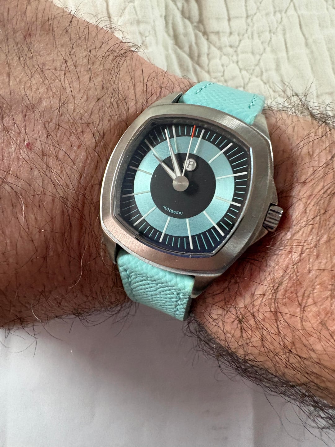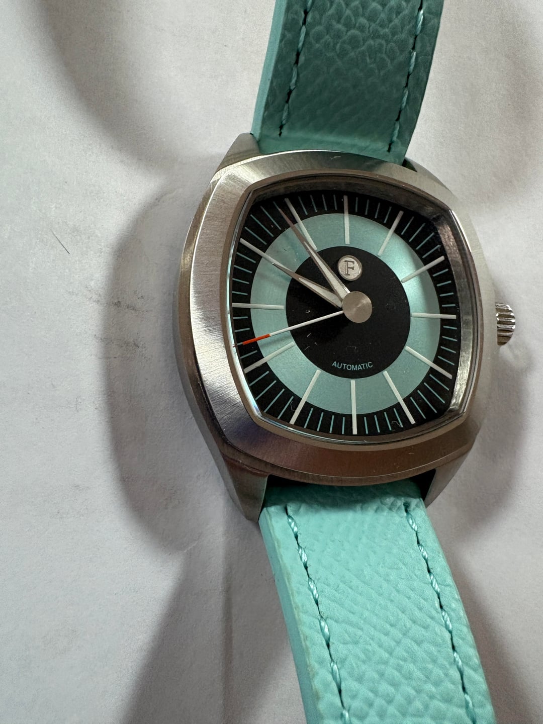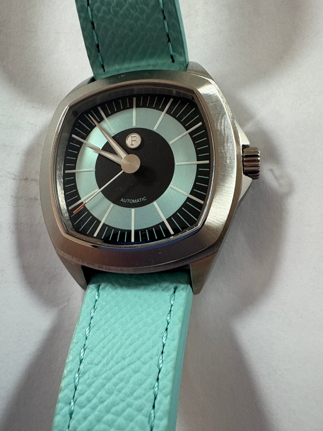 I am continuing posting really great and unusual watches with this Ferro & Company Watch Time Master 70's watch. This is a brushed stainless steel TV shape watch, in the long sold out blue dial Wonderful groovy 70's style stick indices adorn the dial. The sweep hand tip is orange, the lume is great and the bracelet has those 70's vibes as well. However, the bracelet was not worn with this watch, so it remains new. I wore this watch a few times around the house on this Tiffany Blue Strapsco strap that really compliments the watch a lot. It is also included in the sale. This is a full kit, with full factory warranty. Doubtful you'd need it with the uber reliable Miyota 9039 movement. 39mm case diameter, 47mm lug to lug, 11mm height. Sapphire crystal with AR coating. Screw down crown helps insure the 100m water resistance. Retail of $685.00 plus tariff's when available. Get this as new model for substantially less. Best reasonable cash offers considered. No trades please. Thanks for looking. Please se my other watches for sale.