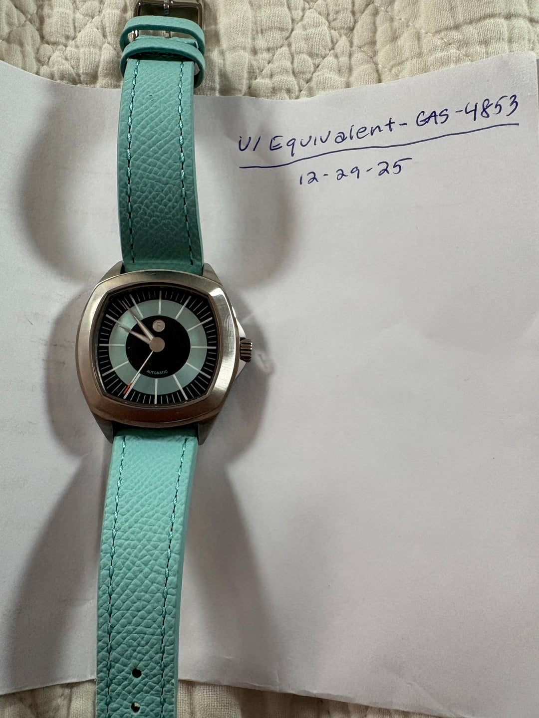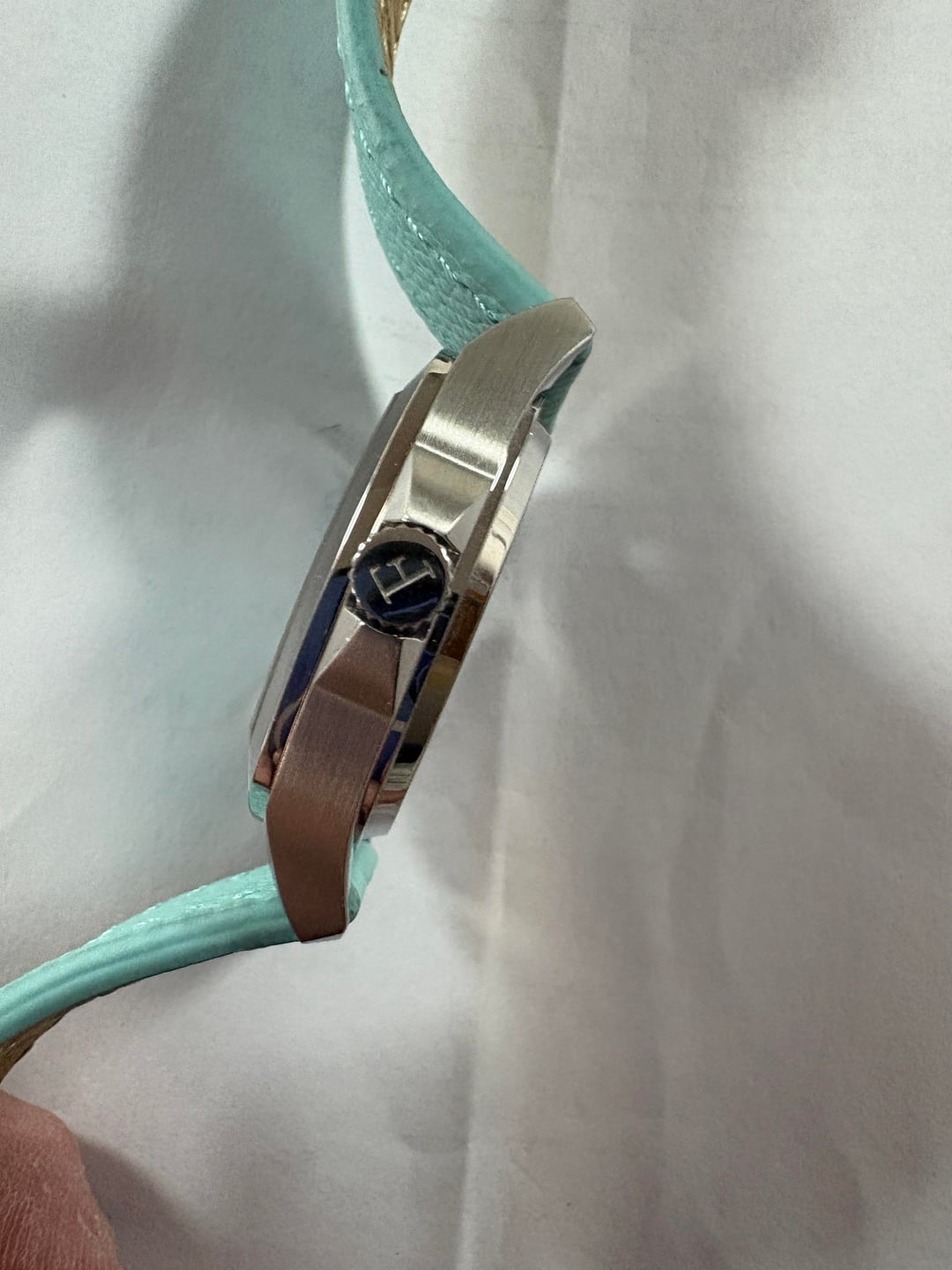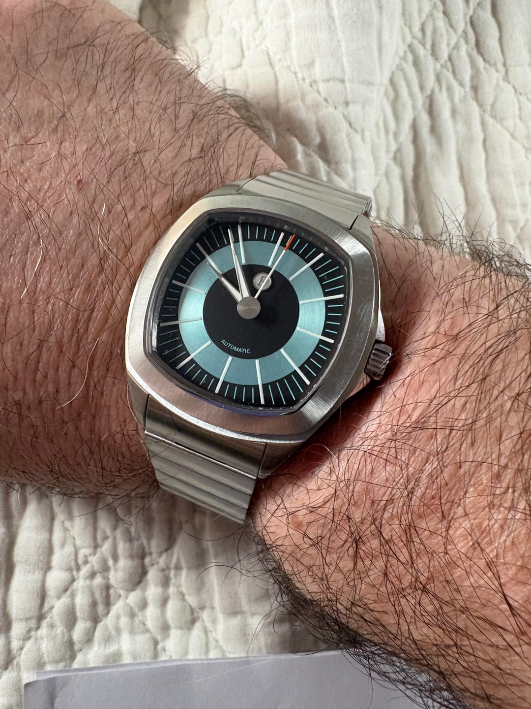 I am continuing posting really great and unusual watches with this Ferro & Company Watch Time Master 70's watch. This is a brushed stainless steel TV shape watch, in the long sold out blue dial Wonderful groovy 70's style stick indices adorn the dial. The sweep hand tip is orange, the lume is great and the bracelet has those 70's vibes as well. However, the bracelet was not worn with this watch, so it remains new. I wore this watch a few times around the house on this Tiffany Blue Strapsco strap that really compliments the watch a lot. It is also included in the sale. This is a full kit, with full factory warranty. Doubtful you'd need it with the uber reliable Miyota 9039 movement. 39mm case diameter, 47mm lug to lug, 11mm height. Sapphire crystal with AR coating. Screw down crown helps insure the 100m water resistance. Retail of $685.00 plus tariff's when available. Get this as new model for substantially less. Best reasonable cash offers considered. No trades please. Thanks for looking. Please se my other watches for sale.