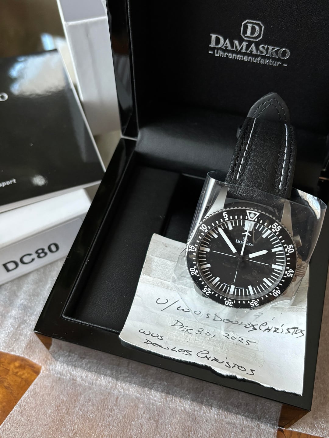 \[WTS\] Damasko DC80 on Leather Strap Nov 2025 Bracelet Option Asking $2050 via Zelle but can do PP Friends & Family or Venmo equivalent. Price includes insured CONUS (only) shipping. Expect funds to clear prior to shipping. In like brand new condition. Couldn't find any marks on it. Originally bought new Nov 2025. Why sell? Actually got another DC80 in a trade after I picked this up. Don't need two. Love the watch and use the central second counting function all the time. Bracelet available (minor signs of wear and no tool) for another four hundred. Specs per web site: The DC80 is a new chronograph based on the DAMASKO chronograph caliber C51 that is a standout in the DC8X series. The main criterion of this new design was to significantly increase the ease of readability of the chronograph functions. Damasko focused on the creation of a 60 stop-minute display that reads from the center of the dial (as opposed to a 60-minute sub-dial). Thanks to this new patented design, it is possible to record stop times more easily, accurately and quickly. It offers two key advantages: 60 minutes, instead of the usual 30 minutes, are counted in a hand revolution, and the allocated minute-stop scale can be seen across the full face diameter of the watch. The DC80 has a 42mm (43.3mm overall with bezel) ice-hardened stainless steel case, a screw-down crown, and a robust screw-in case back. The hands and hour markers are treated with SuperLuminova X1 GL C1 white 10 luminous material. It comes on a padded black leather strap with contrasting white and green stitching. Powering the watch is the new C51-1 movement with 48 hours of power reserve. Flat, AR Sapphire crystal provides a clear view of the time. Product Features Movement:C51-1 automatic (self-winding) * Case:Stainless steel, 42mm (43.8mm with bezel) x 13.9mm thick. 50mm tip to tip * Back:Screw-in * Crystal:Anti-Reflective Sapphire * Band:Black leather strap with white and green stitching, 22mm * Water Resistant:100 meters * Warranty:2 Years from Nov 2025 Thanks for looking